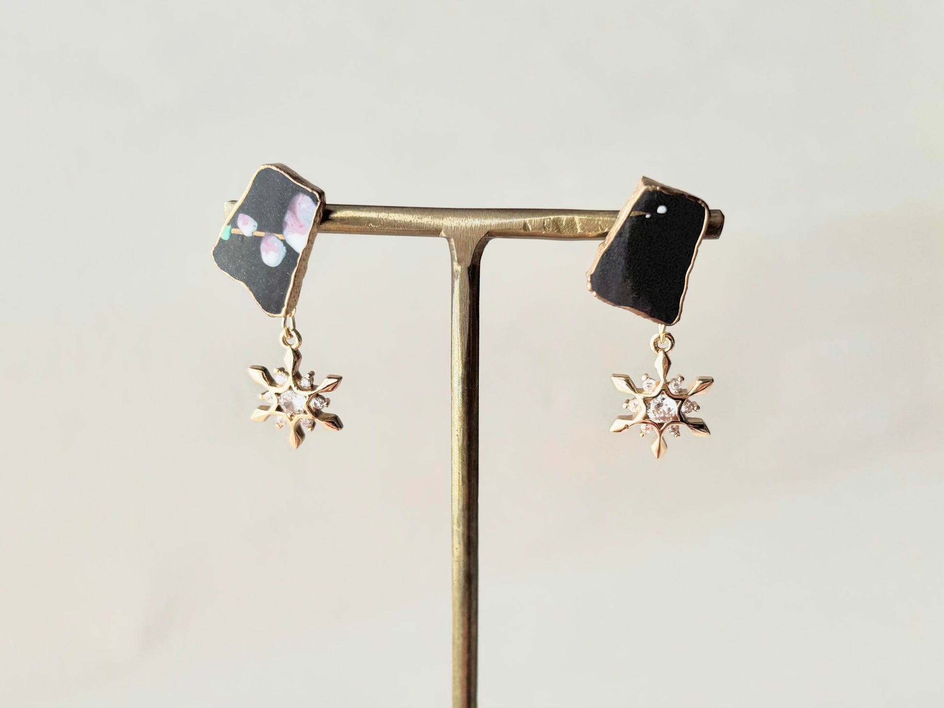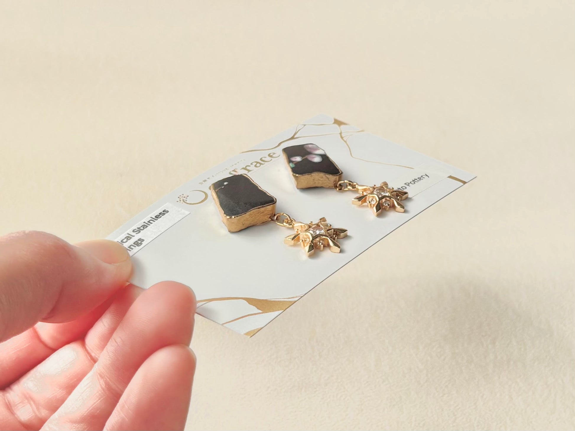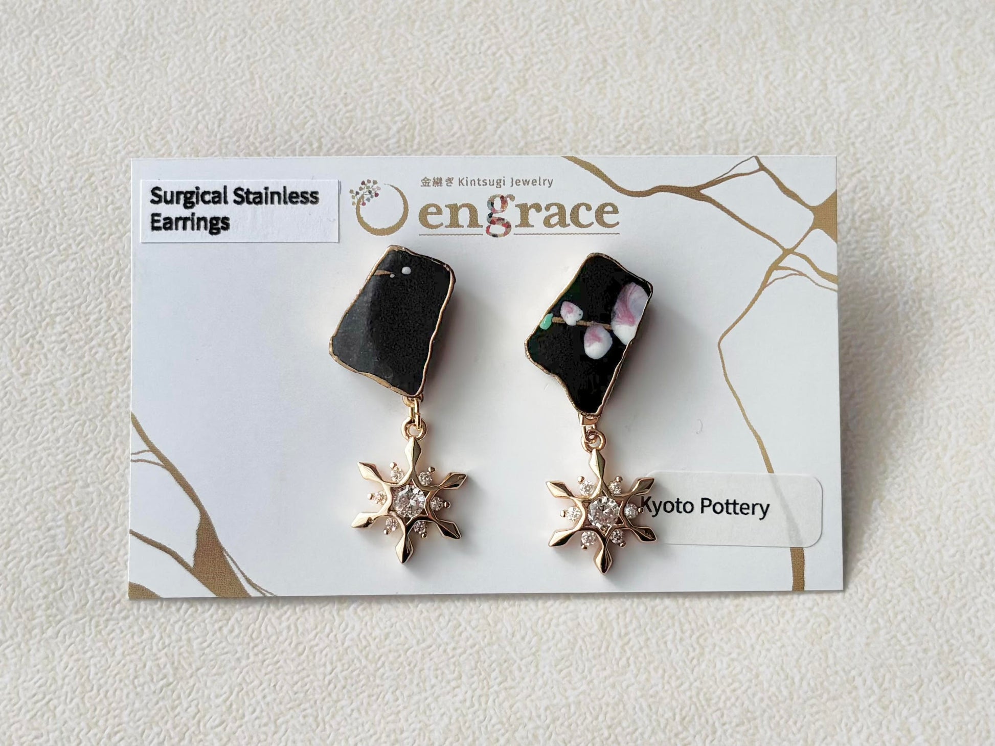 京焼  金継ぎ サージカルステンレスピアス 手書き 絵付け 花柄 黒 伝統工芸 #391