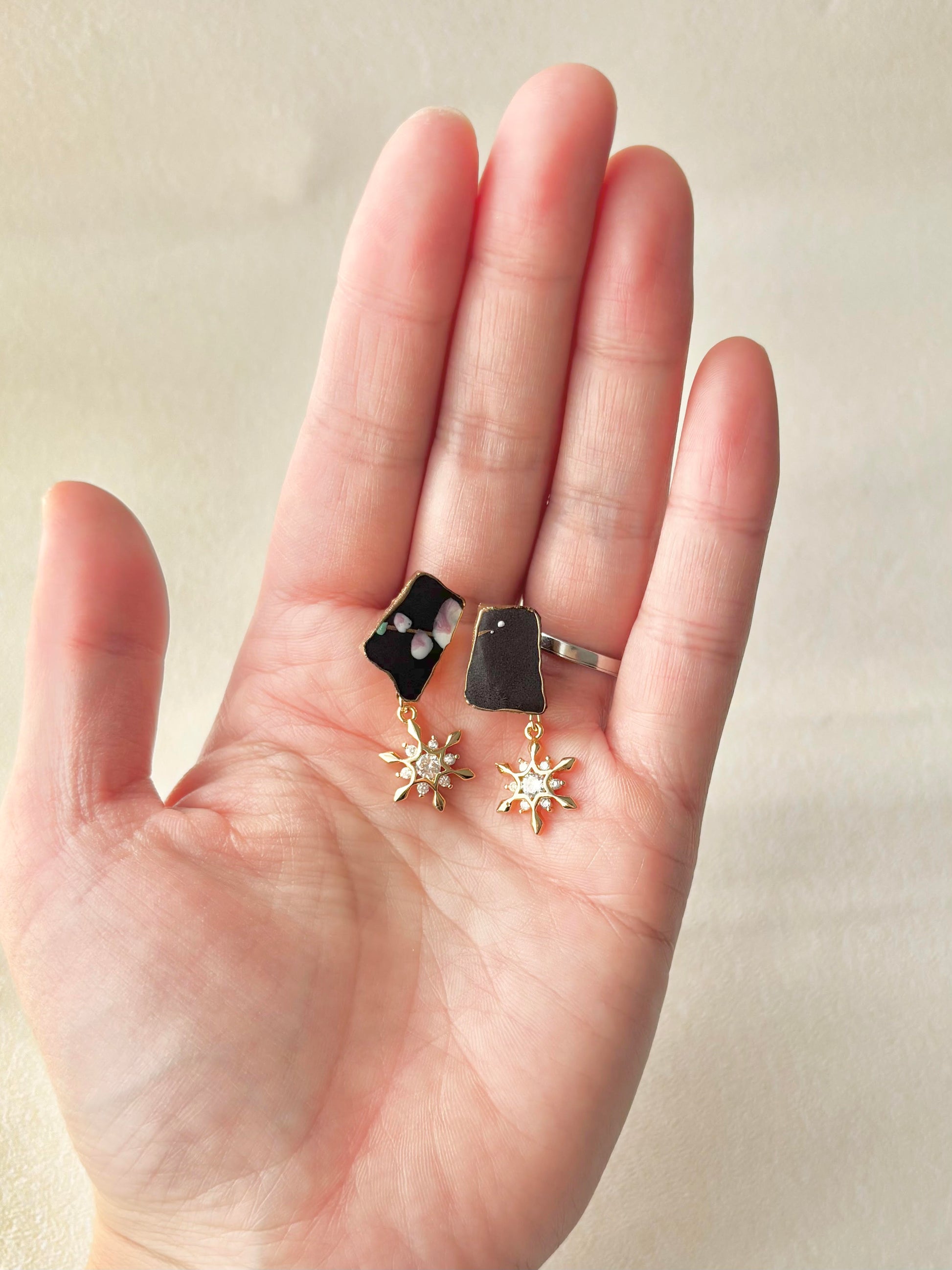 花柄の手書きの絵付けがされた上品な陶片に結晶の形のようなパーツを合わせました。