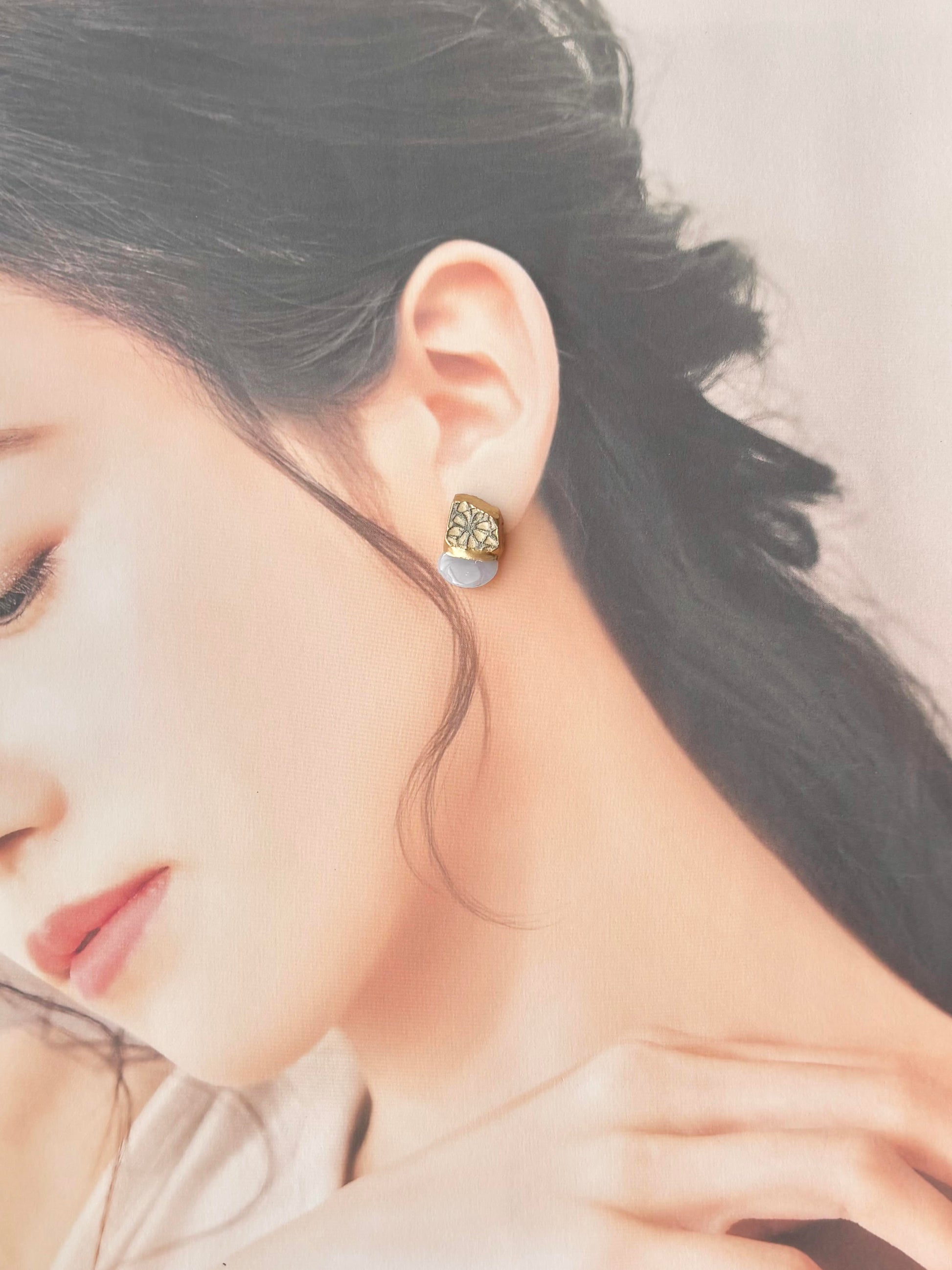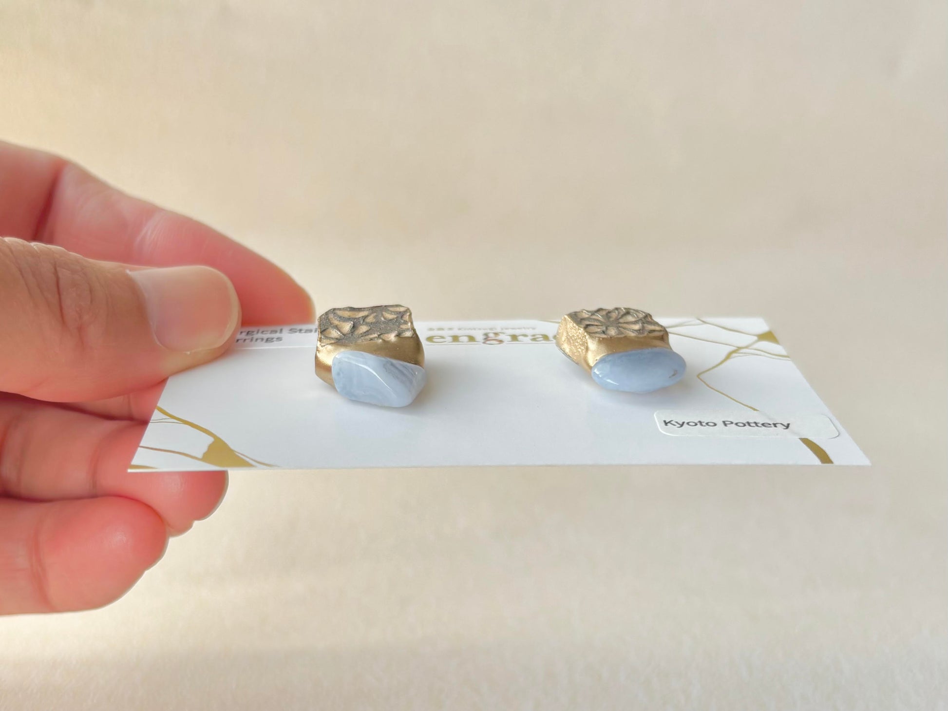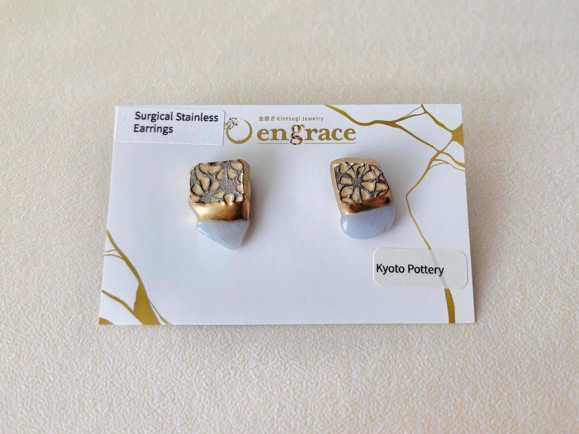 京焼  金継ぎ サージカルステンレスピアス 花柄 グレー ブルーレースアゲート 天然石 伝統工芸 #371