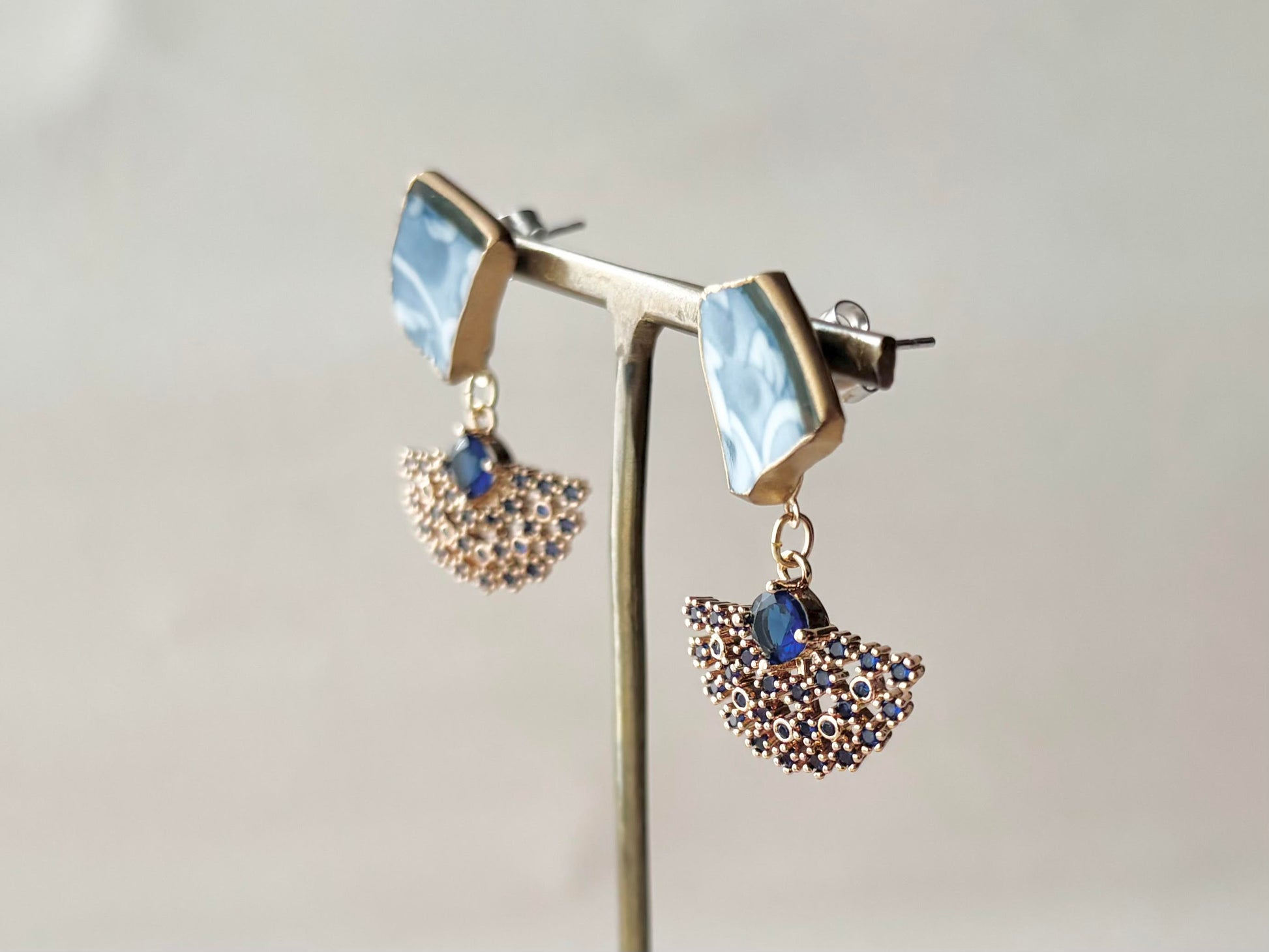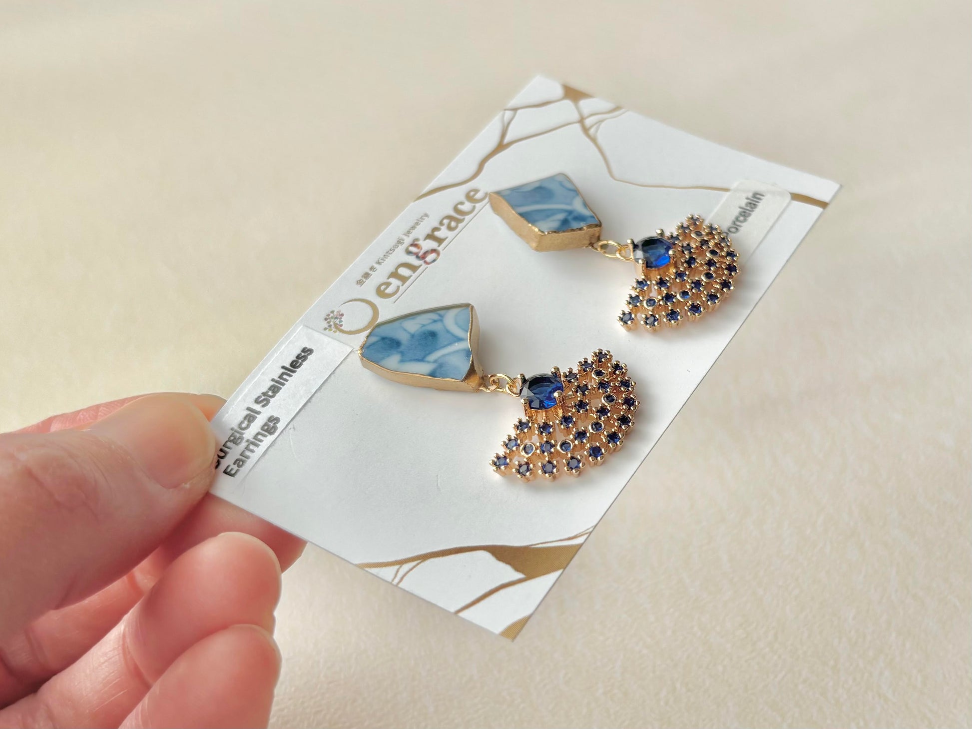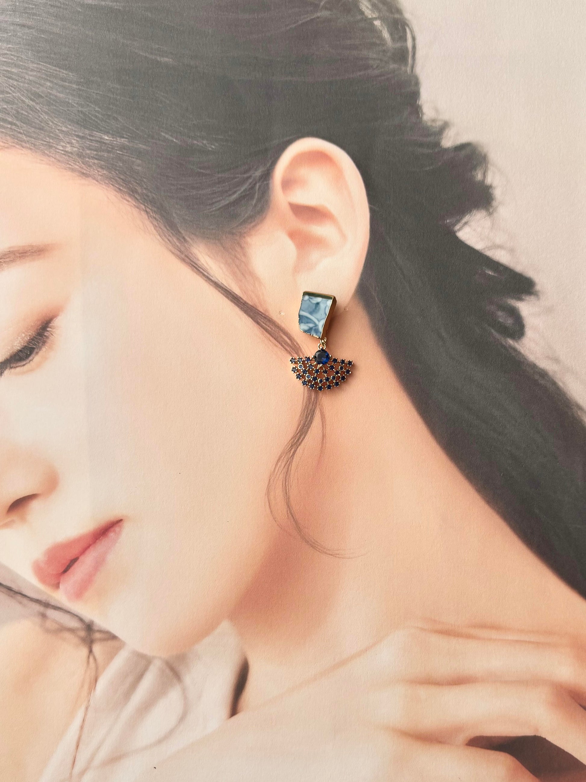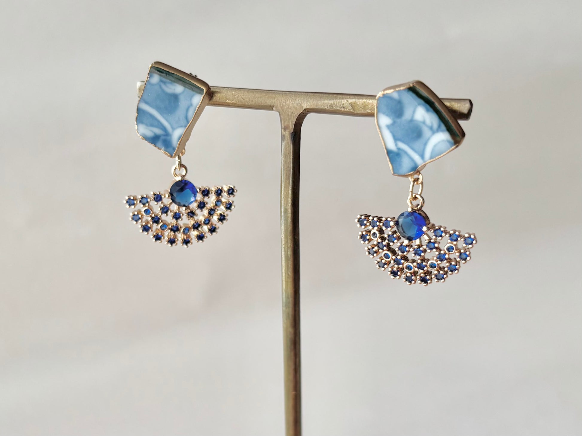 青色の上品な陶片に扇型のサファイヤブルーのクリスタルチャームを合わせました。