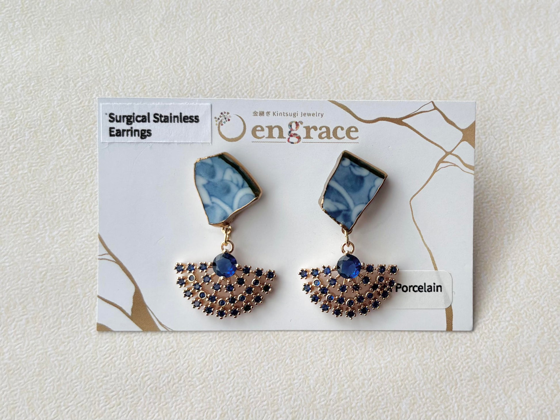 有田焼  金継ぎ サージカルステンレスピアス 青 和柄 揺れる 伝統工芸 #388