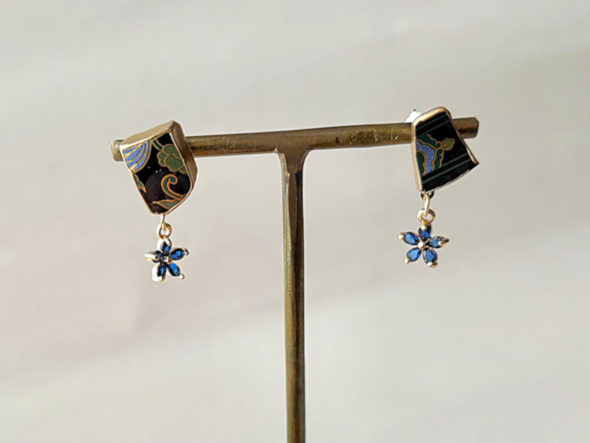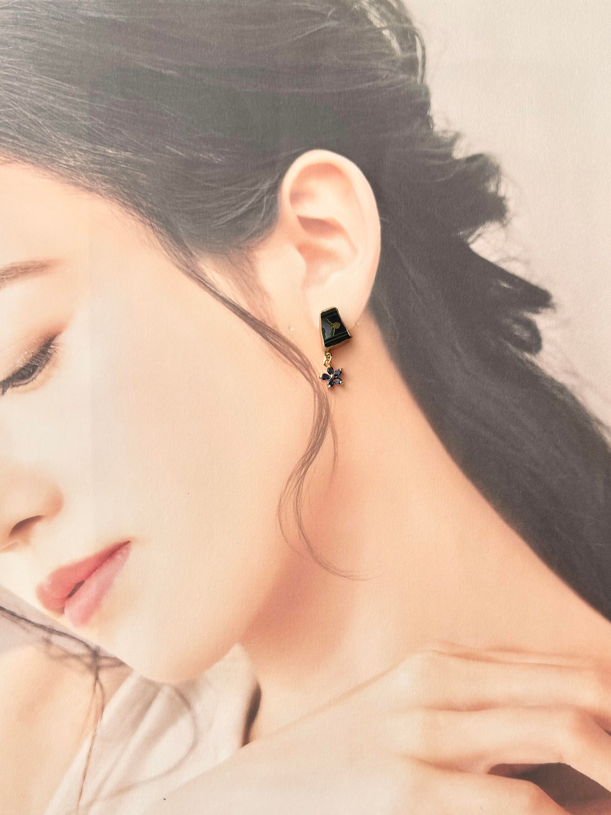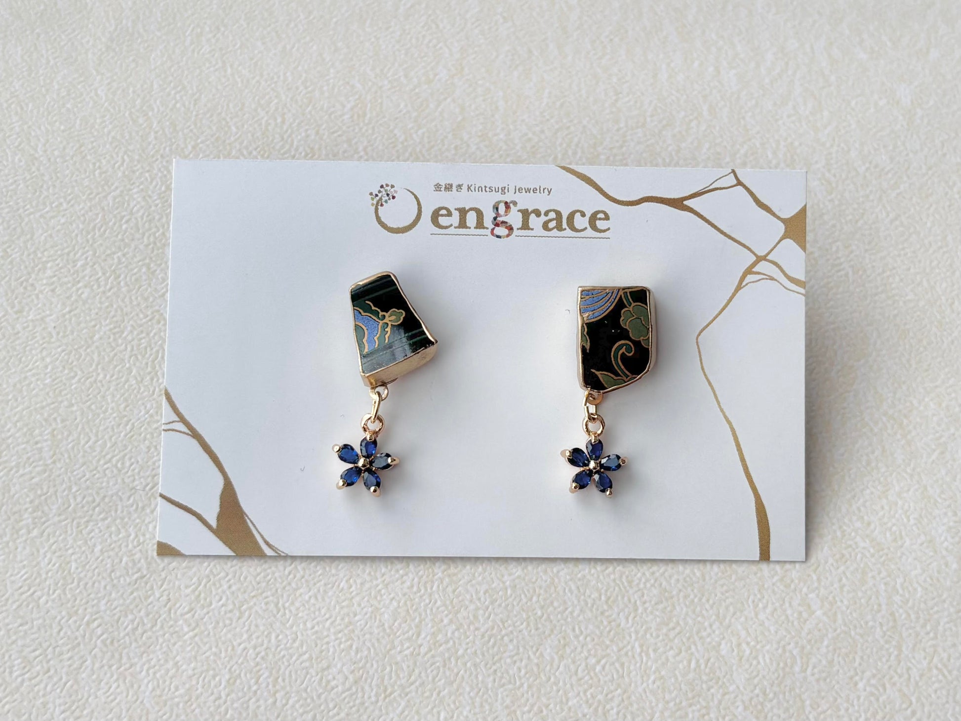 和柄が描かれた黒色の陶片に青い花のチャームを合わせました。