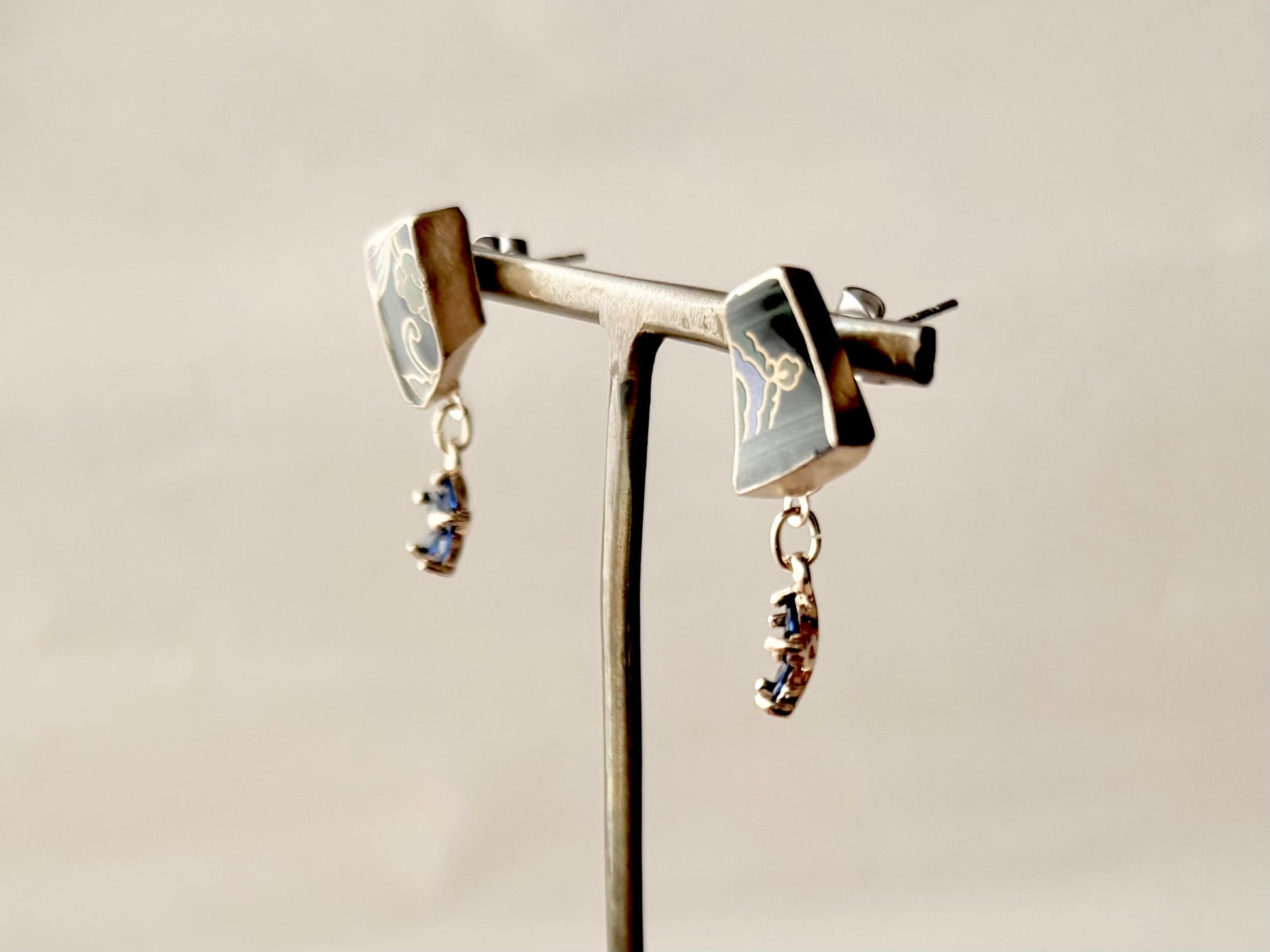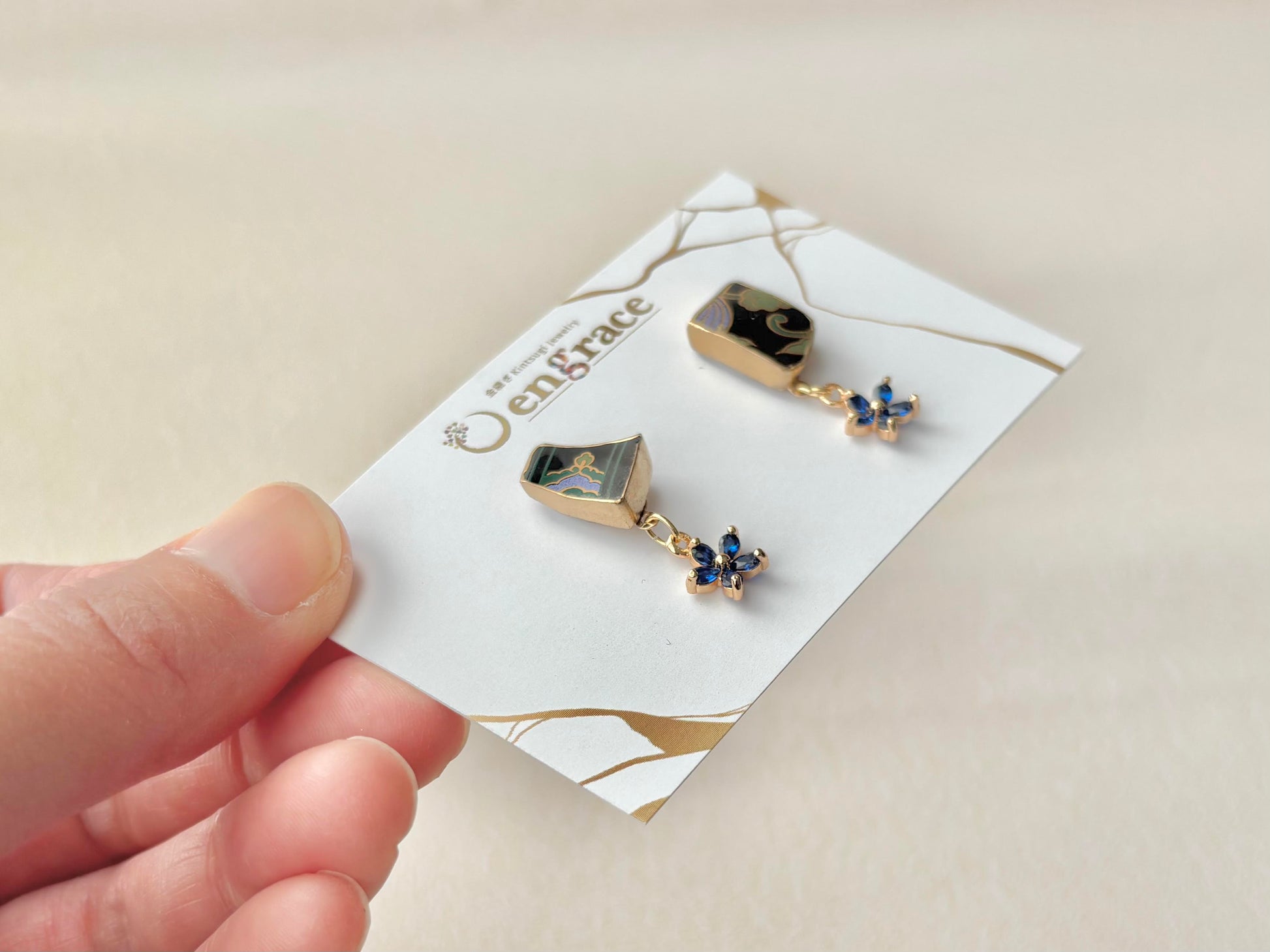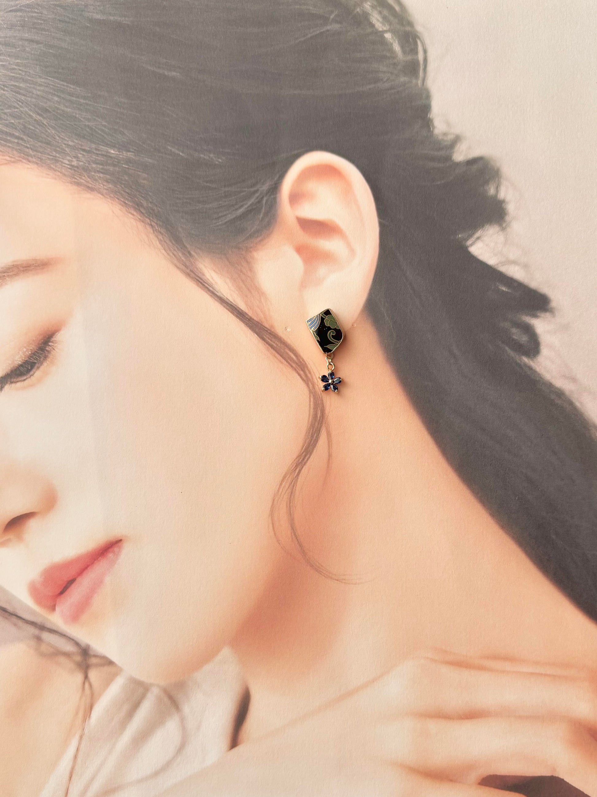 和柄が描かれた黒色の陶片に青い花のチャームを合わせました。