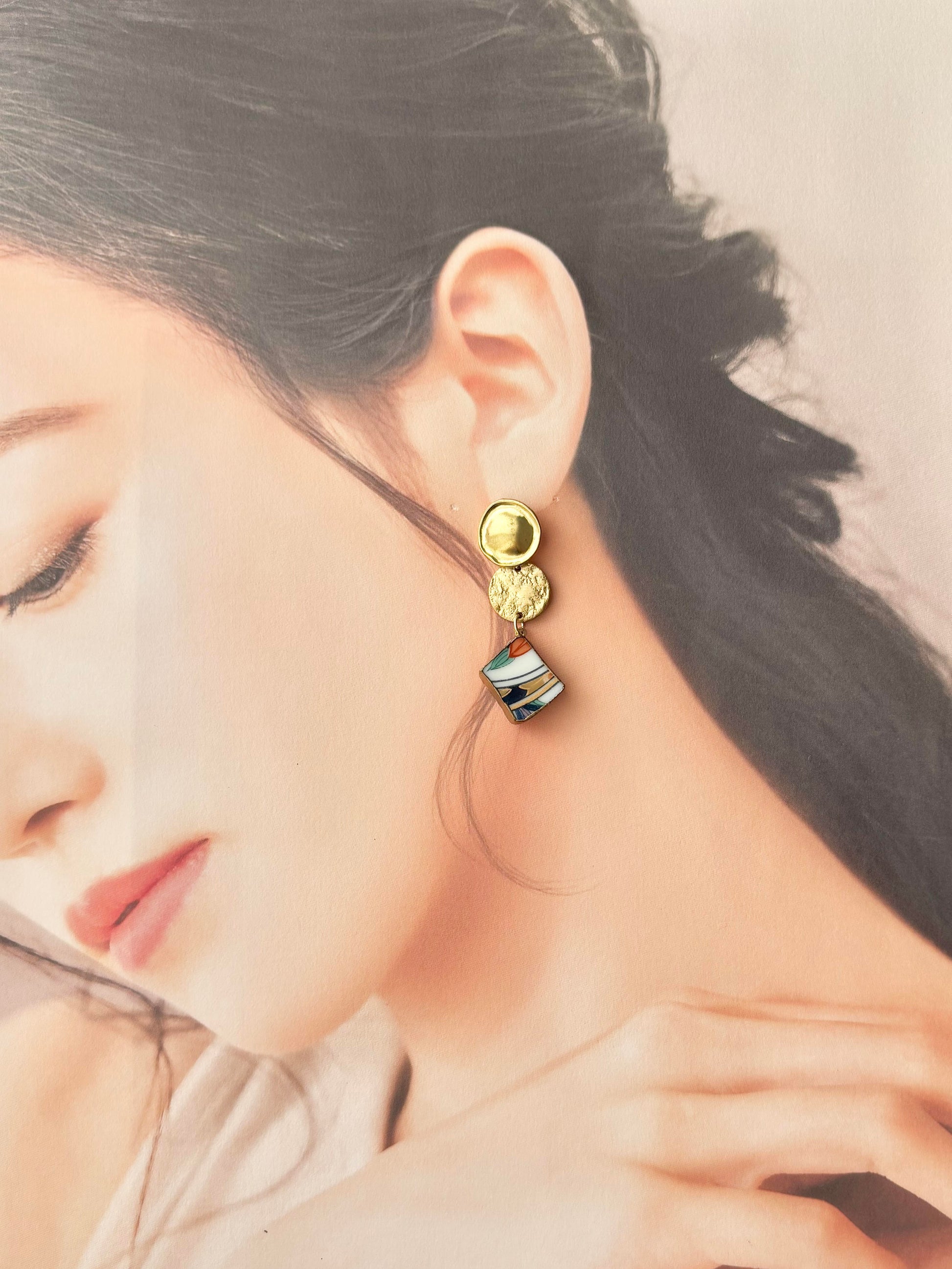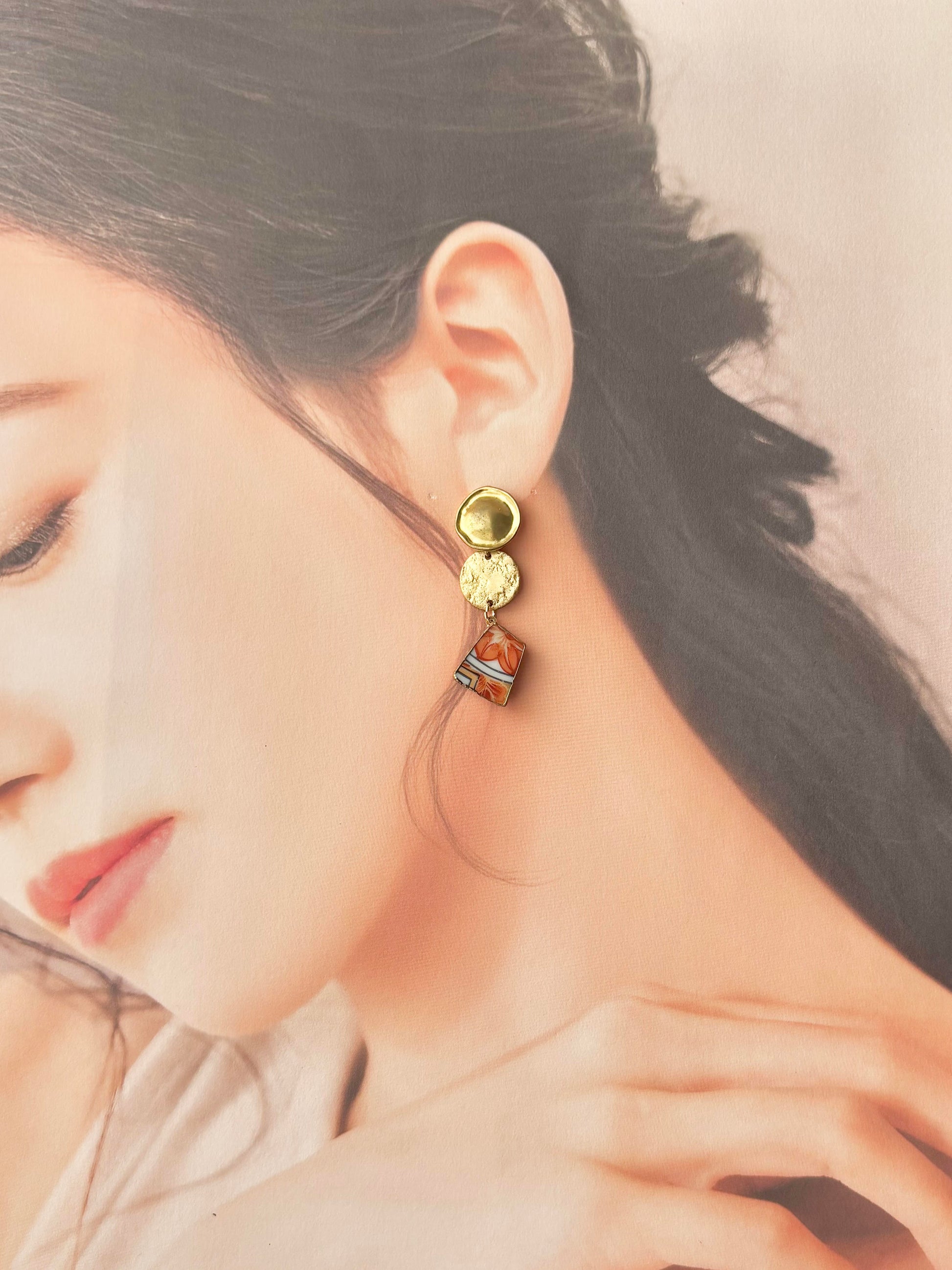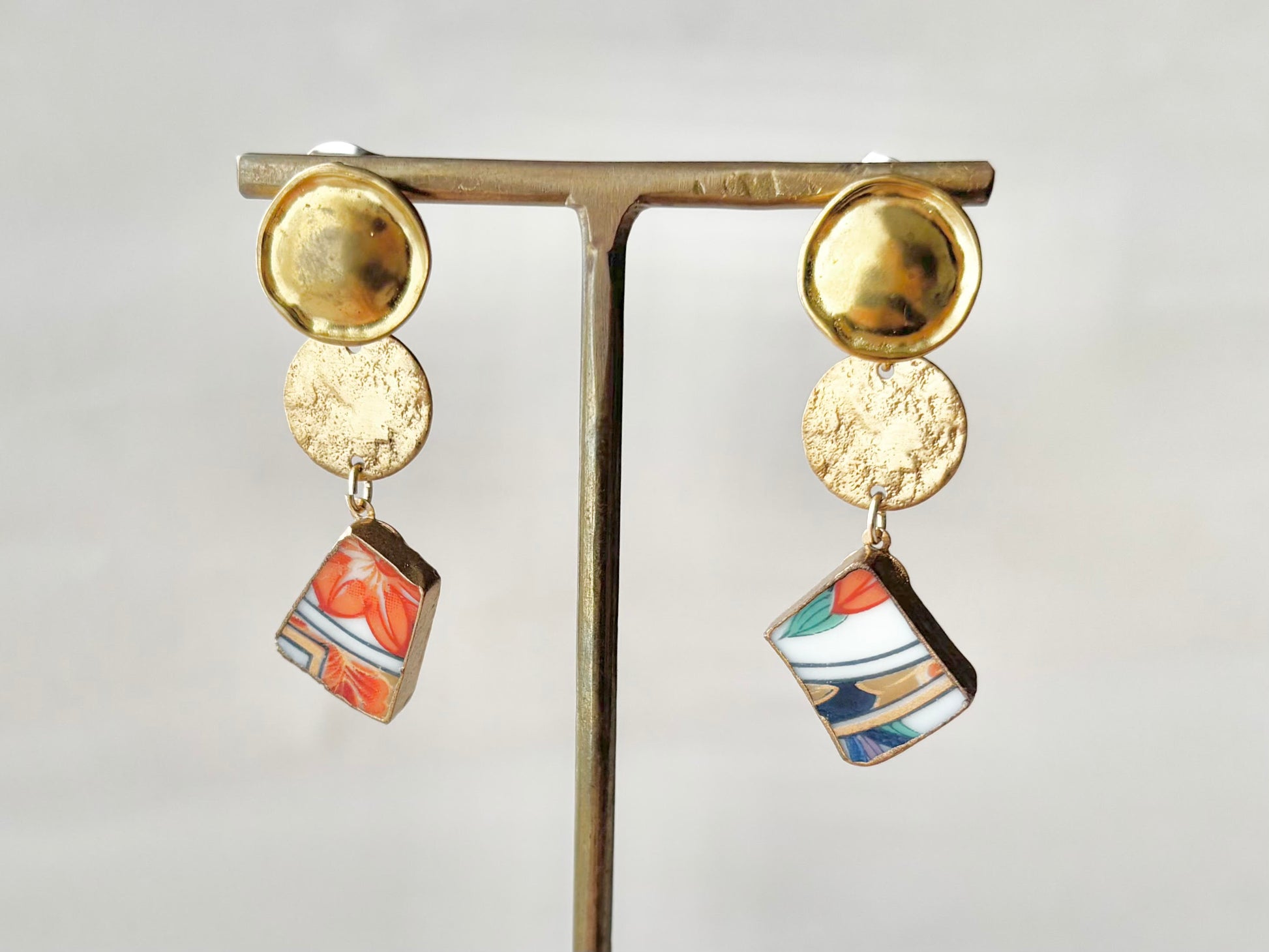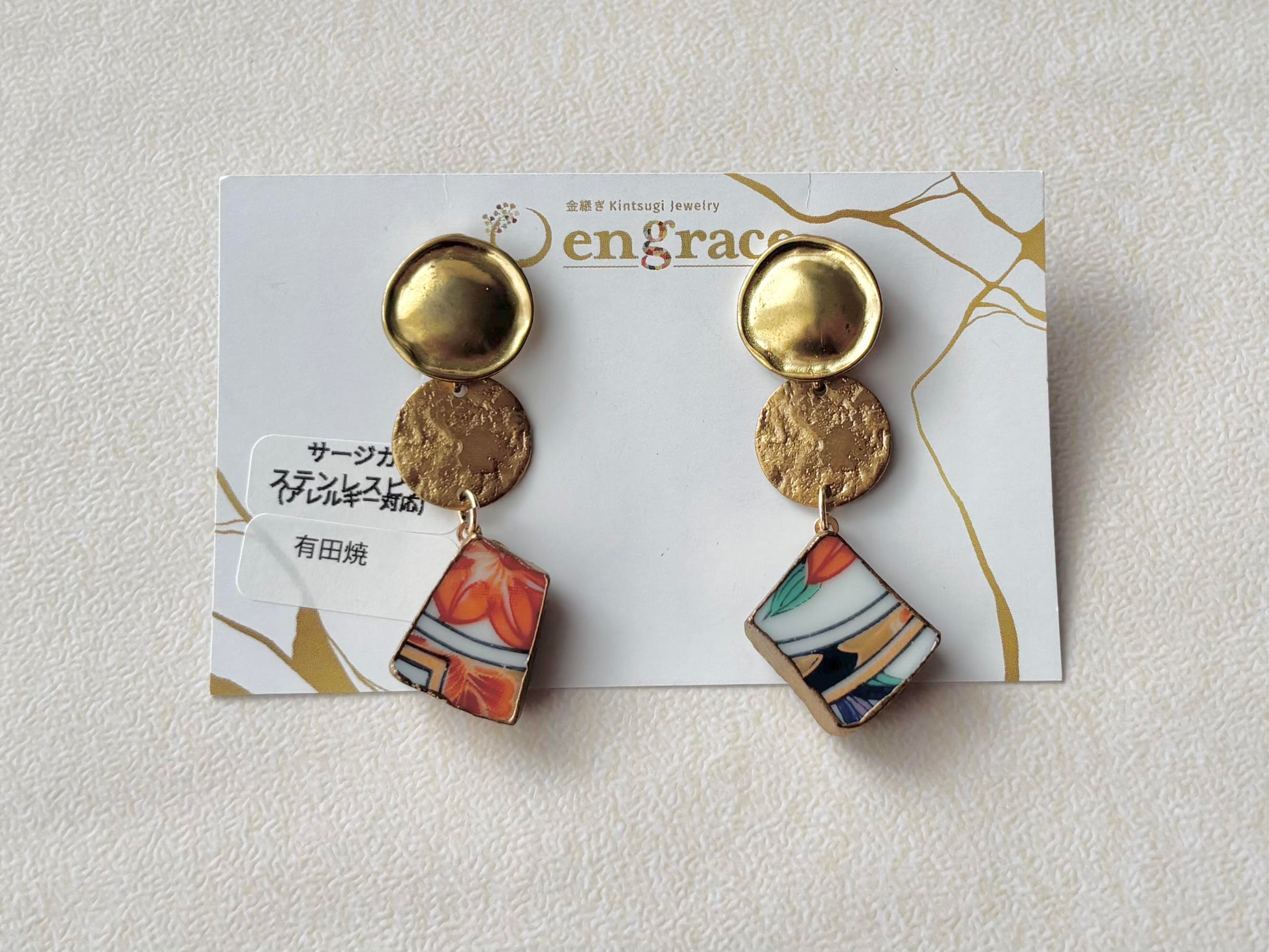有田焼  金継ぎ サージカルステンレスピアス オレンジ 花柄 リーフ柄 揺れる 伝統工芸 #387