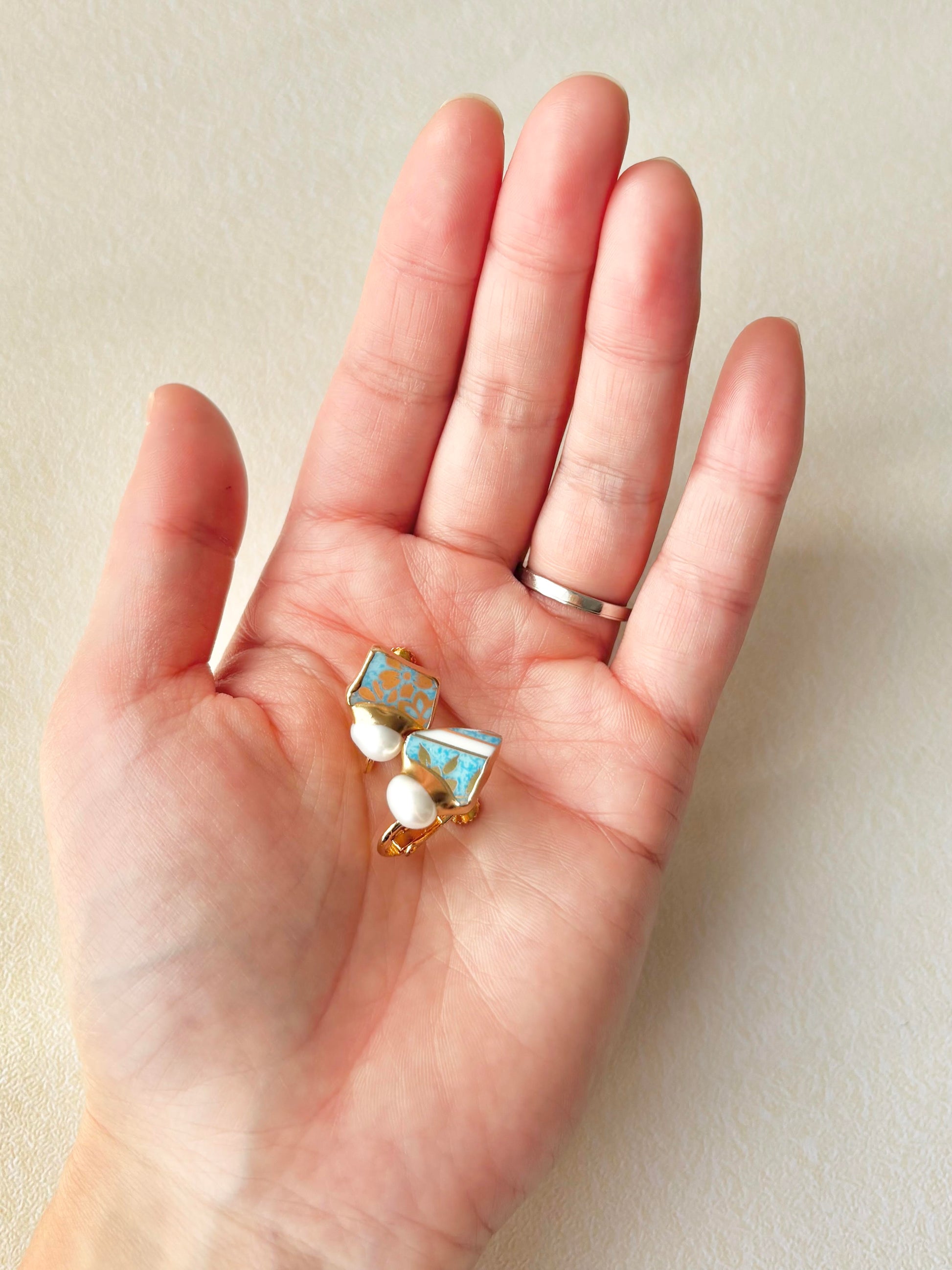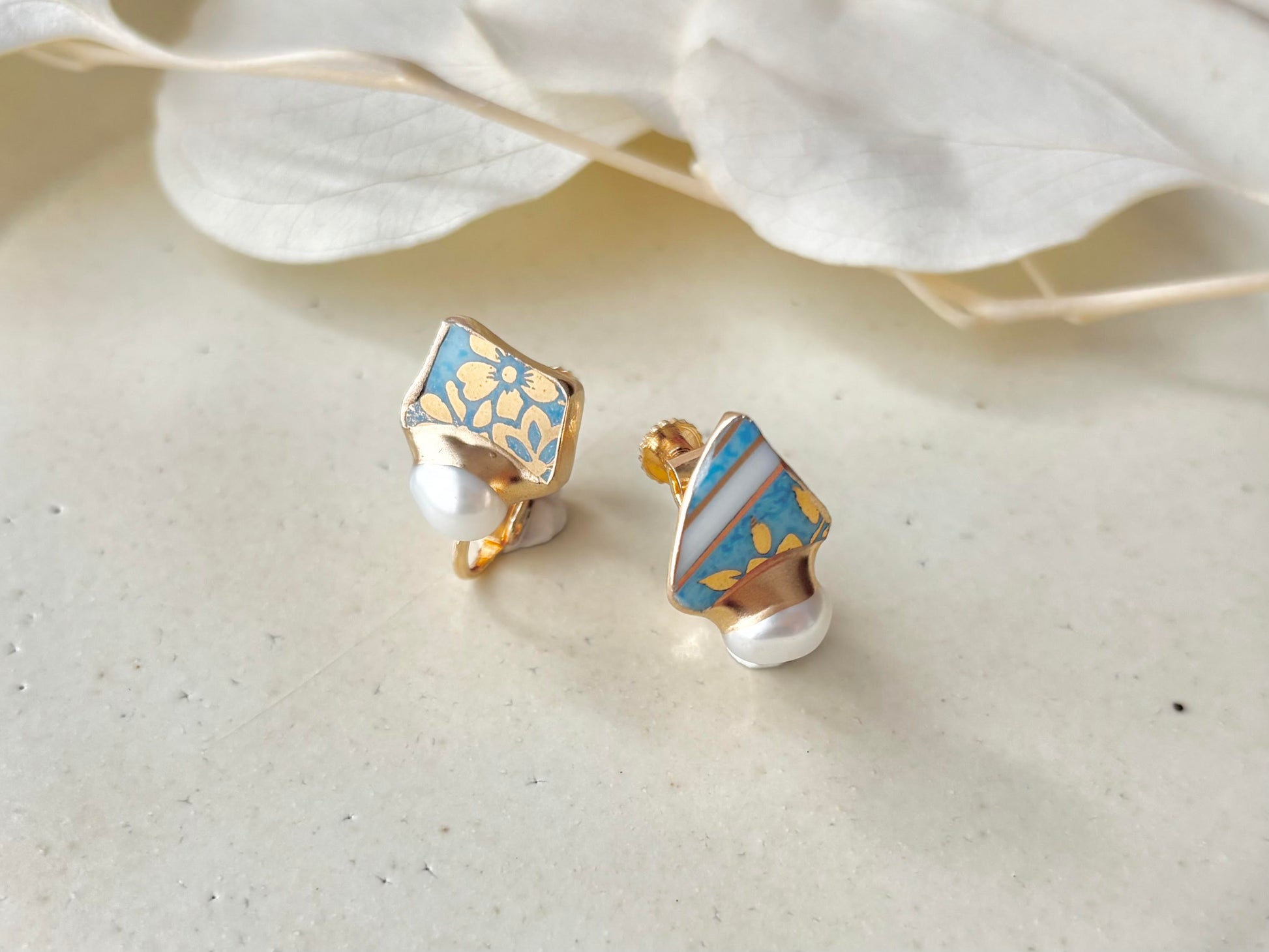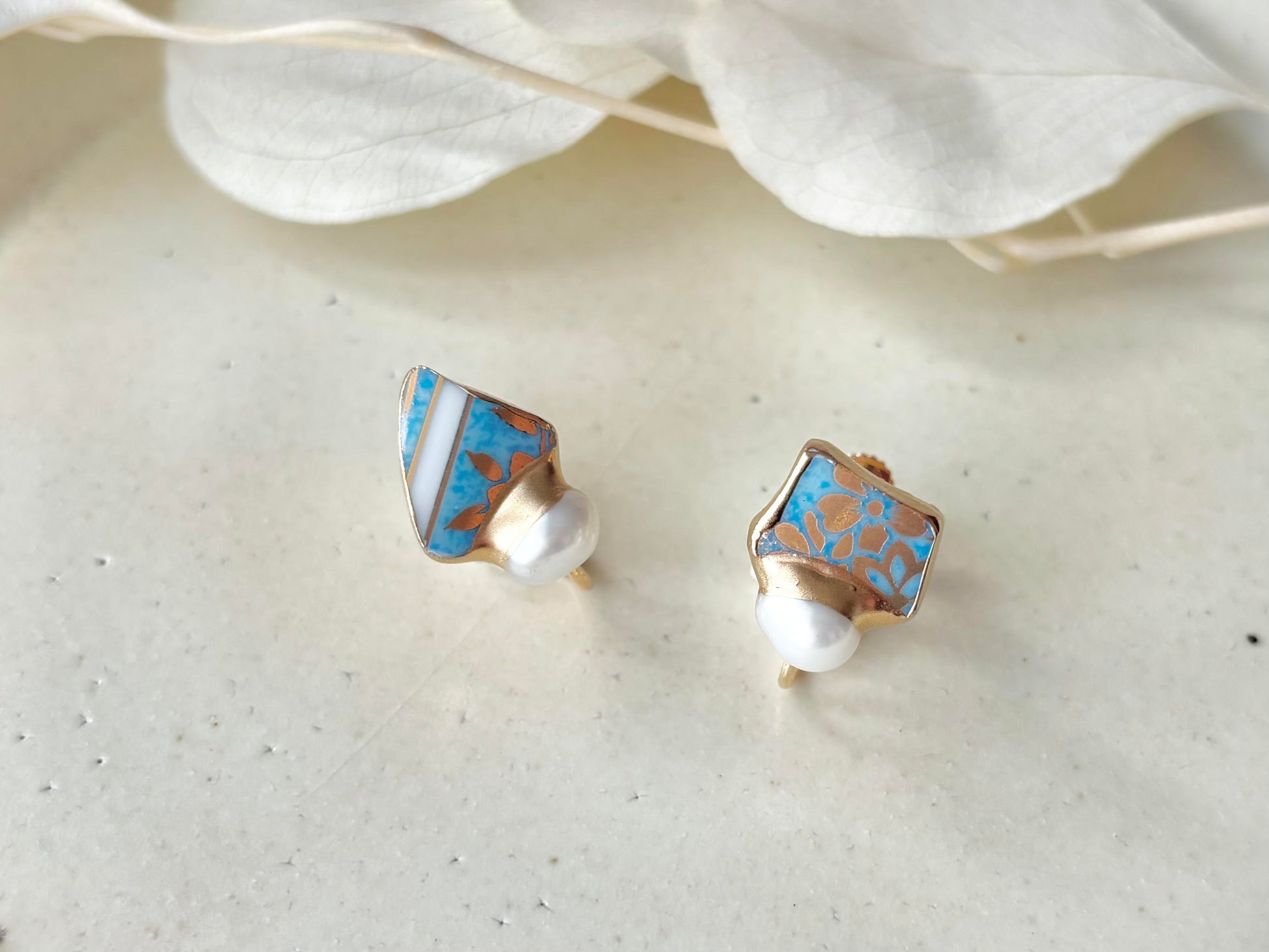有田焼  金継ぎ ネジバネ式イヤリング 水色 金色 花柄 淡水パール 天然石 伝統工芸 #413
