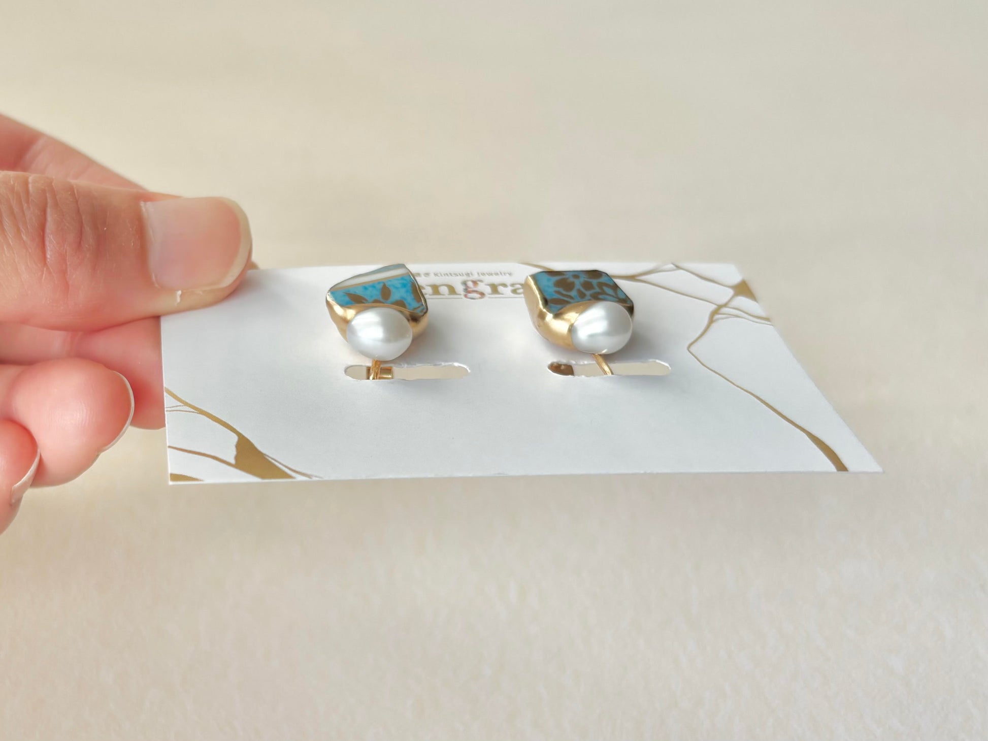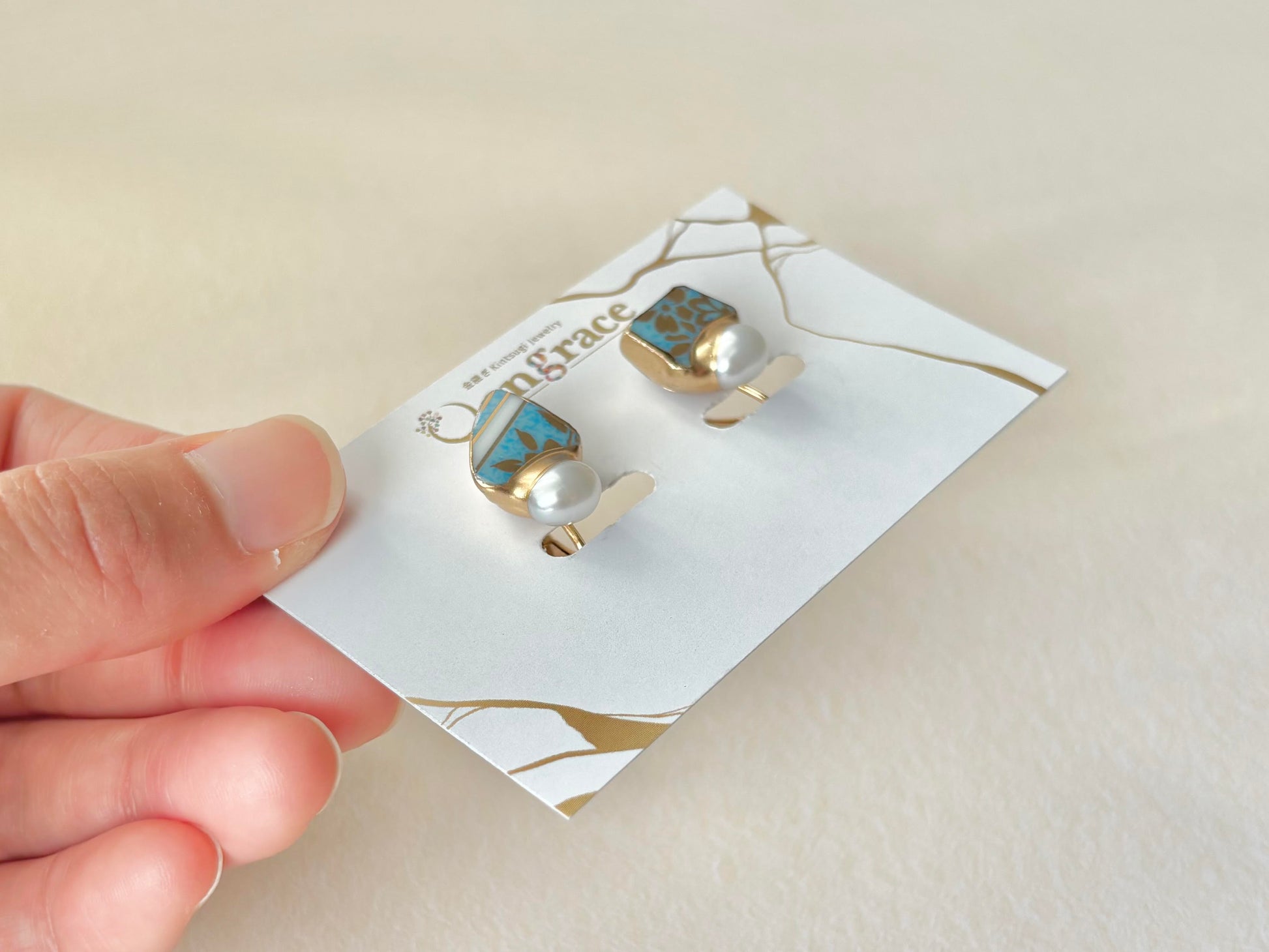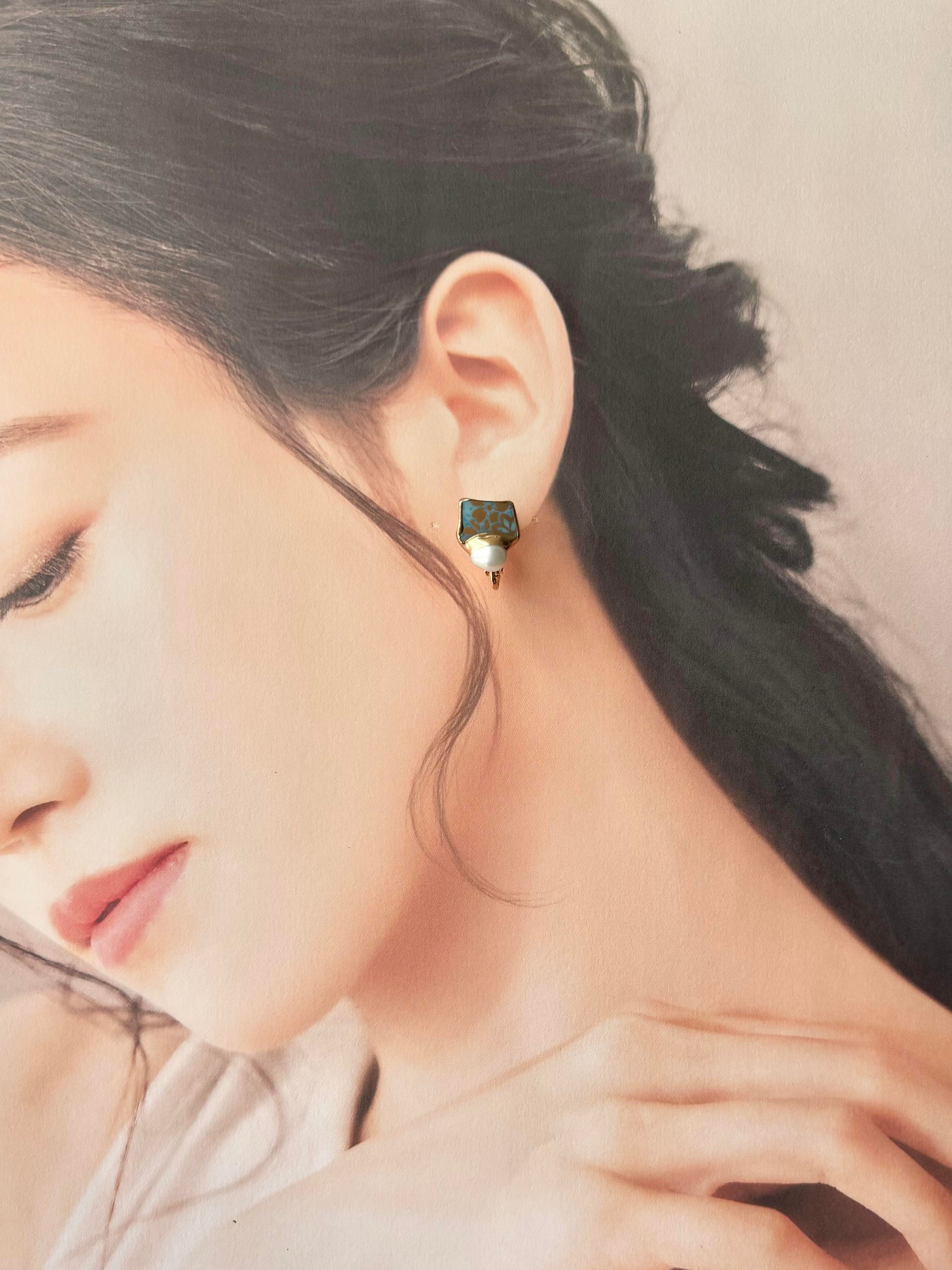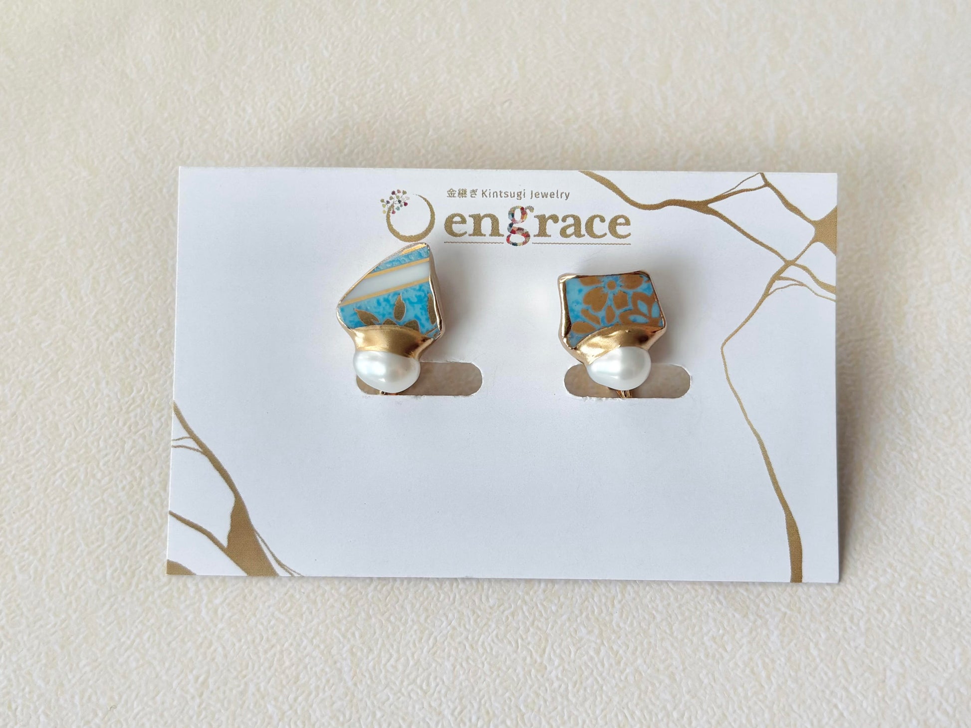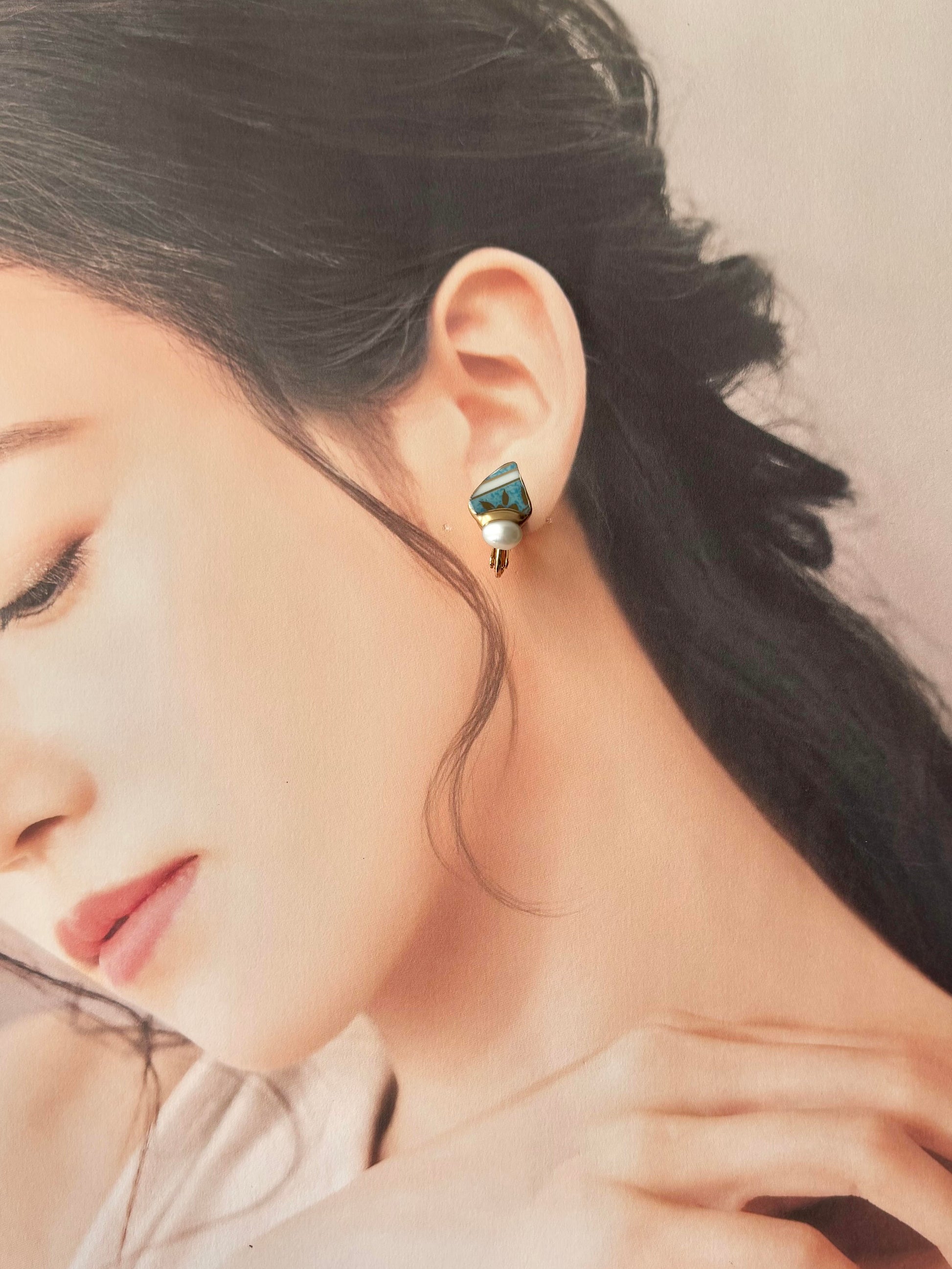 金色の花柄がちらりと見える上品な水色の陶片に淡水パールを合わせました。