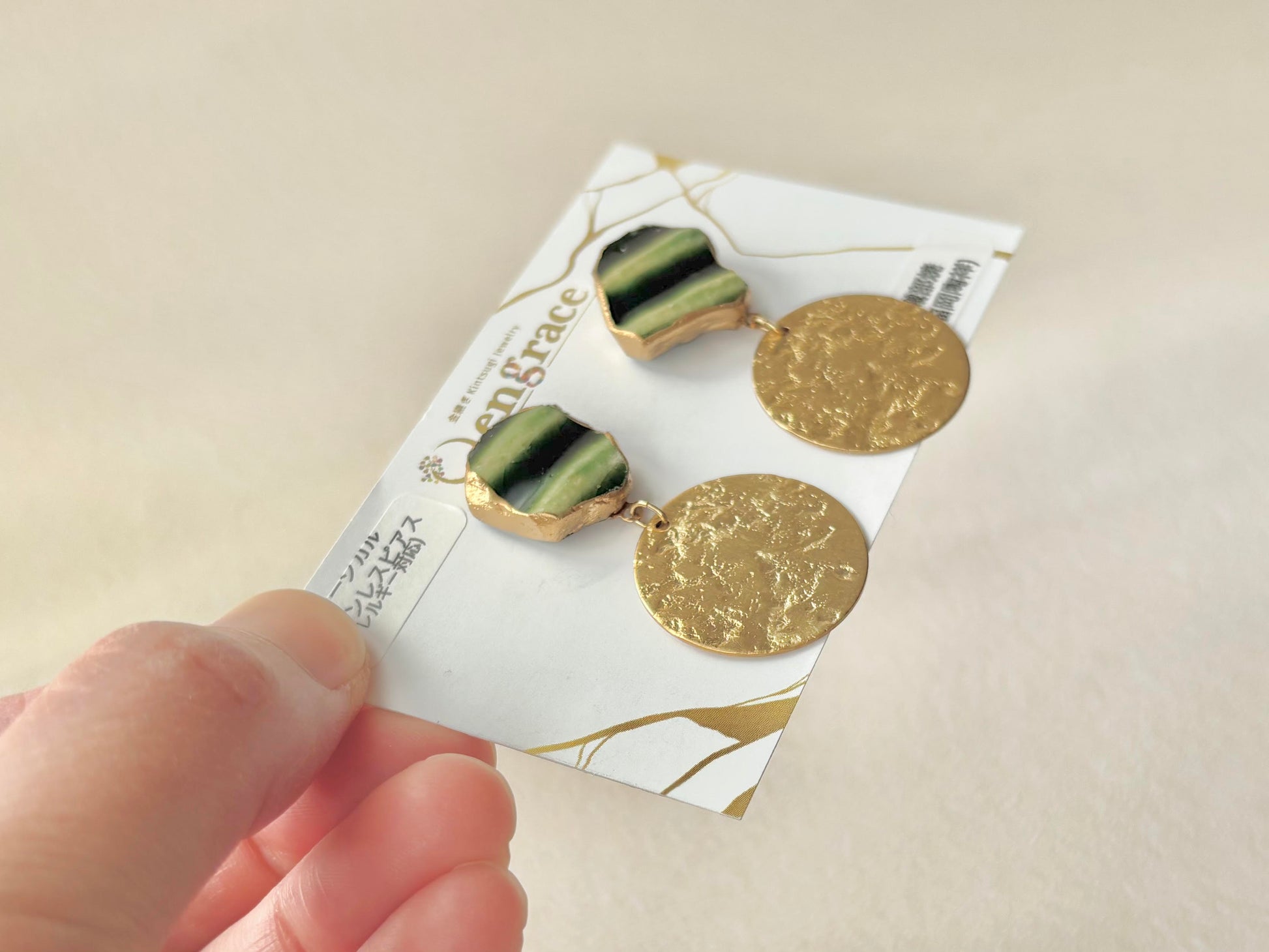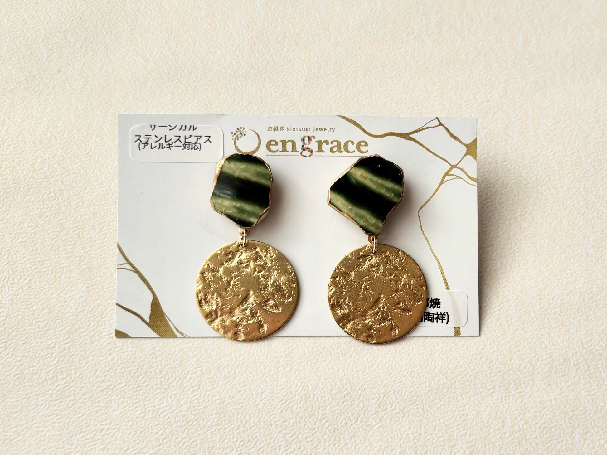 織部焼 金継ぎ サージカルステンレスピアス 深い緑 ゴールド 伝統工芸 #390
