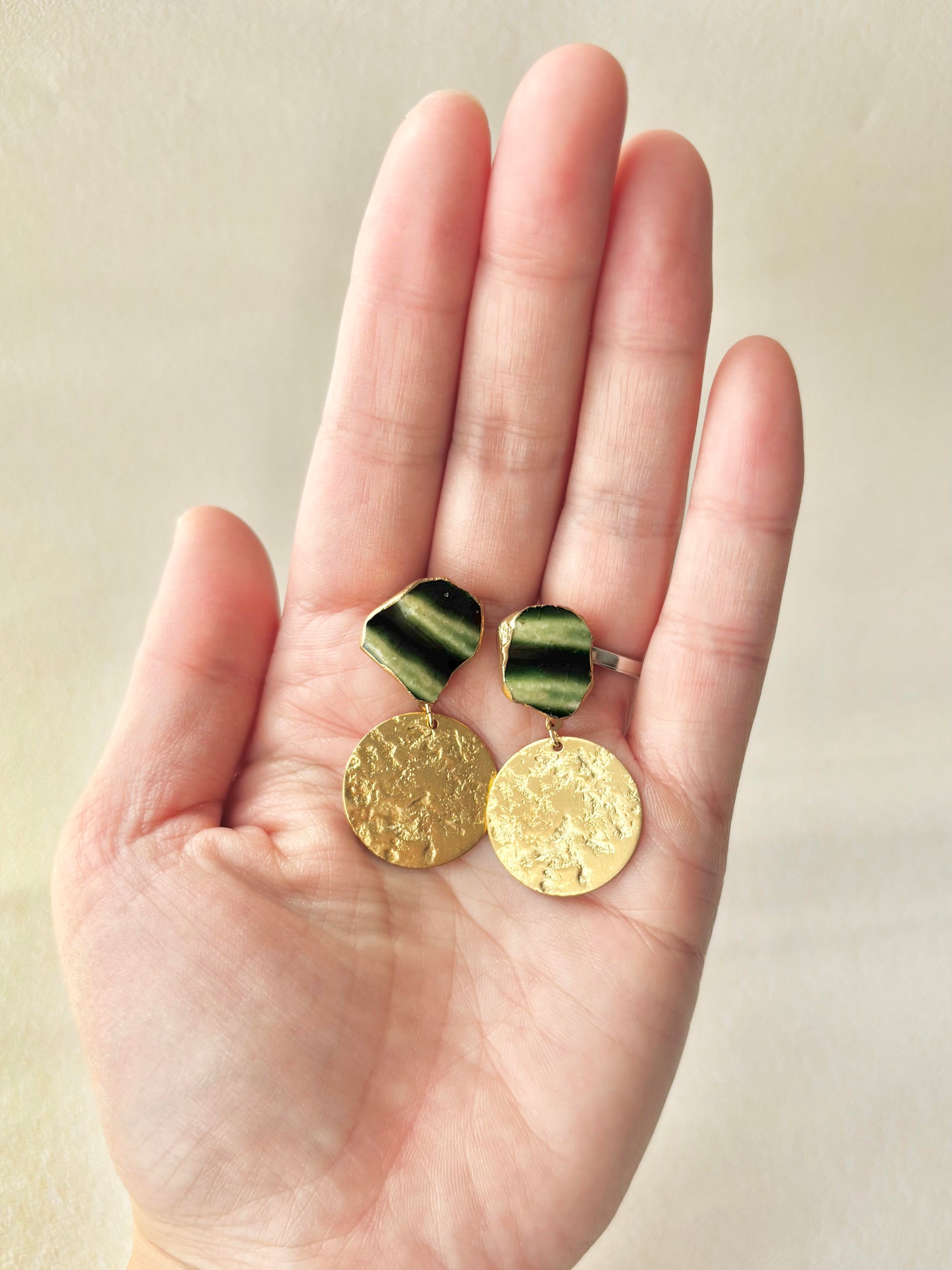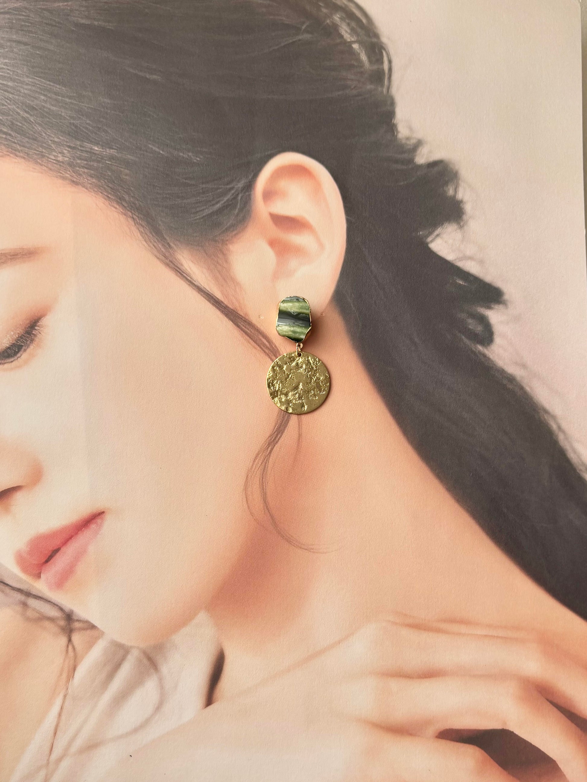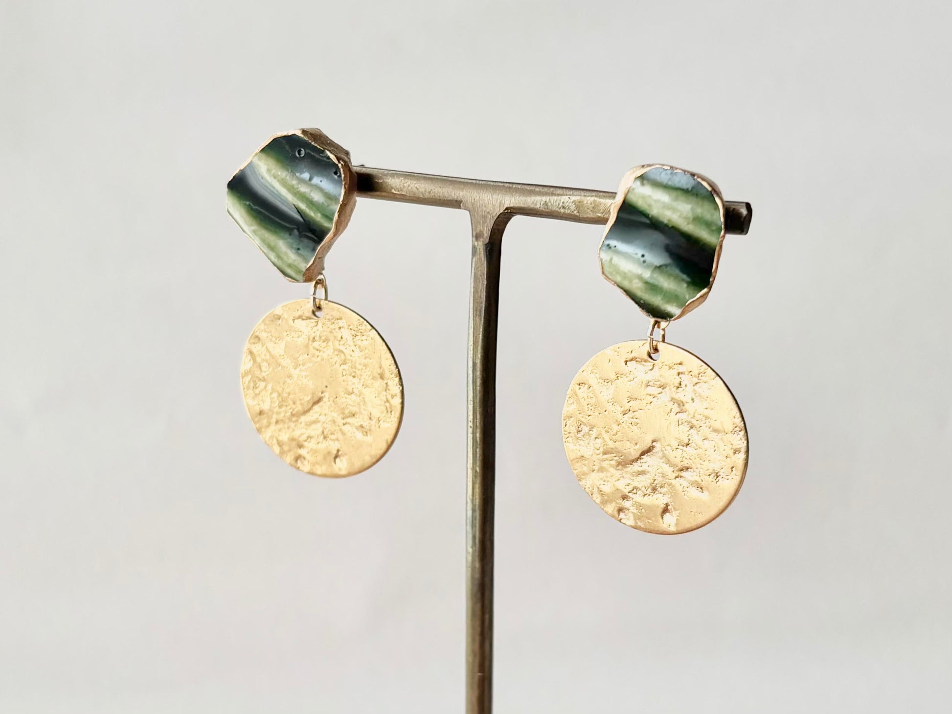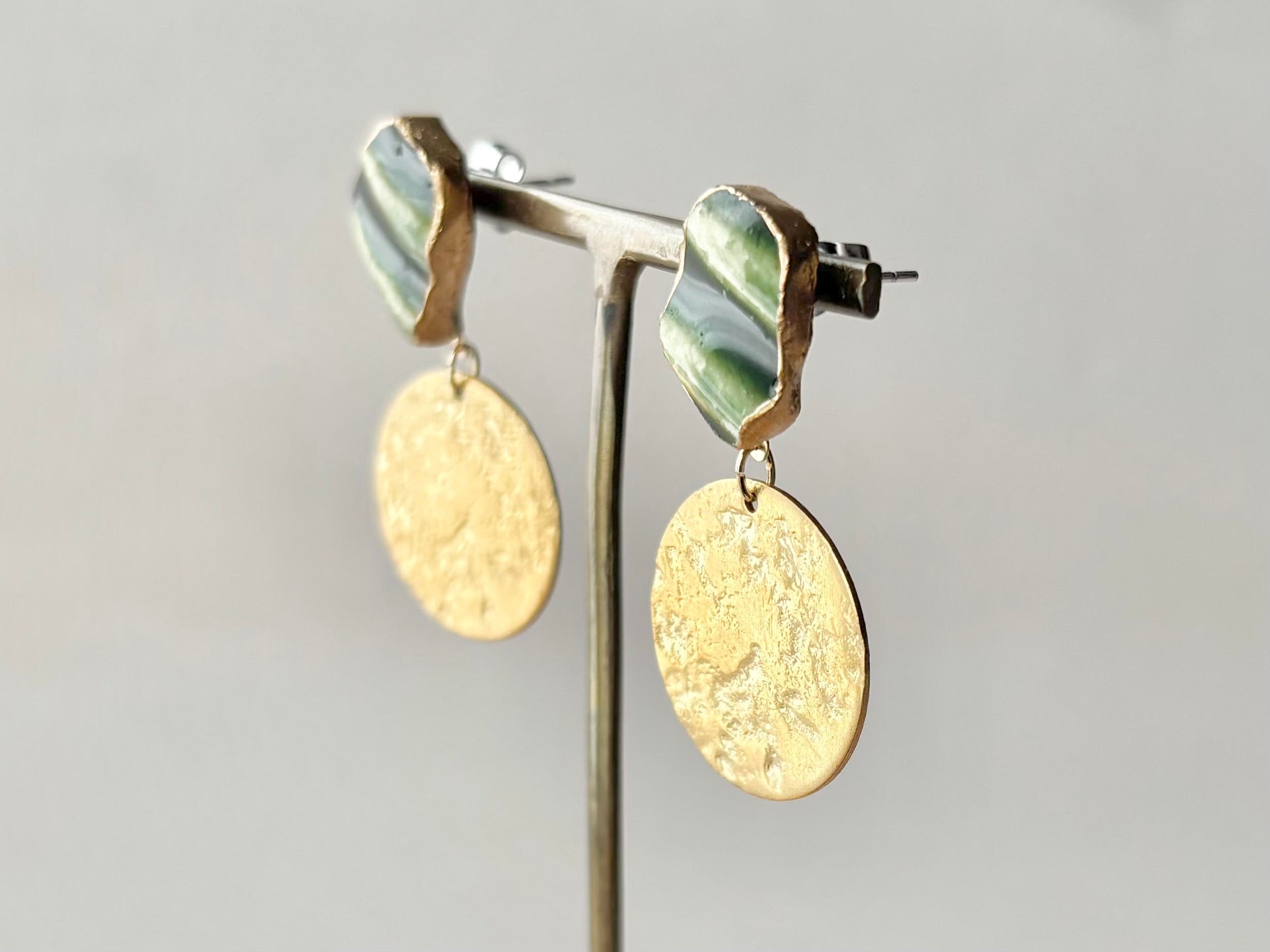 深い緑色が目を引く上品な陶片にゴールドの丸いパーツを合わせました。
