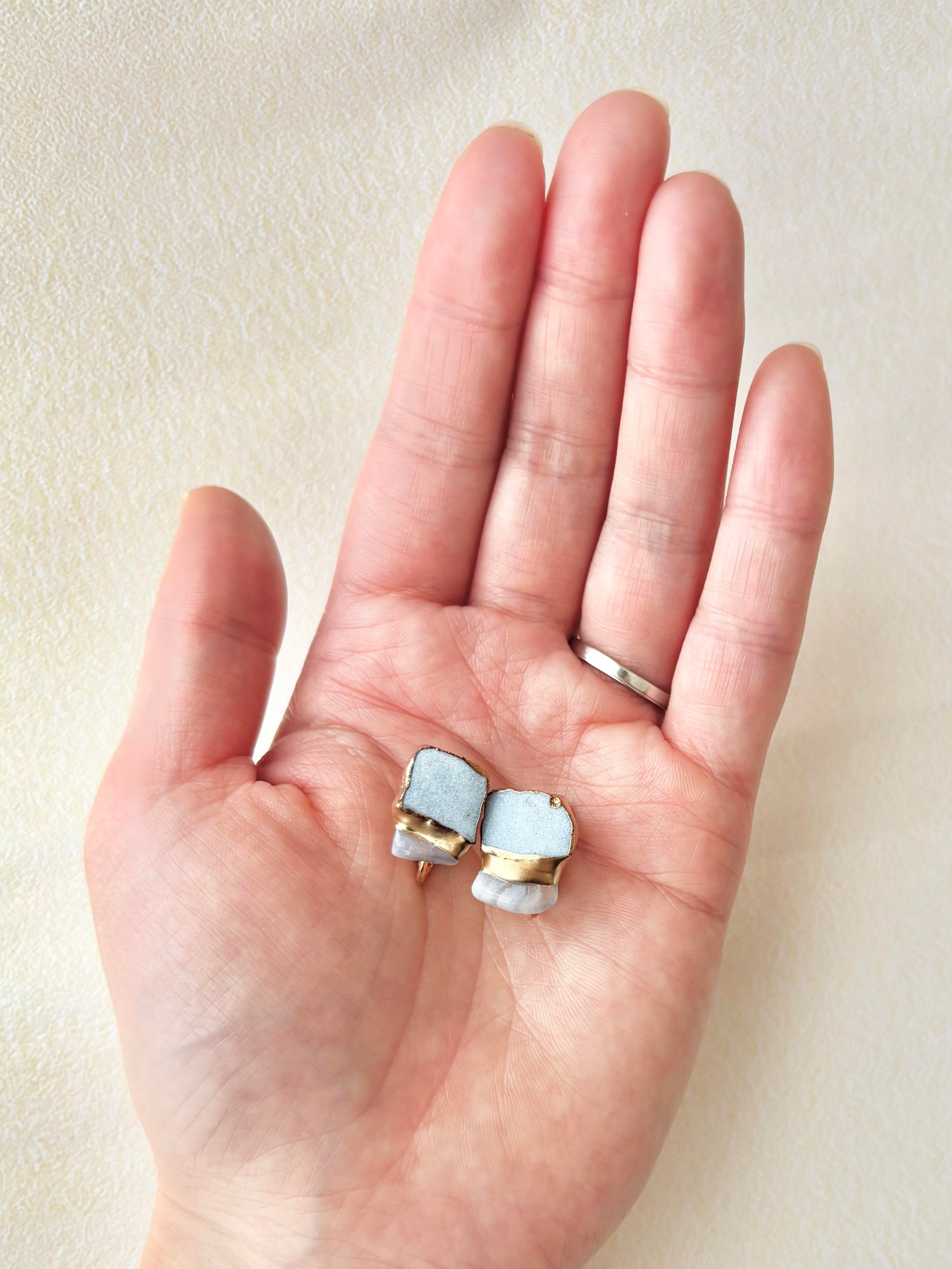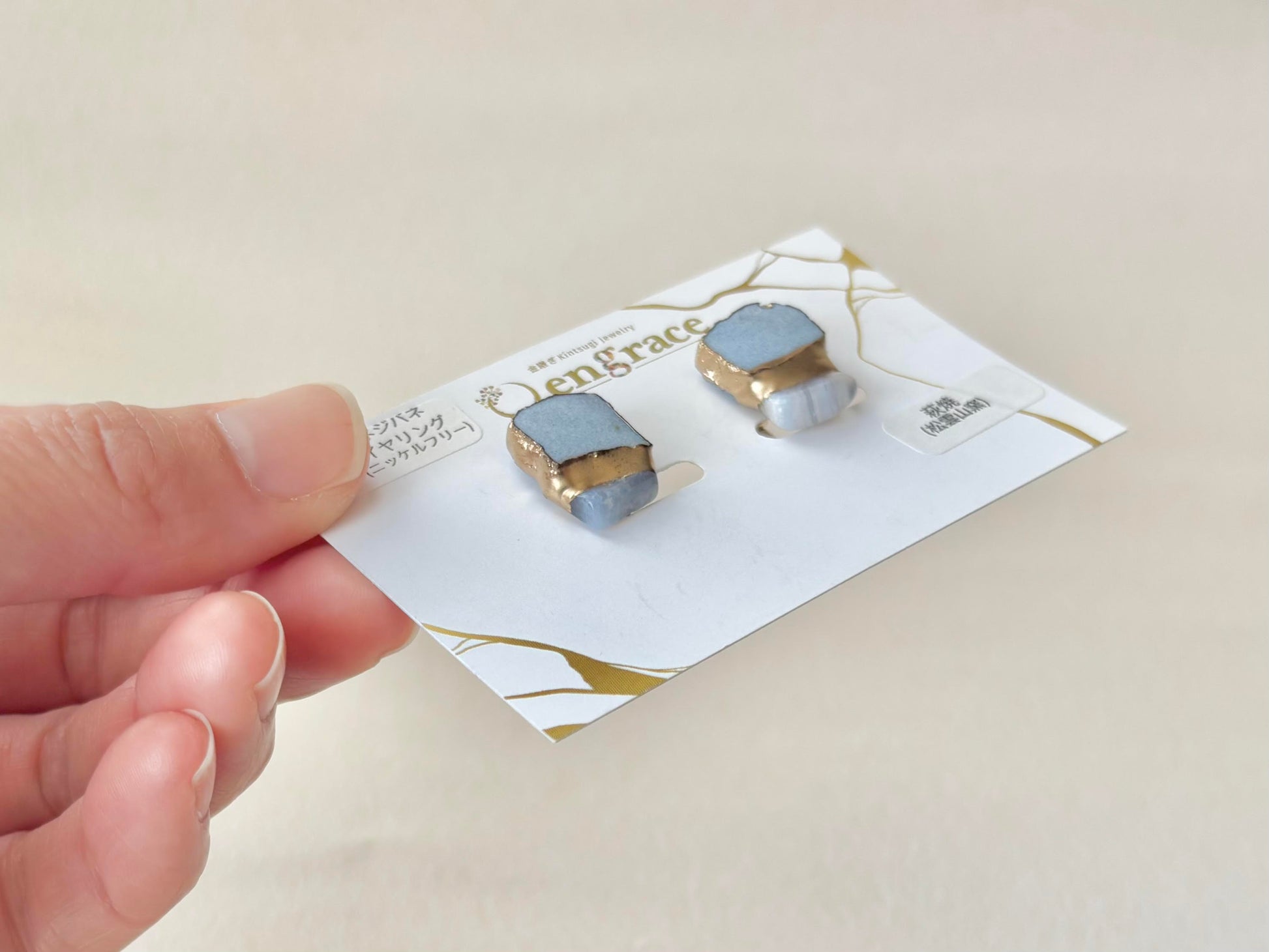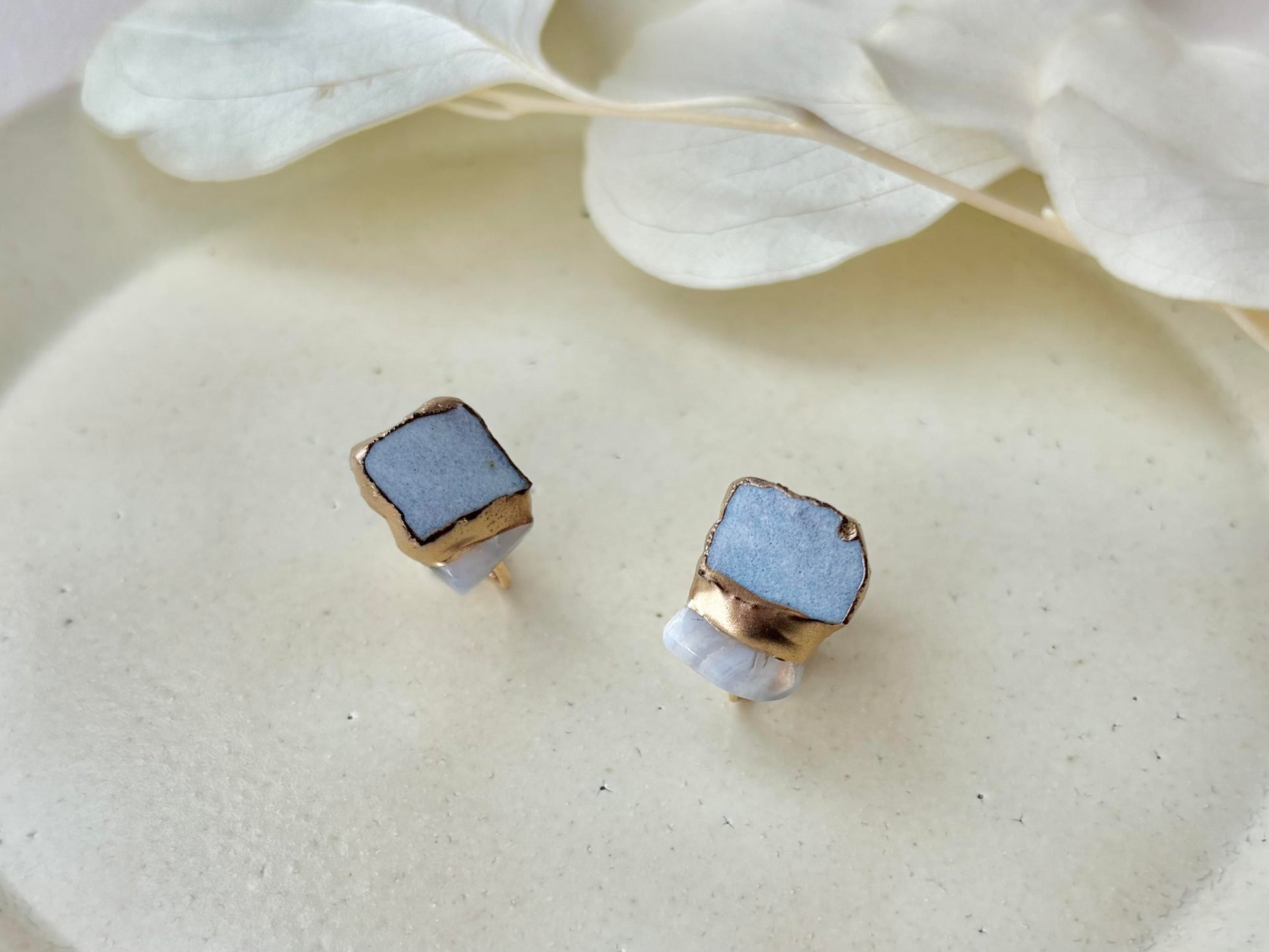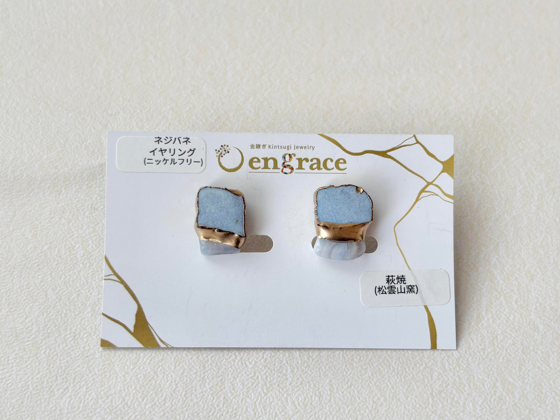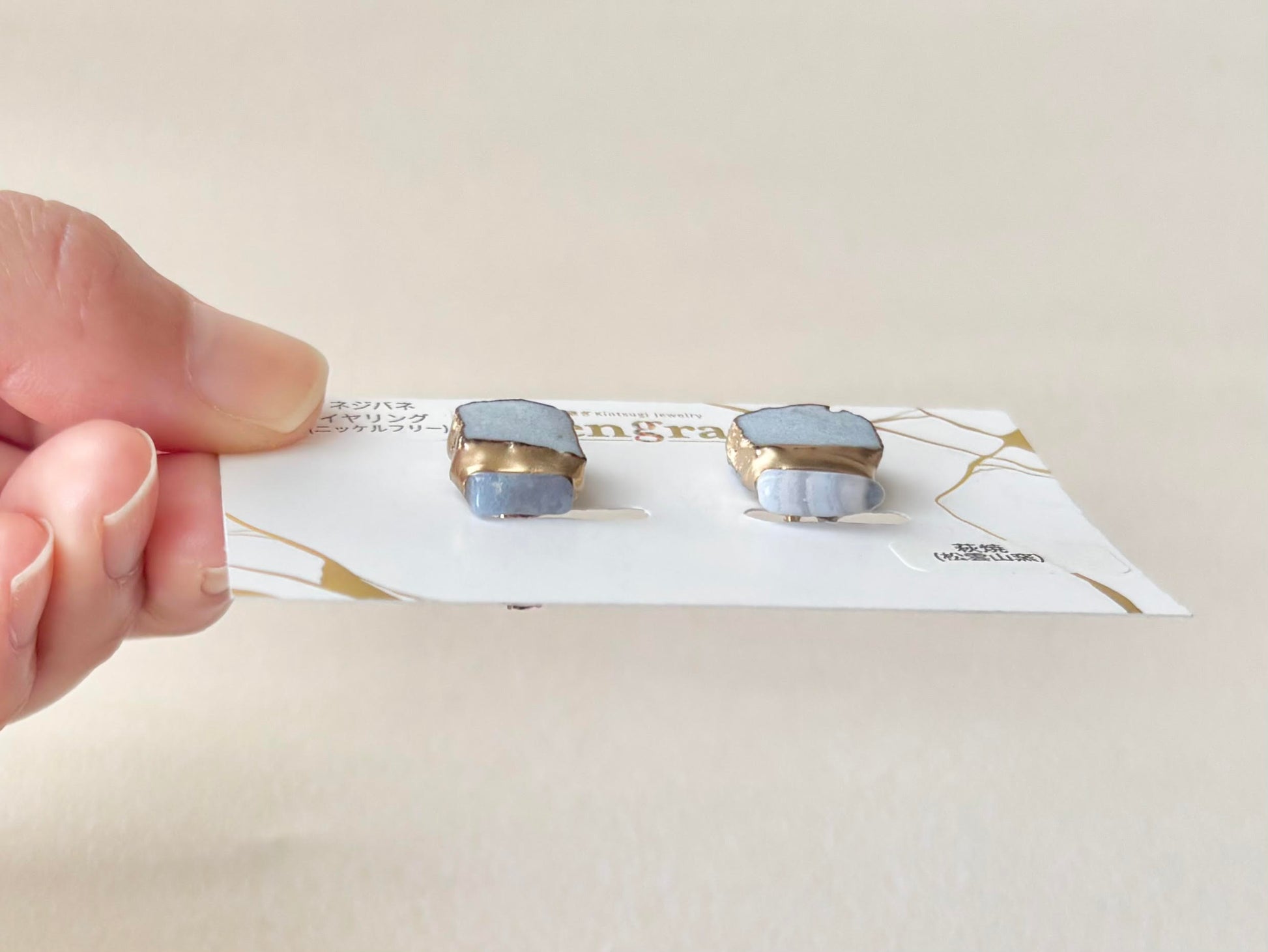 萩焼 金継ぎ ネジバネ式イヤリング 水色 ブルーレースアゲート 天然石  伝統工芸 #510