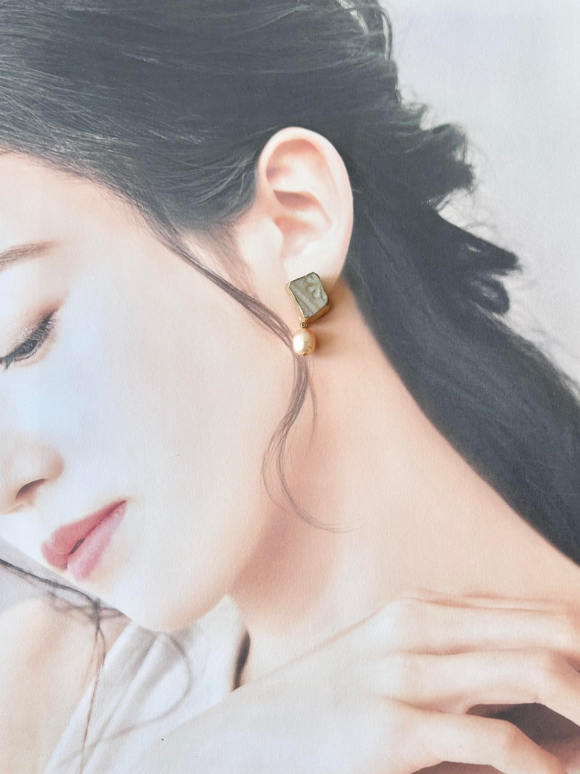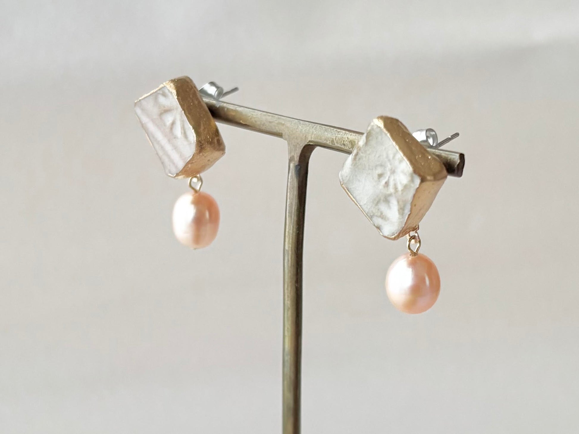 萩焼 金継ぎ サージカルステンレスピアス グレー 花柄 淡水パール 揺れる 天然石 伝統工芸 #344