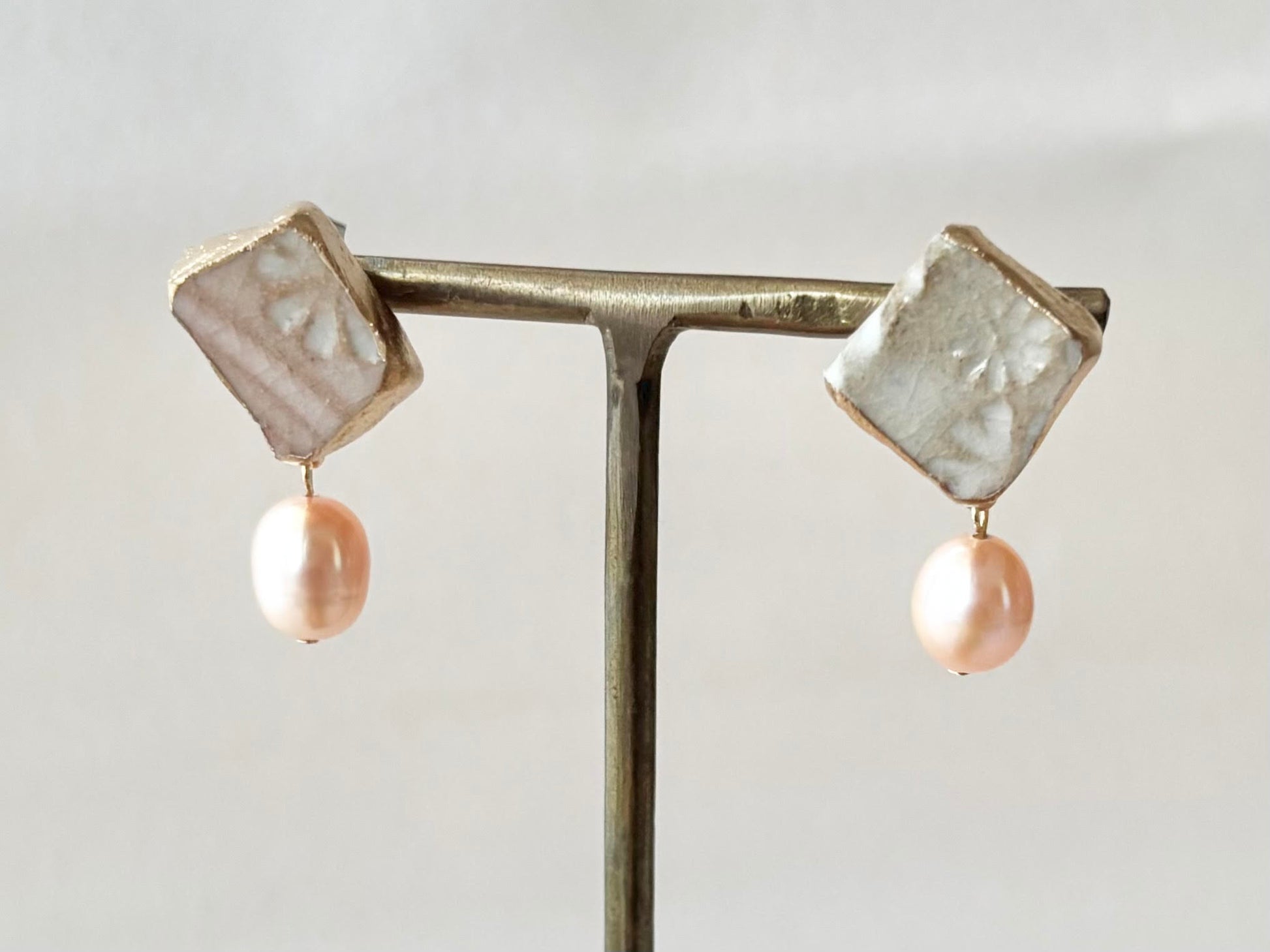 花柄がちらりと見える上品な陶片に淡いピンクの淡水パールを合わせました。