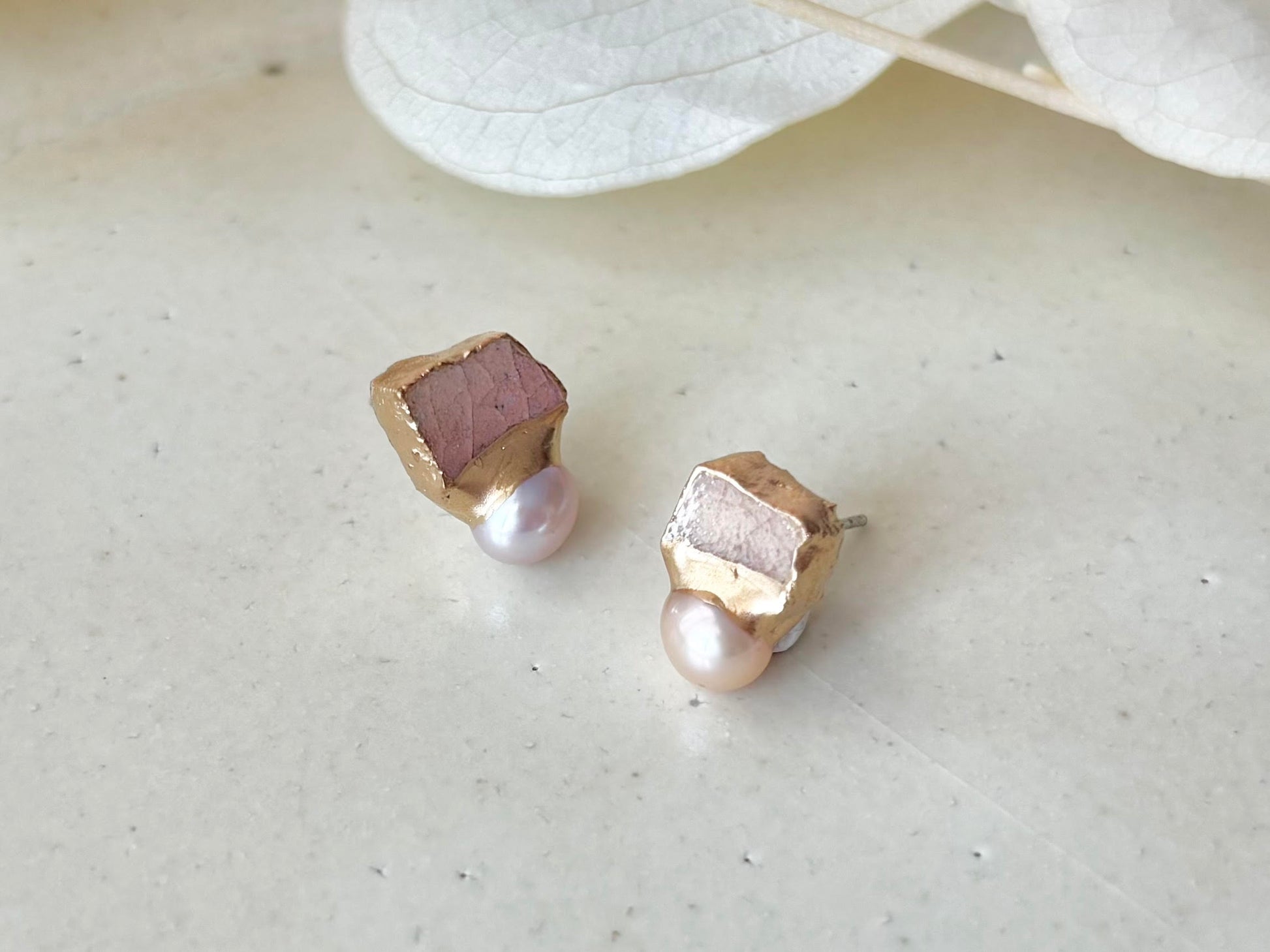 萩焼 金継ぎ サージカルステンレスピアス ピンク 淡水パール 天然石  伝統工芸 #350