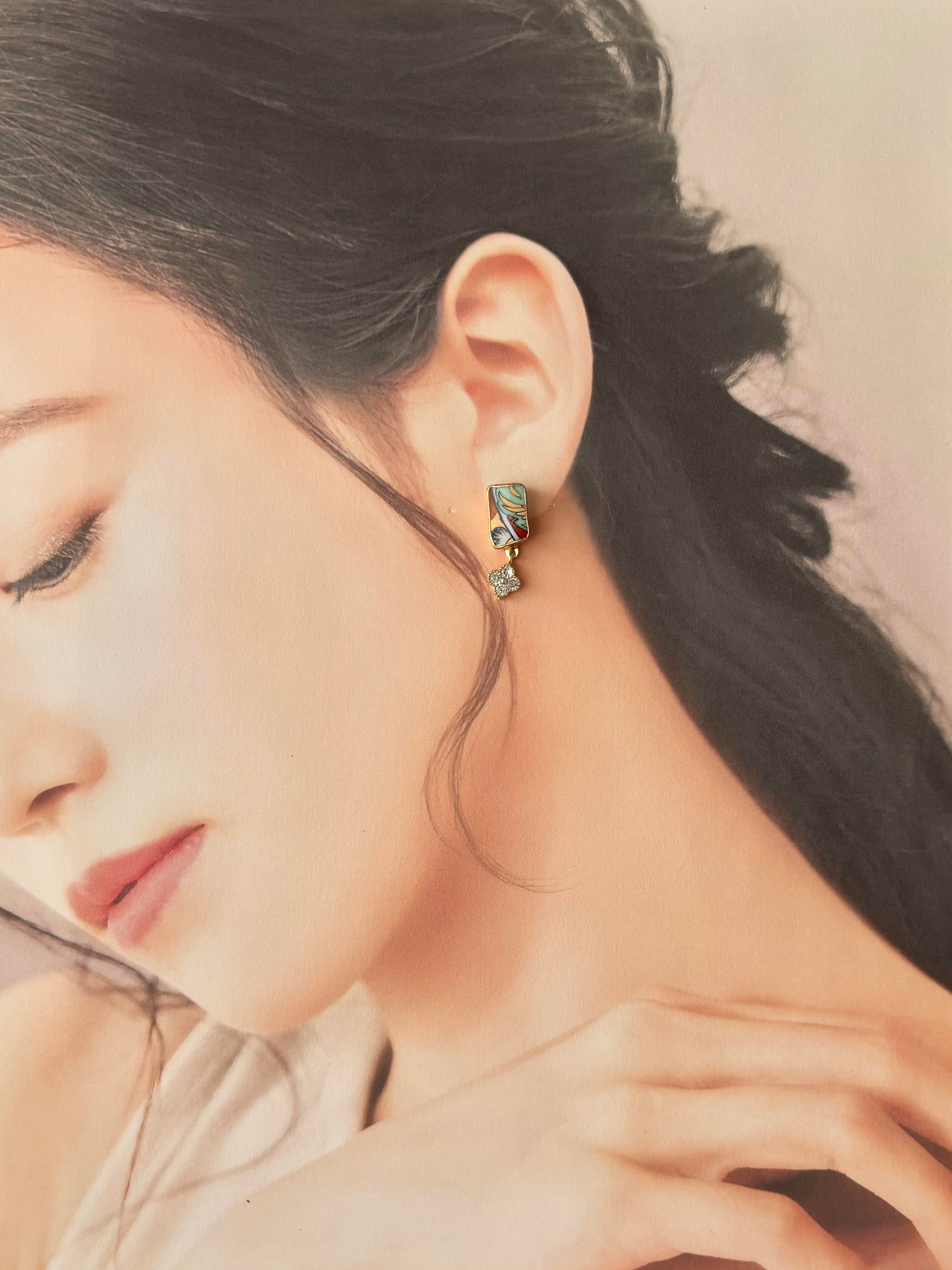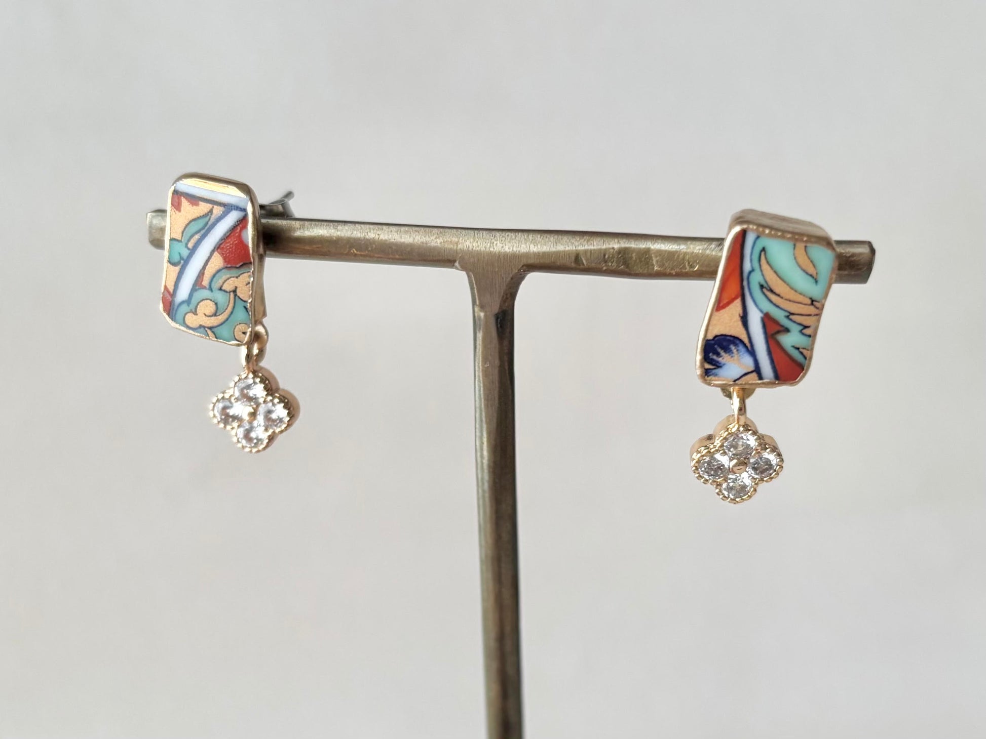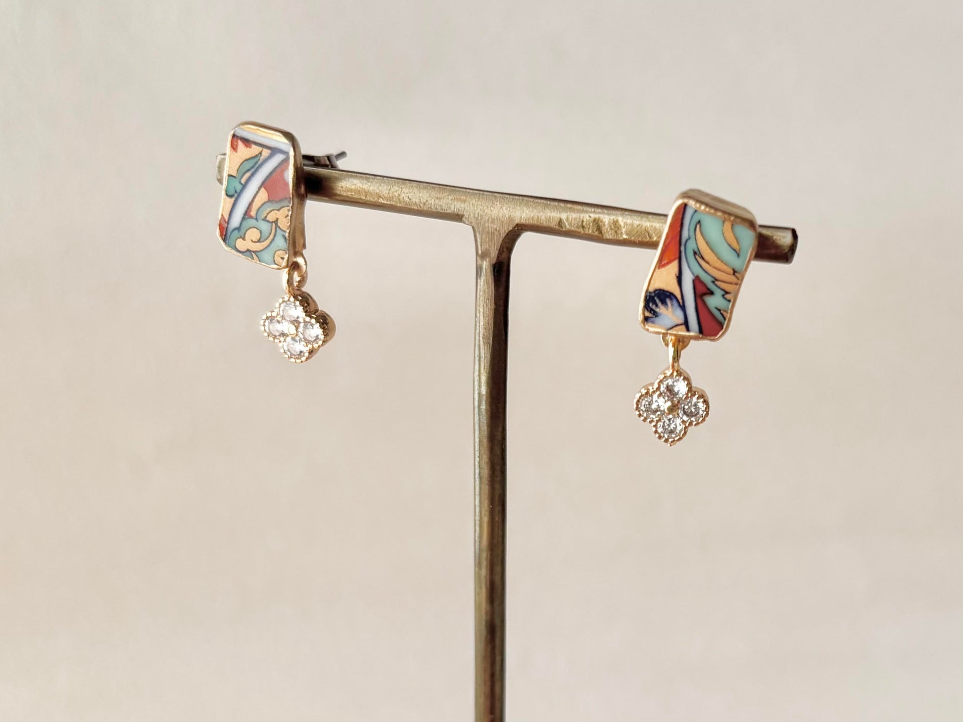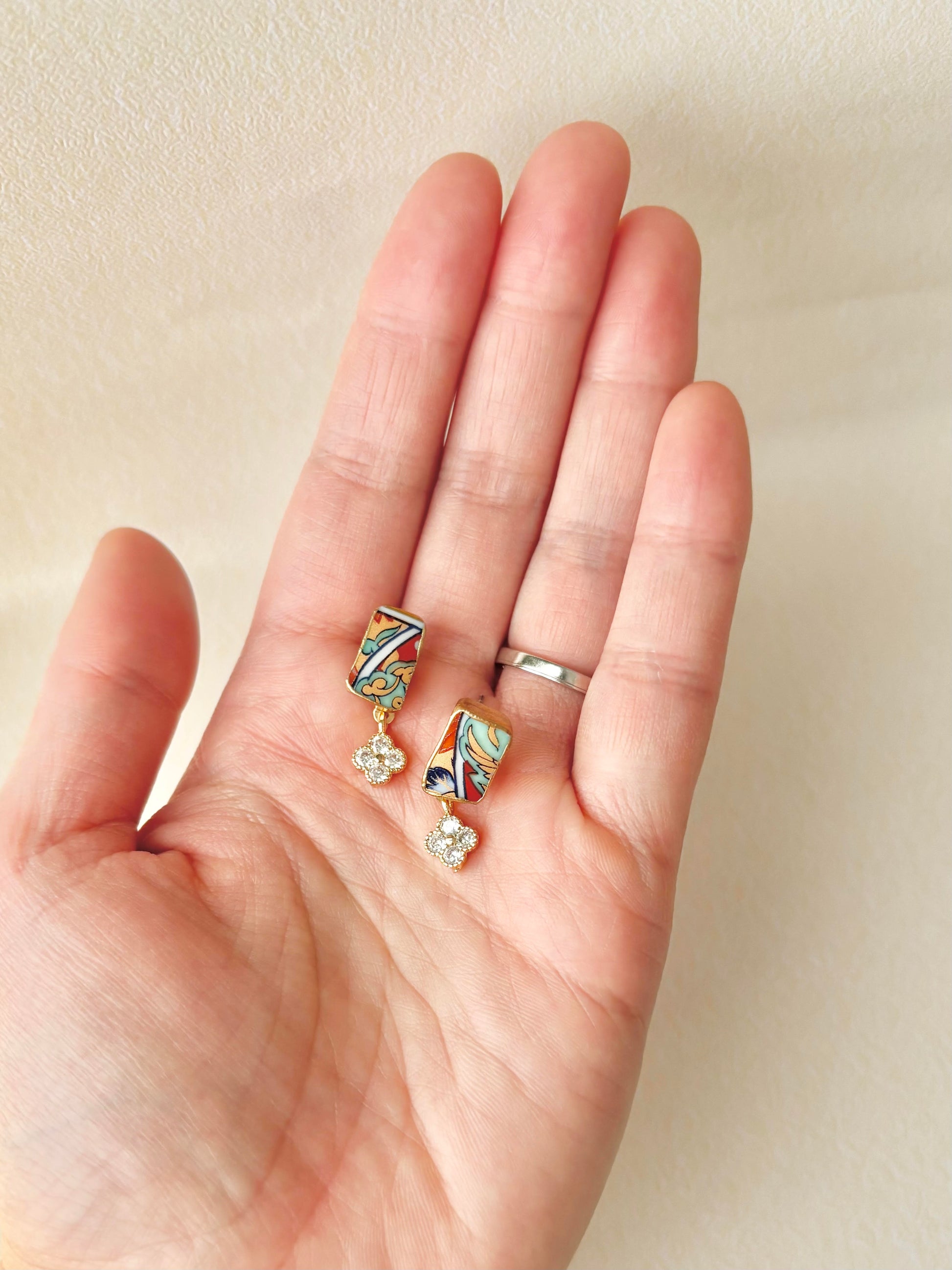 リーフ柄や和柄が描かれた上品な陶片に花の形のチャームを合わせました。