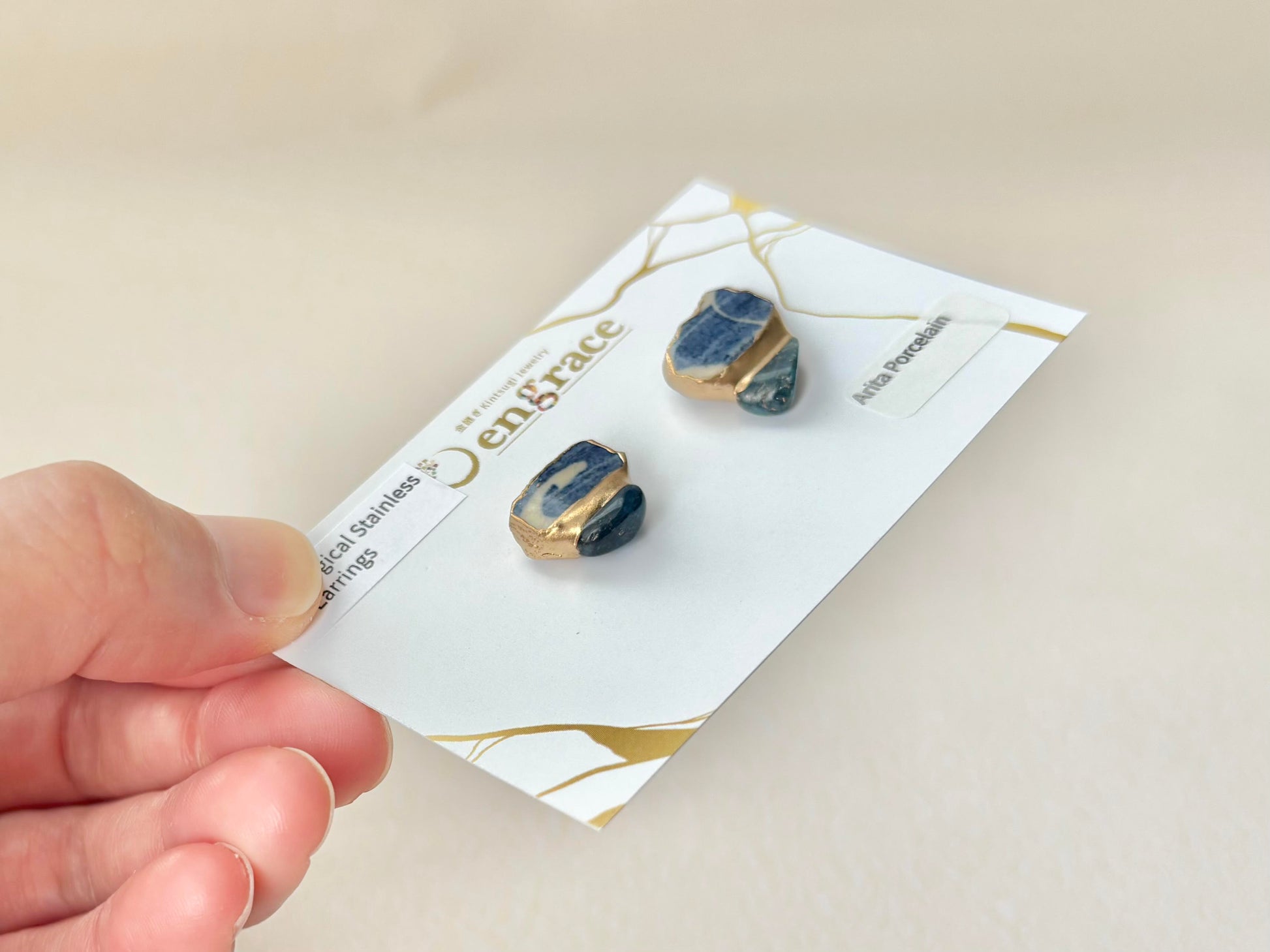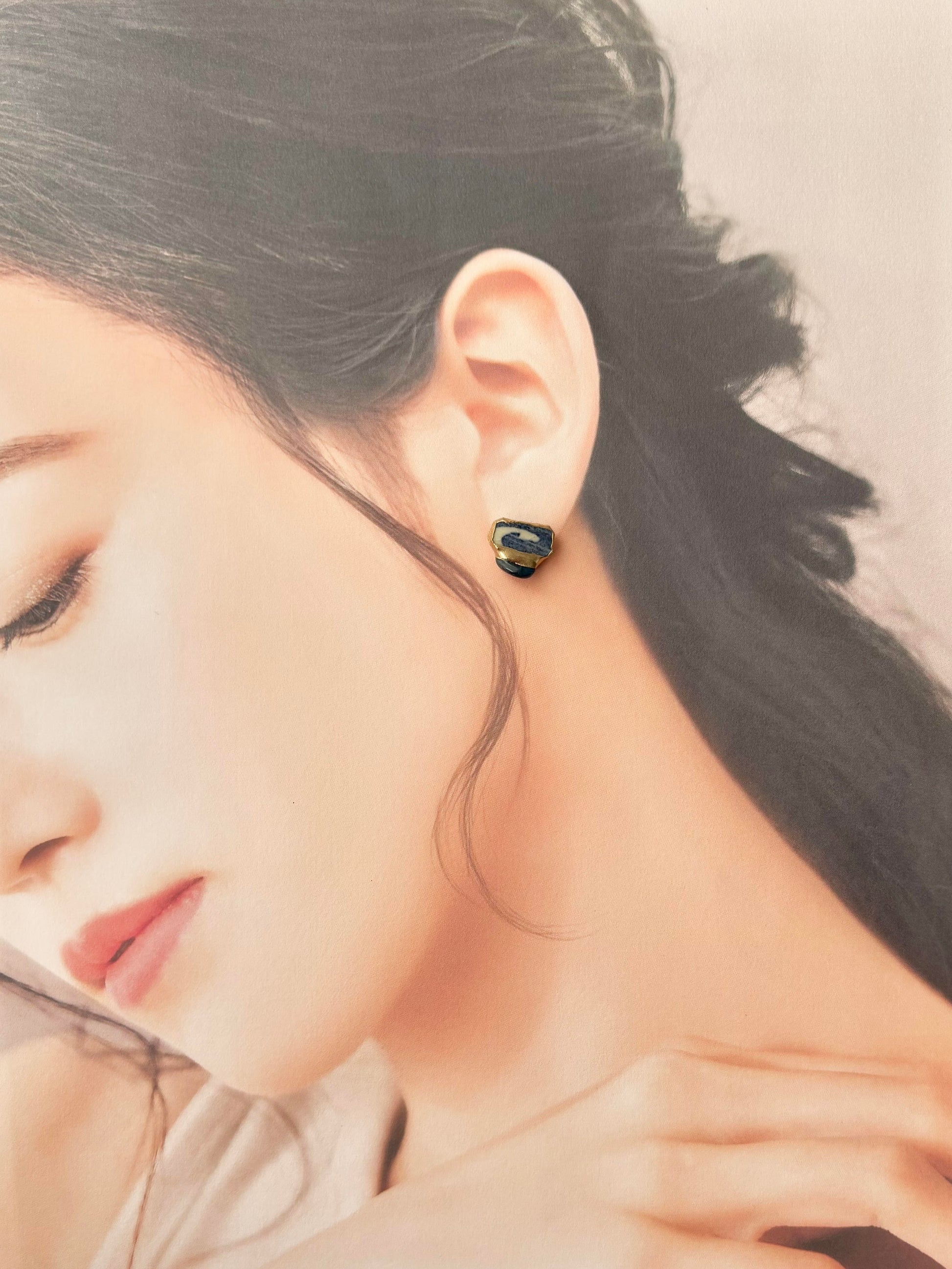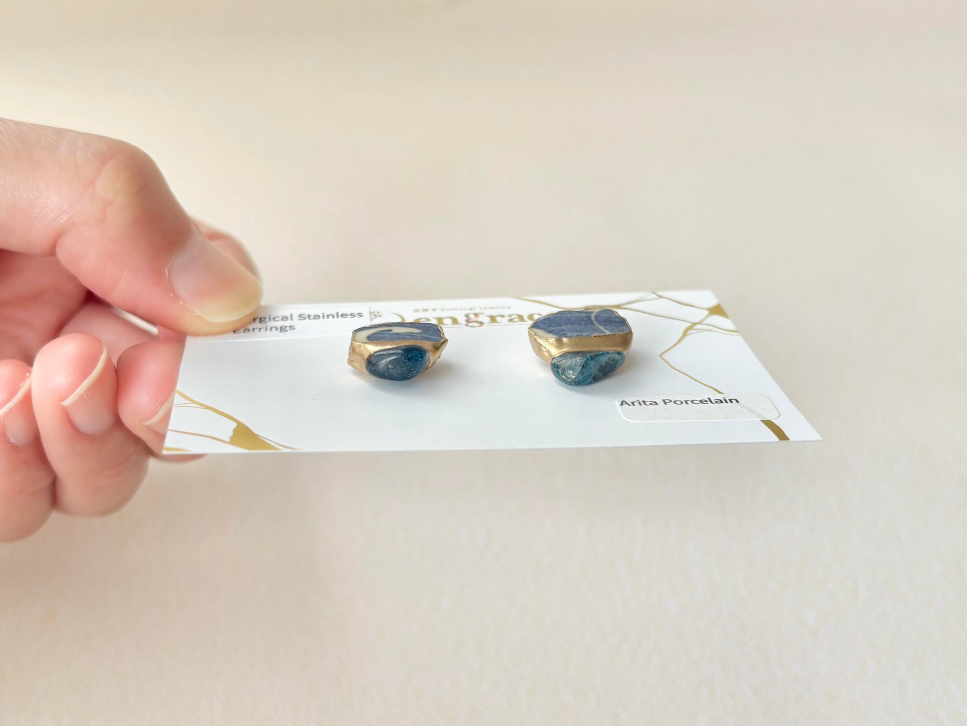 有田焼  金継ぎ サージカルステンレスピアス 青 白 アパタイト 天然石 伝統工芸 #378