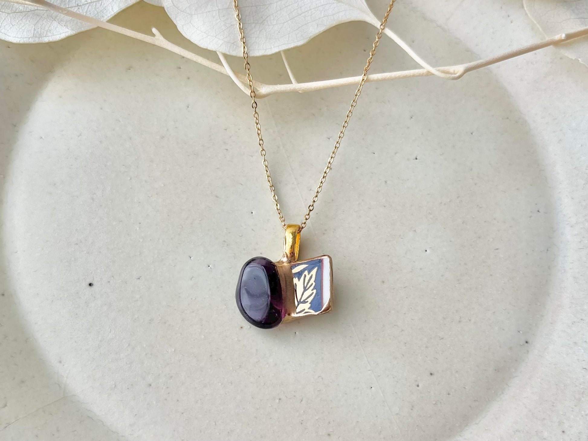 有田焼 金継ぎ ネックレス サージカルステンレスチェーン アレルギー対応 18K リーフ柄 アメジスト 天然石 伝統工芸 #446