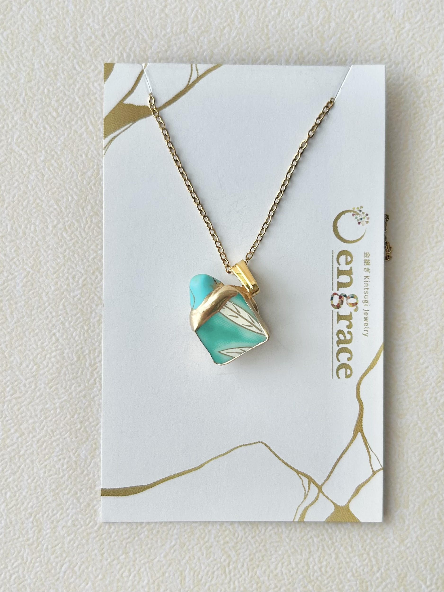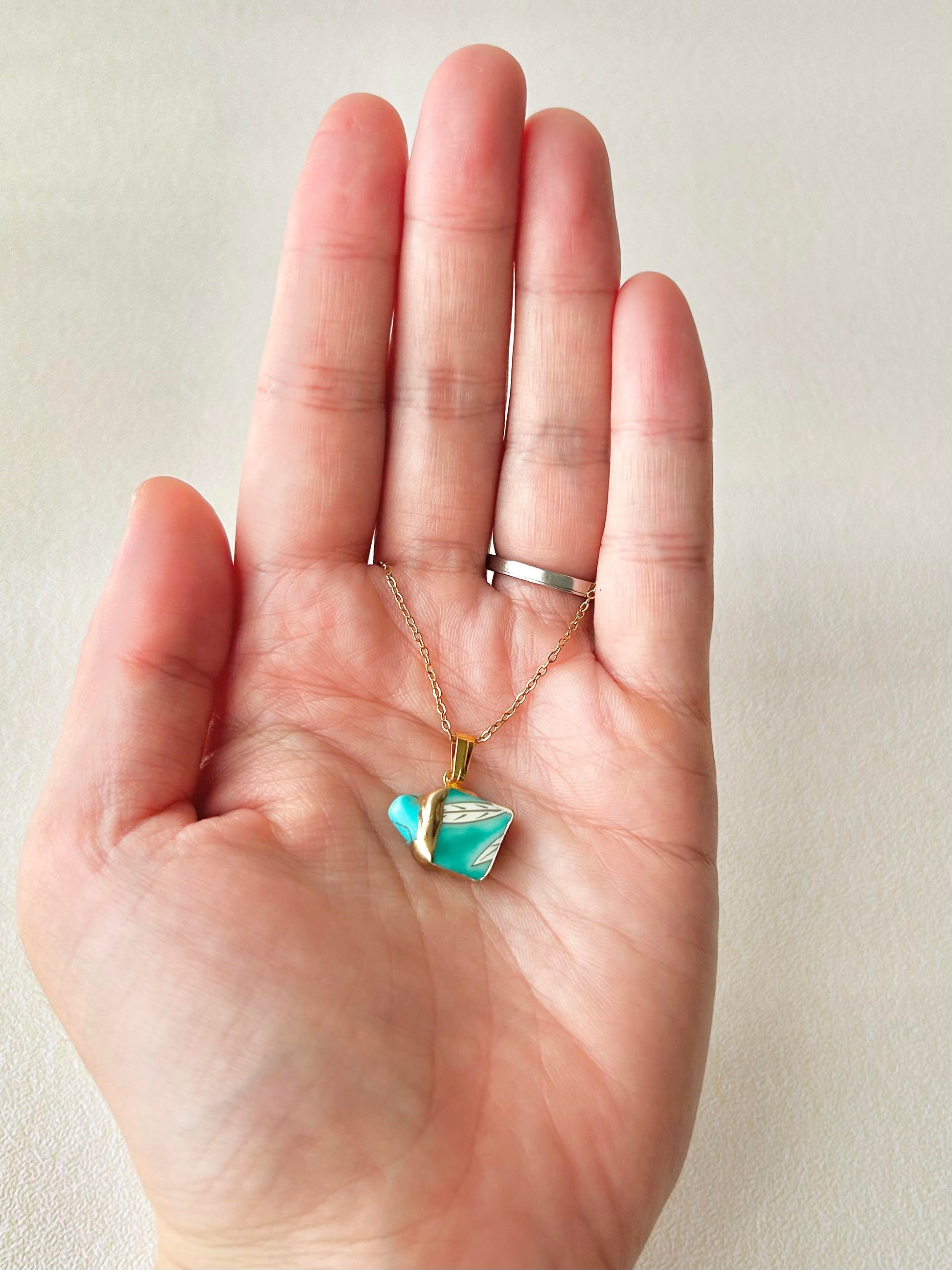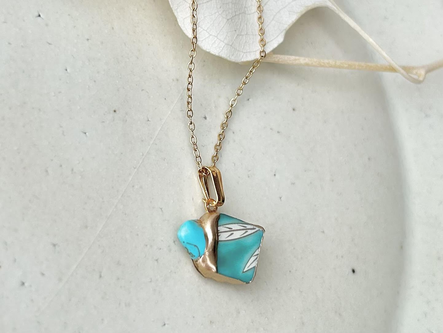 有田焼 金継ぎ ネックレス サージカルステンレスチェーン アレルギー対応 18K 緑 リーフ柄 ターコイズ 天然石 伝統工芸 #292