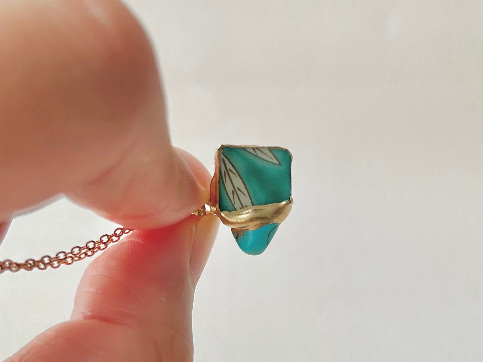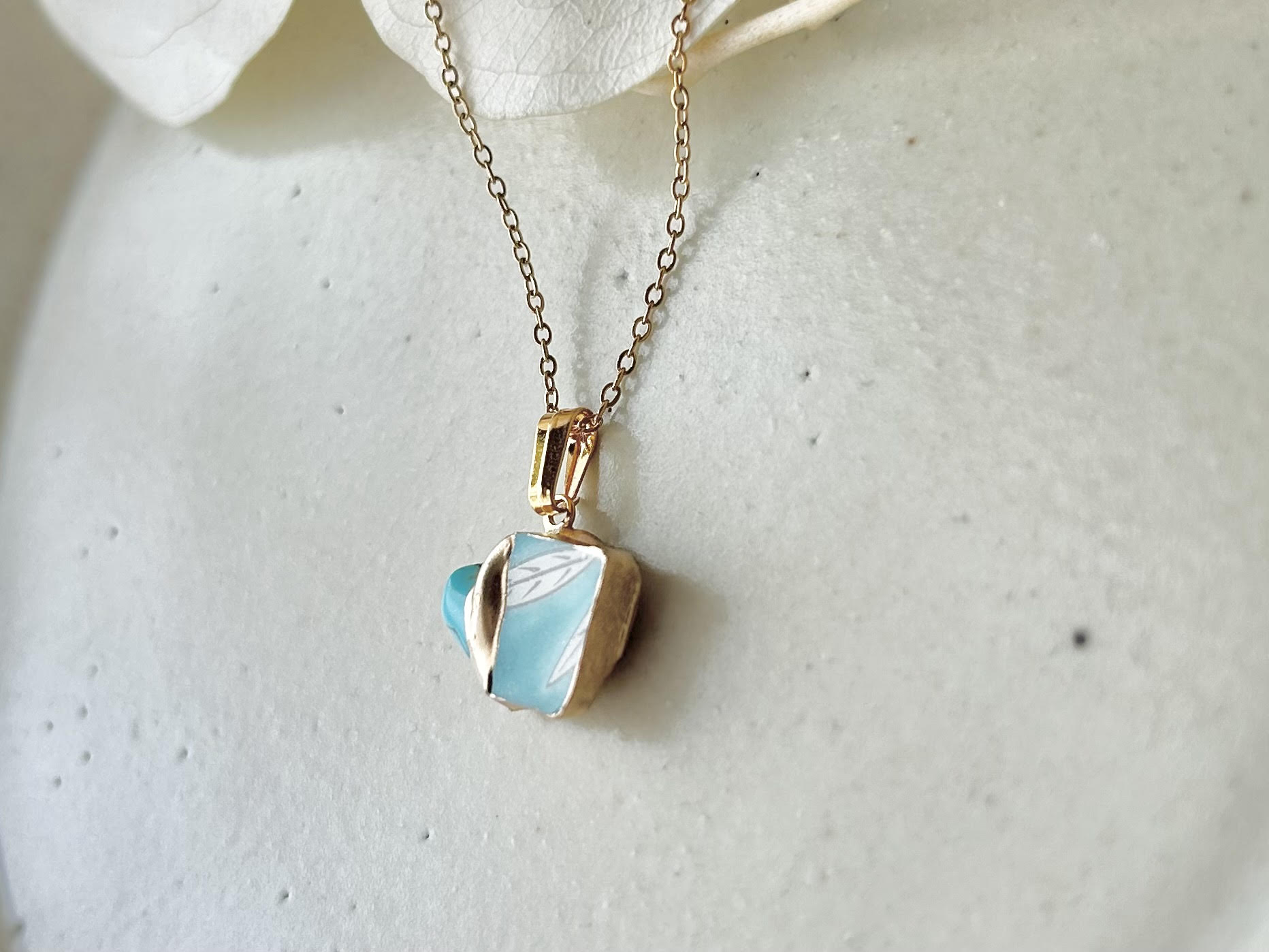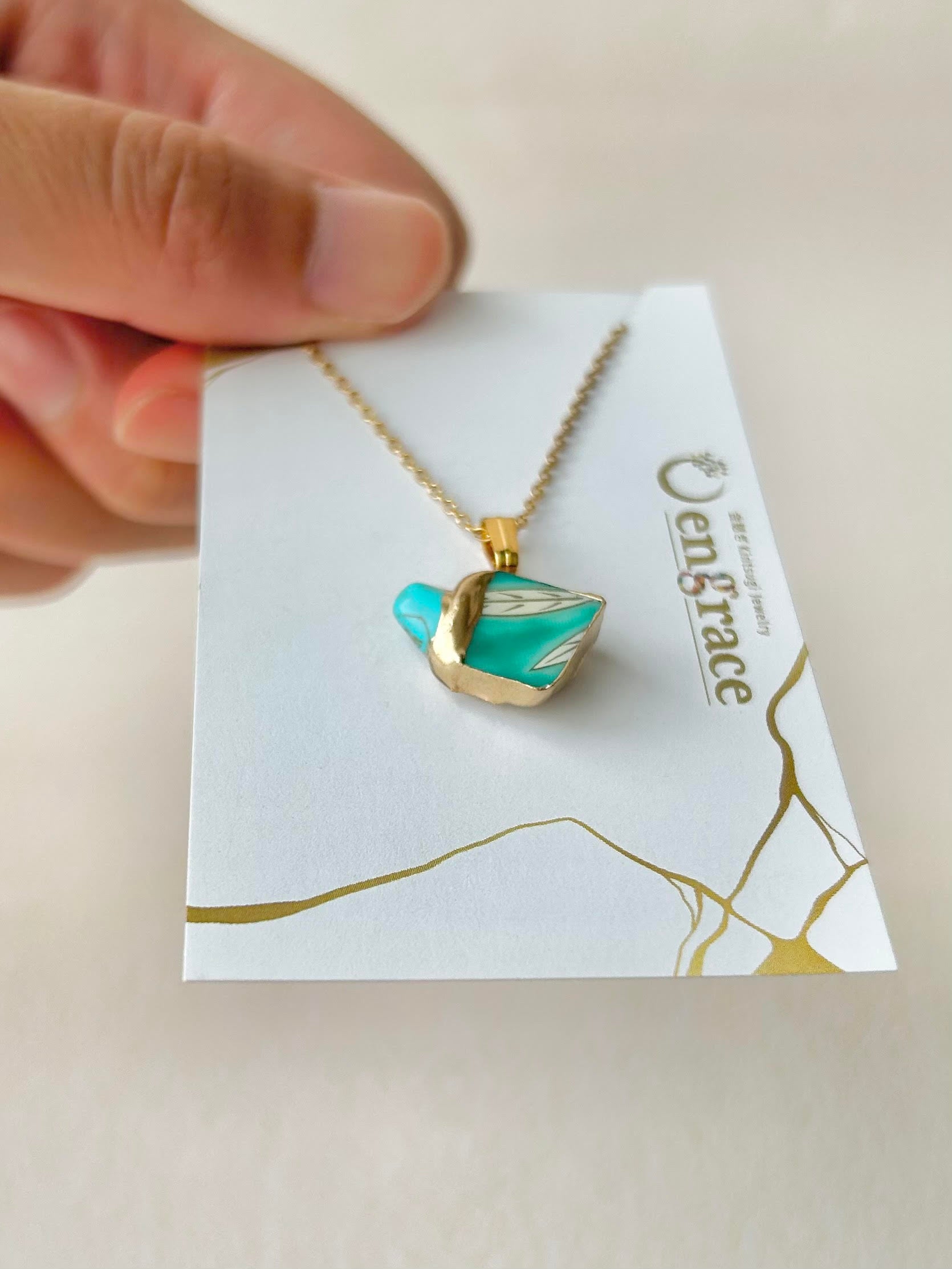 有田焼 金継ぎ ネックレス サージカルステンレスチェーン アレルギー対応 18K 緑 リーフ柄 ターコイズ 天然石 伝統工芸 #292
