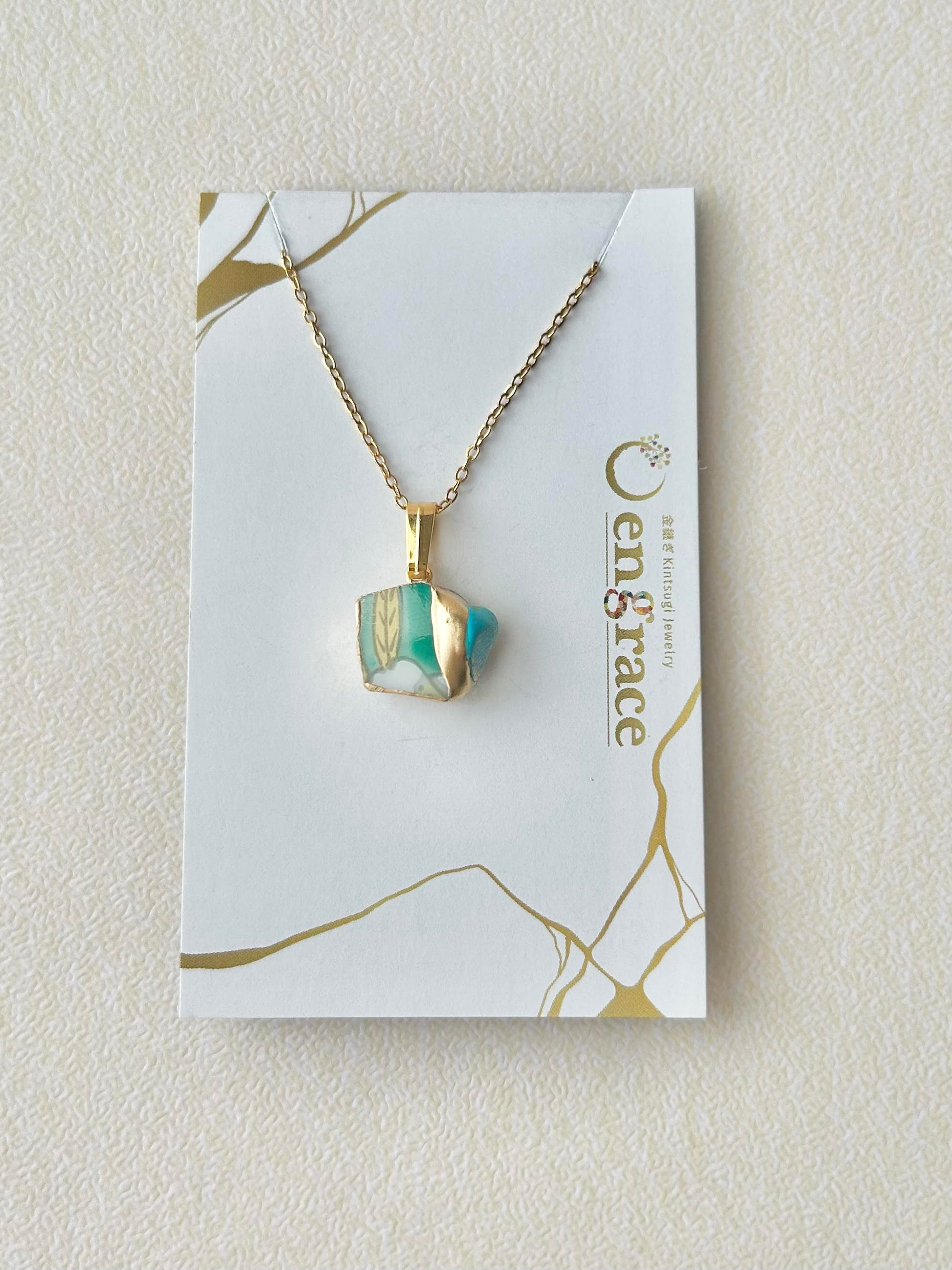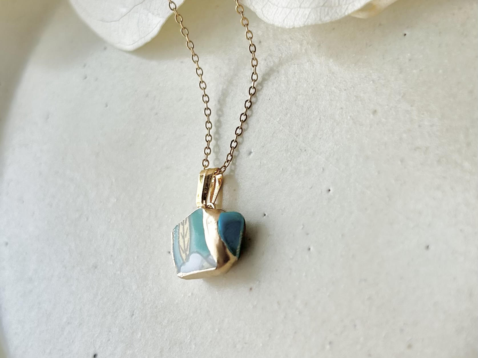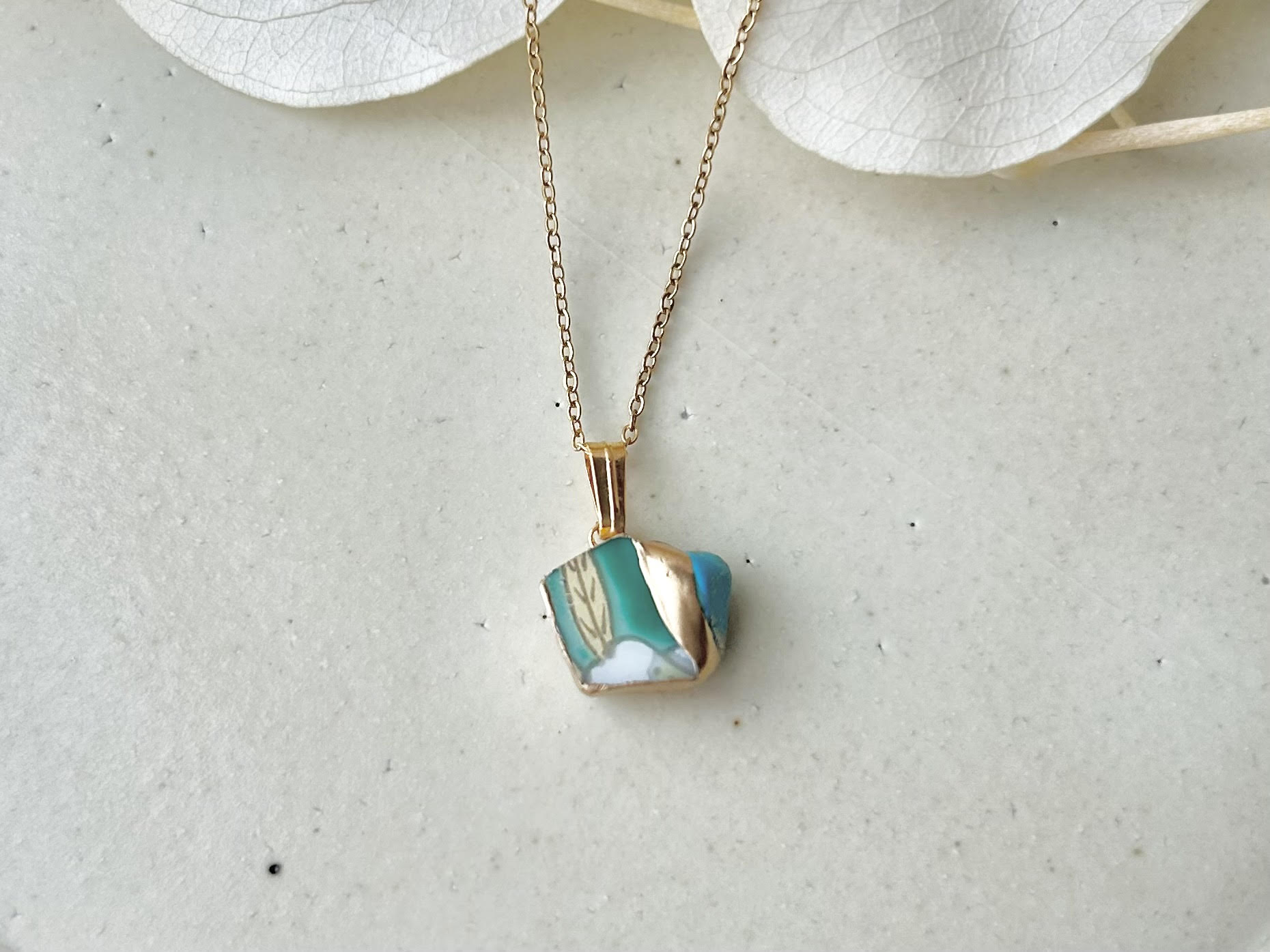 有田焼 金継ぎ ネックレス サージカルステンレスチェーン アレルギー対応 18K 緑 リーフ柄 ターコイズ 天然石 伝統工芸 #296