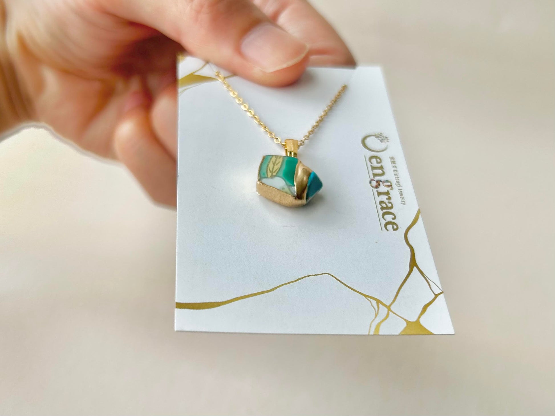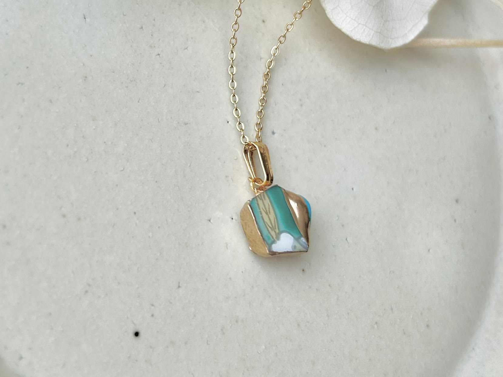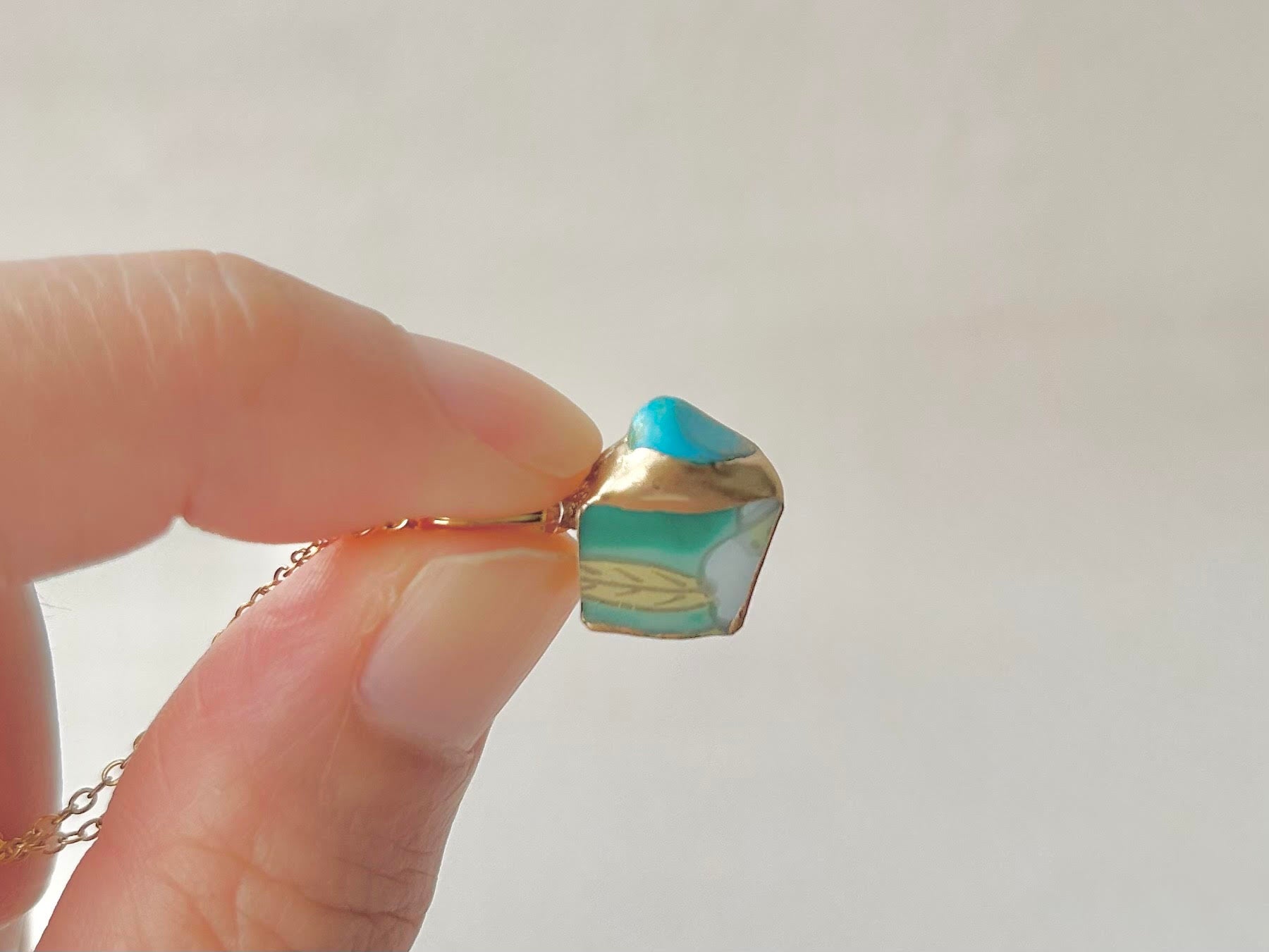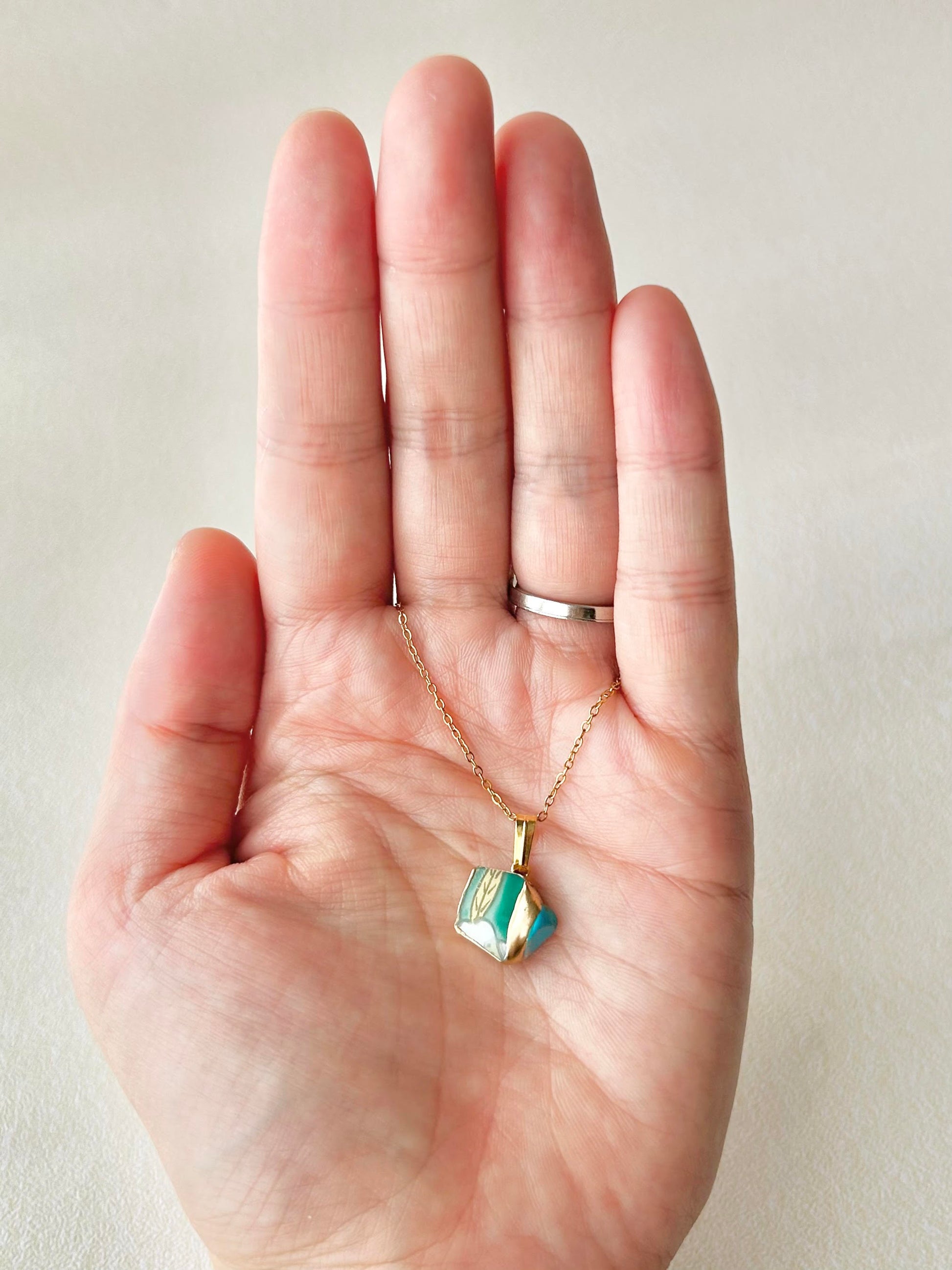 有田焼 金継ぎ ネックレス サージカルステンレスチェーン アレルギー対応 18K 緑 リーフ柄 ターコイズ 天然石 伝統工芸 #296
