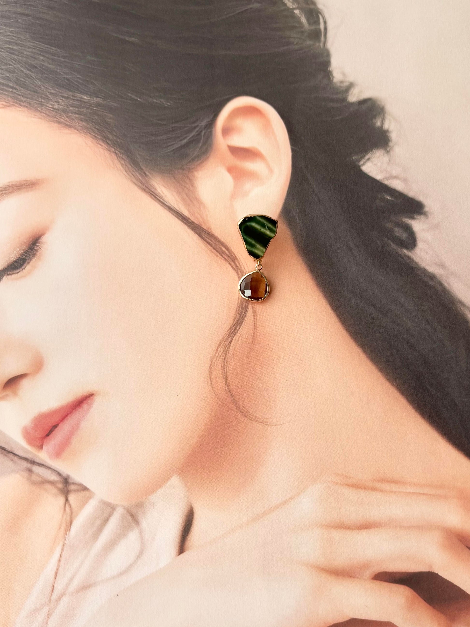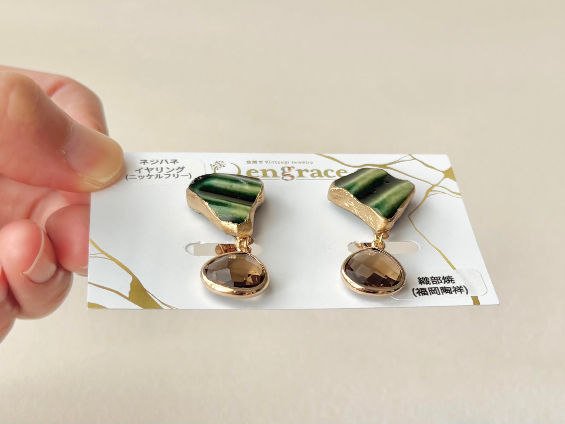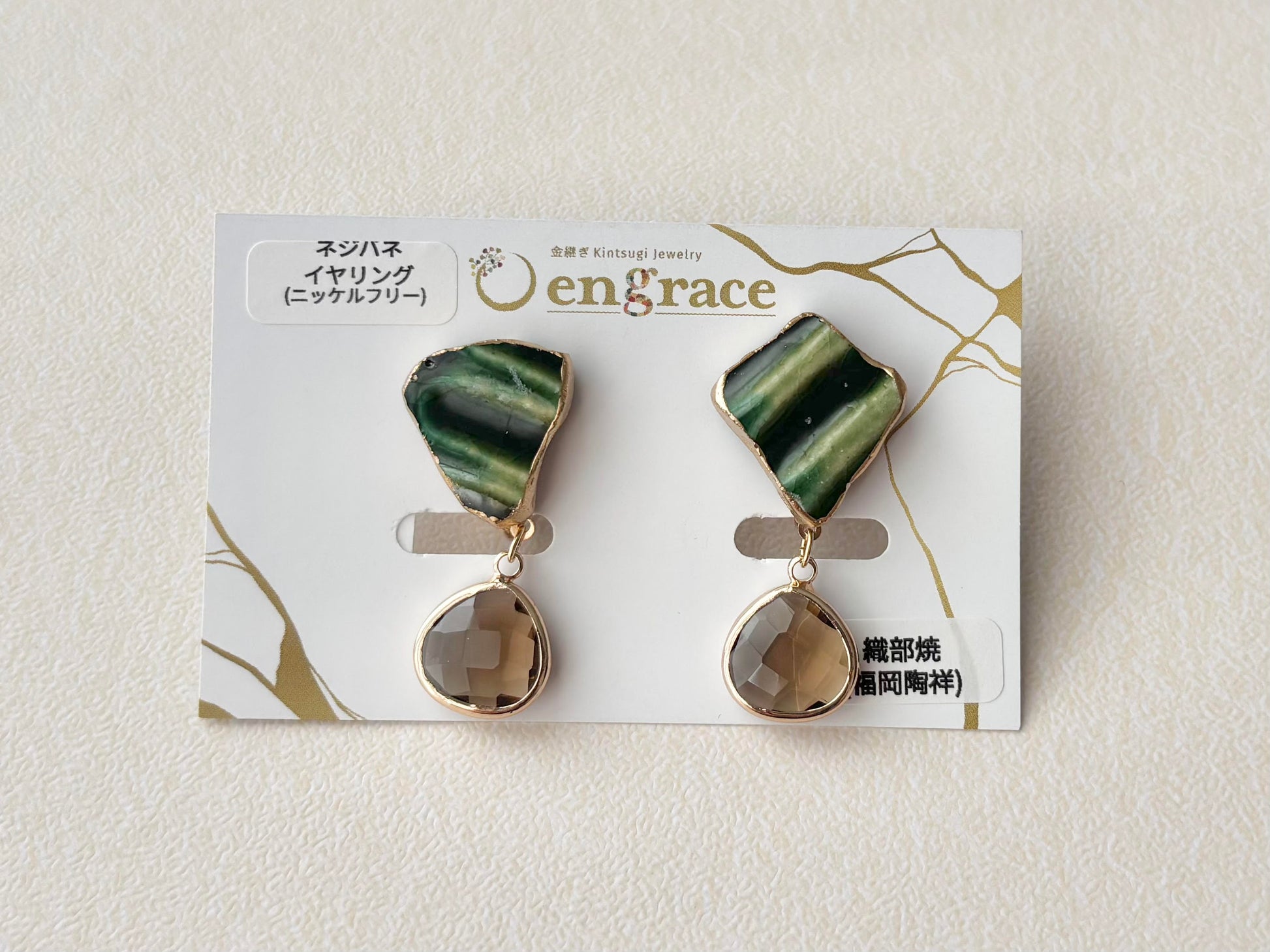 織部焼 金継ぎ ネジバネ式イヤリング 深い緑 茶色 揺れる 伝統工芸 #336