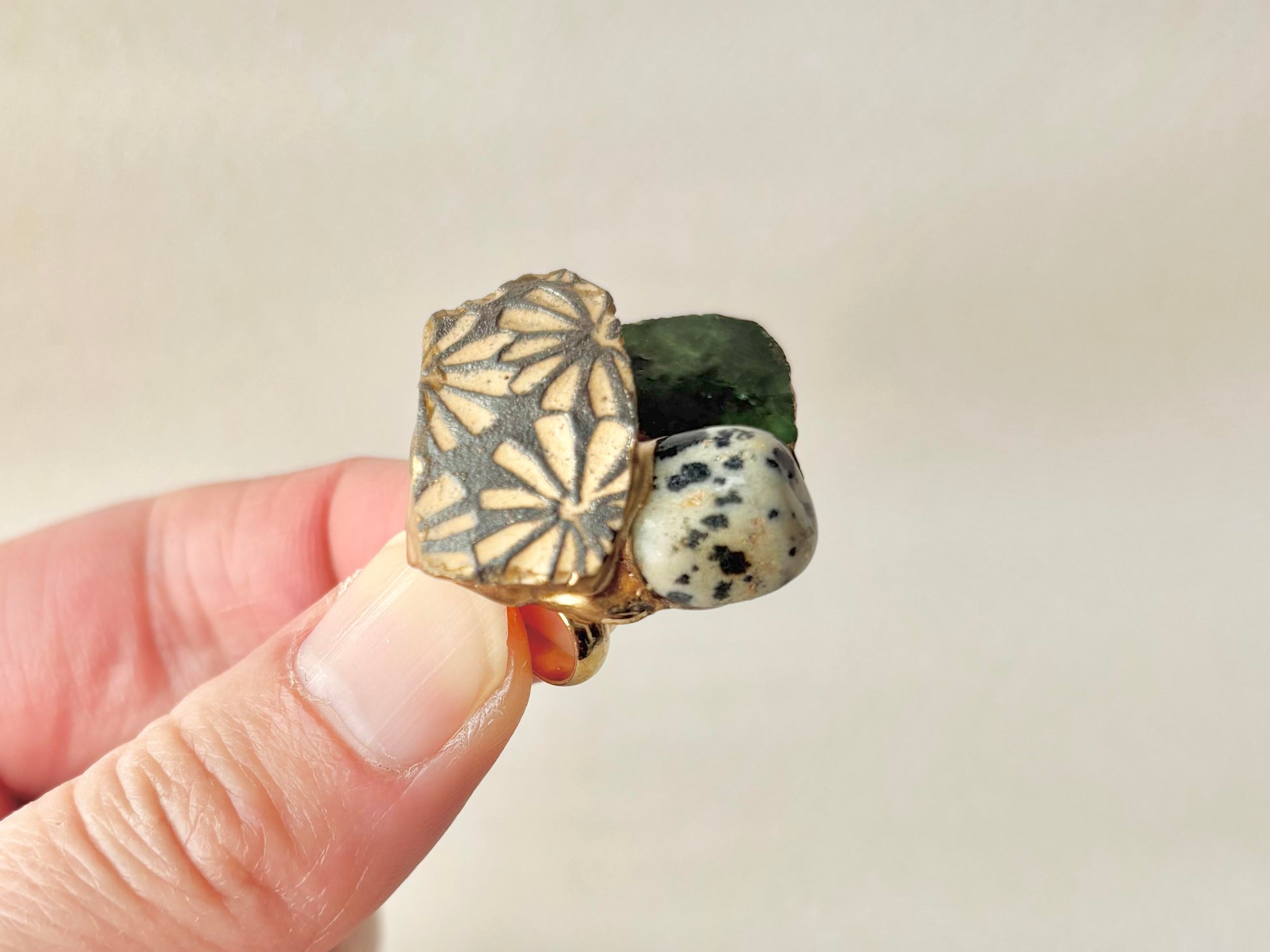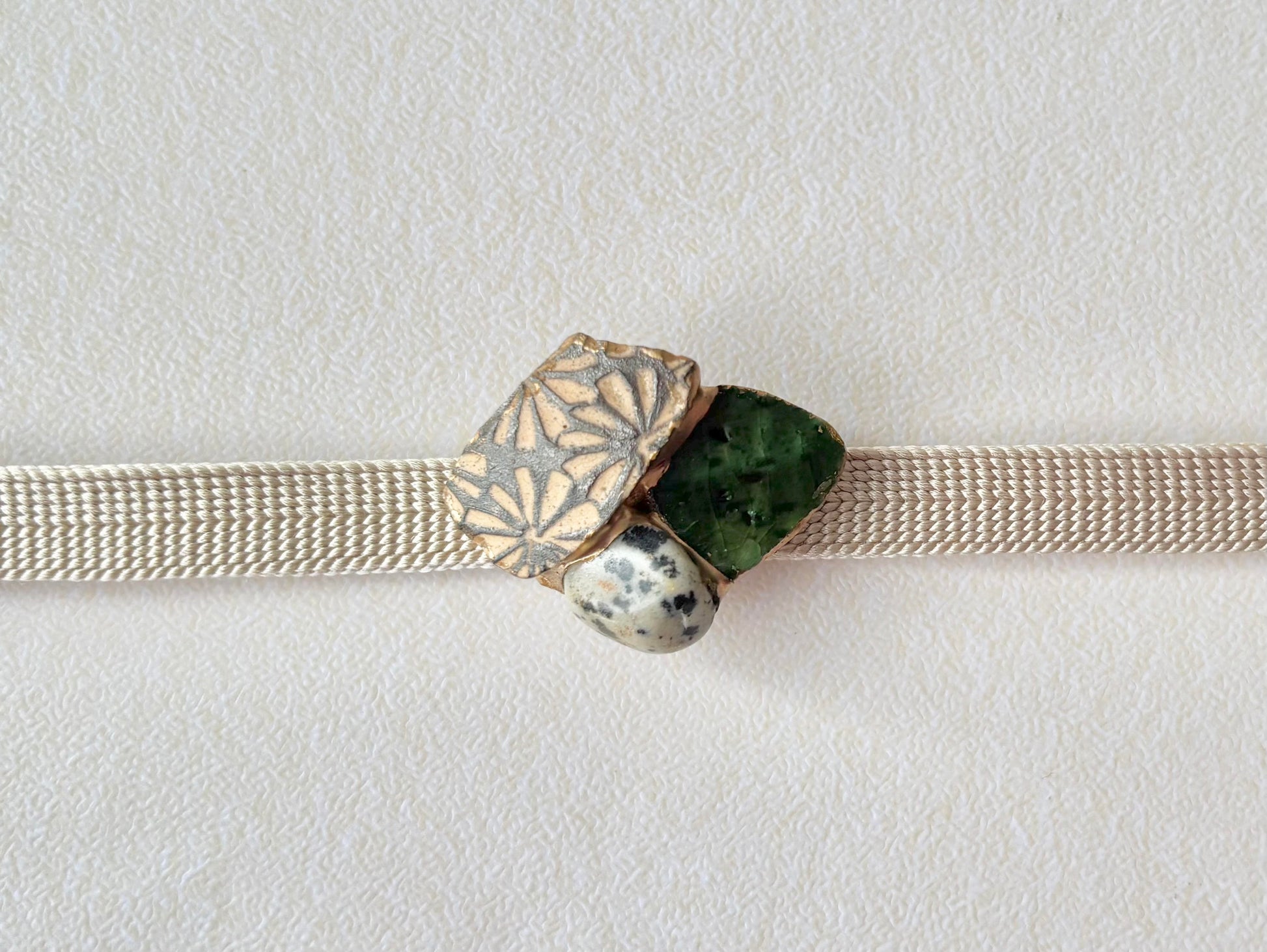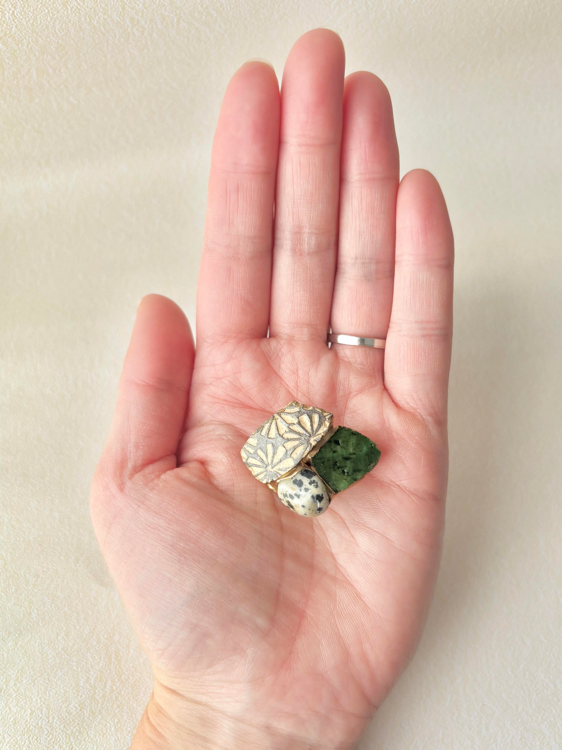 織部焼の深い緑の陶片と京焼の花柄の陶片にダルメシアンジャスパーを合わせました。