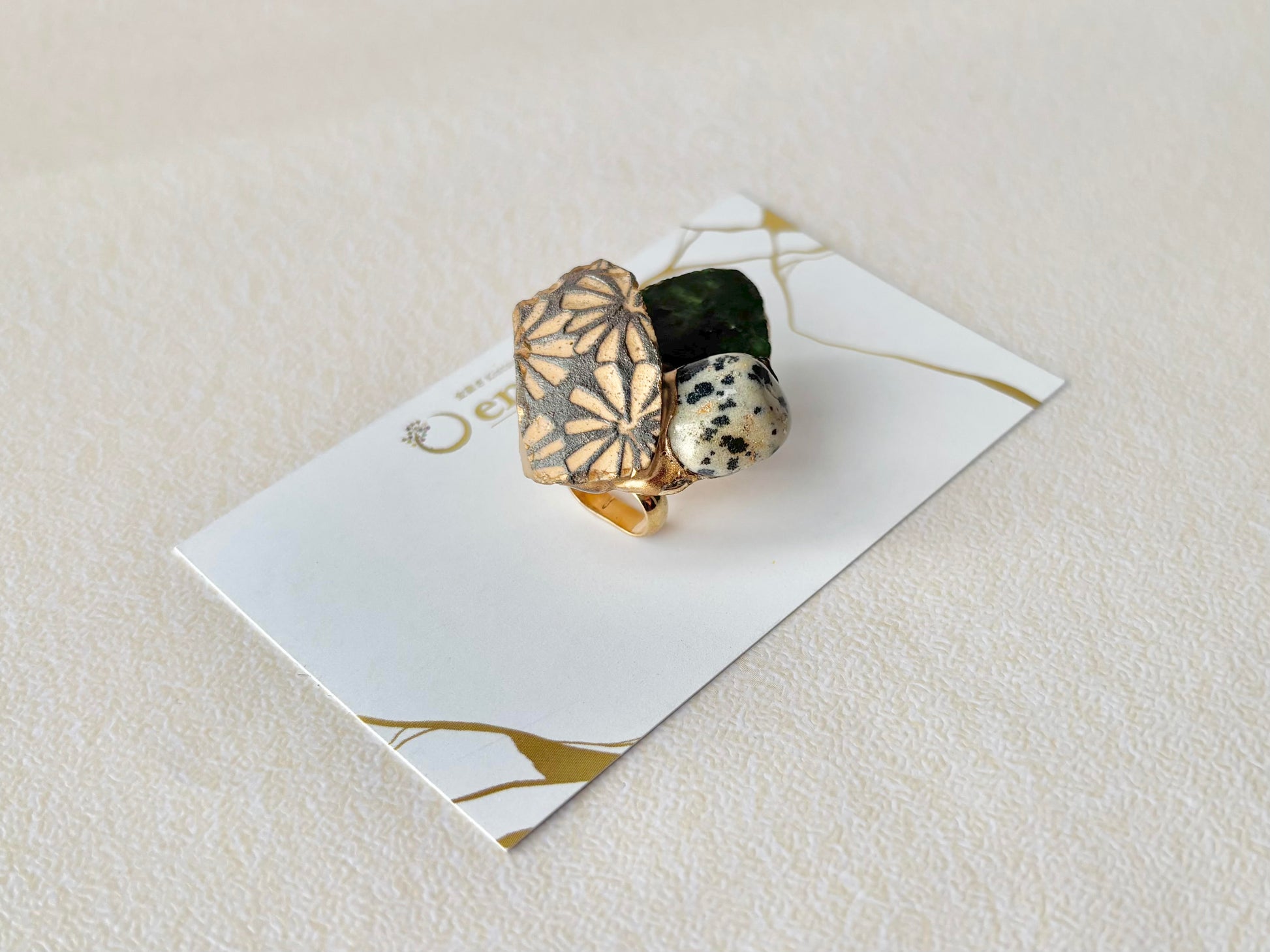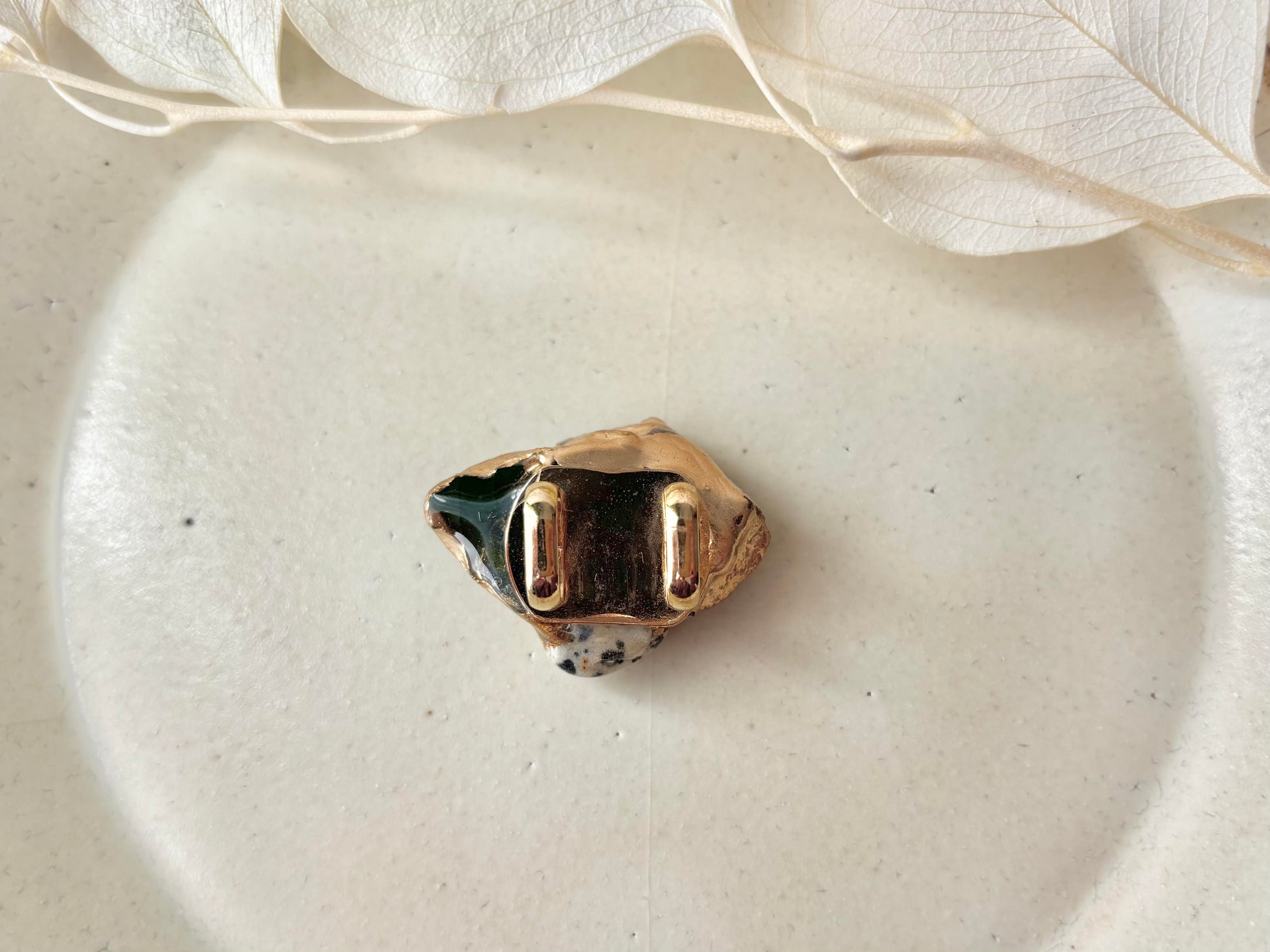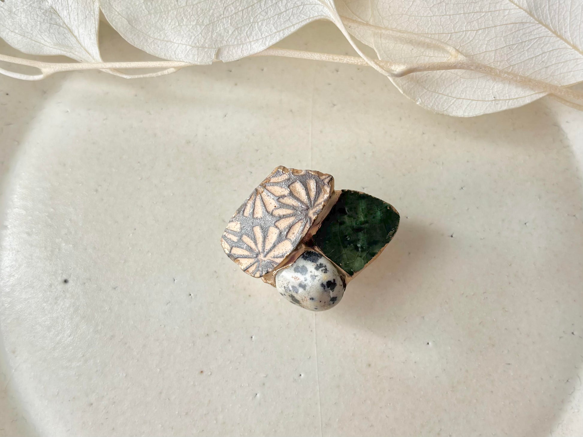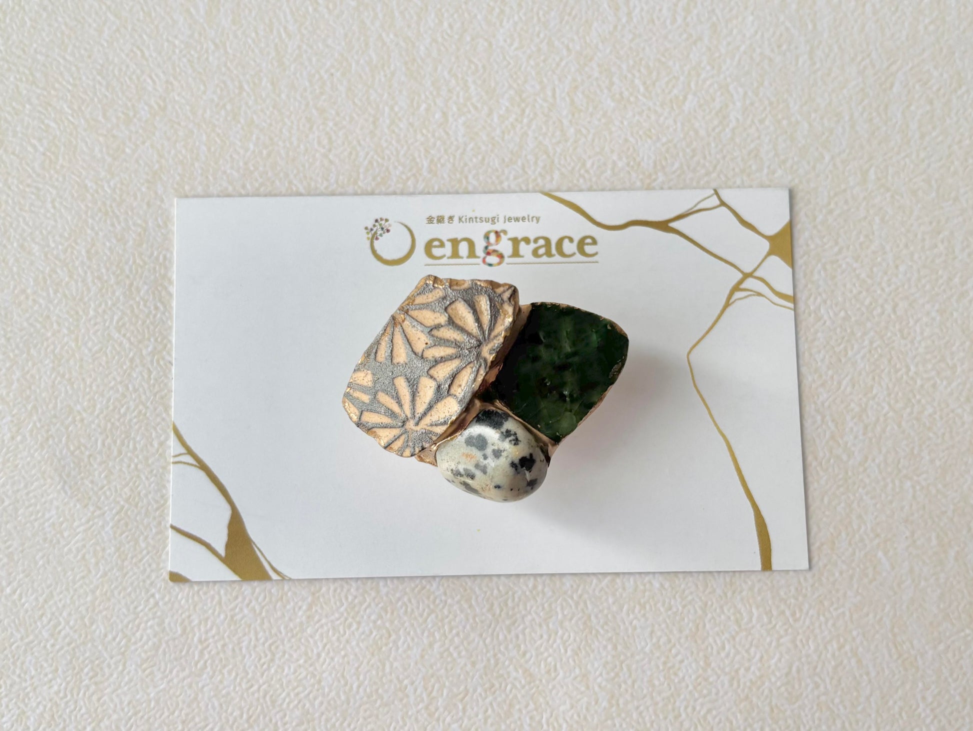 織部焼 京焼 金継ぎ 帯留 深い緑 グレー 花柄 ダルメシアンジャスパー 天然石 伝統工芸 #449