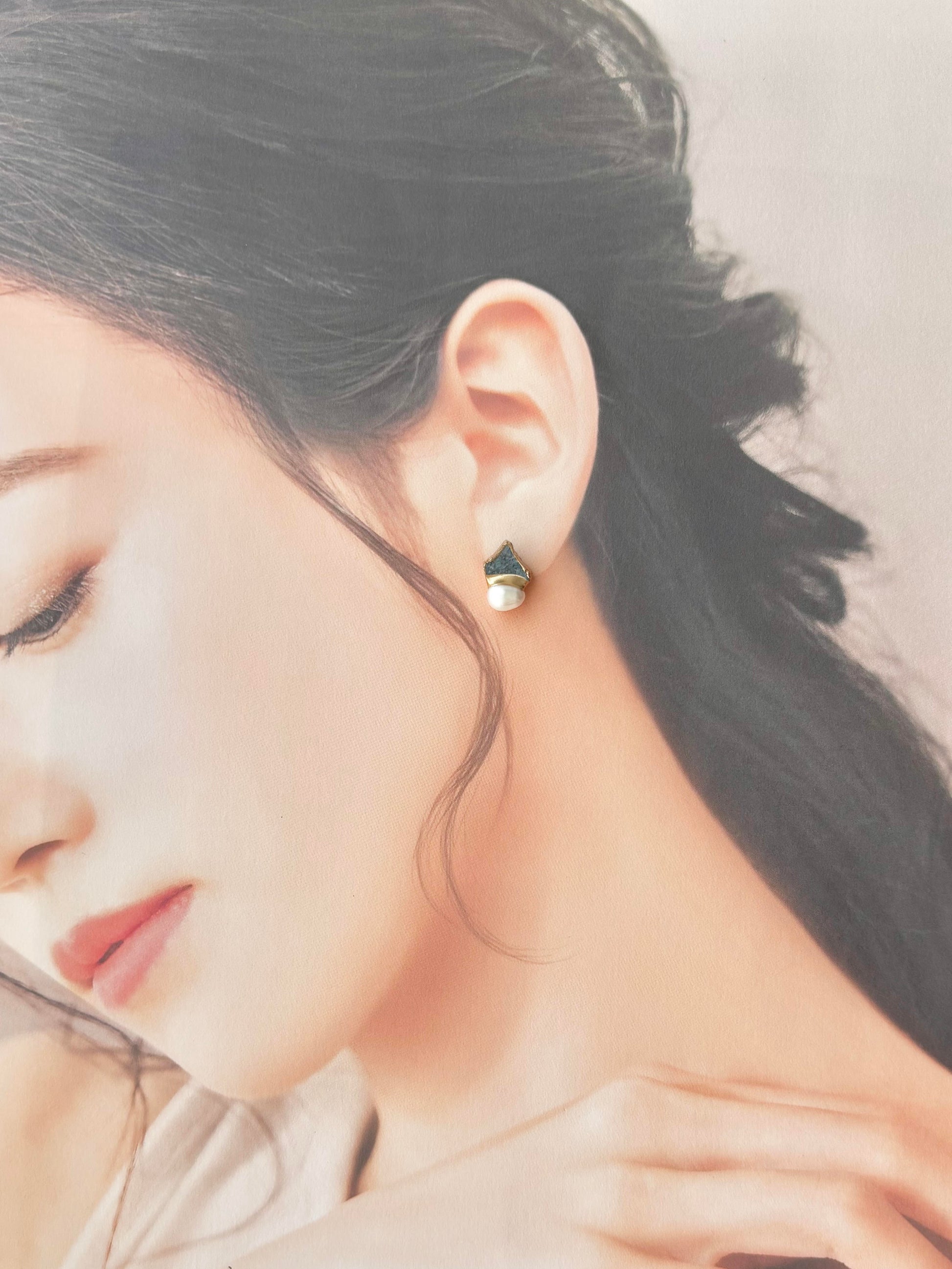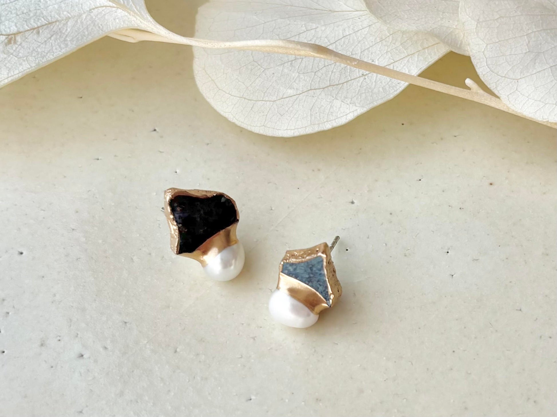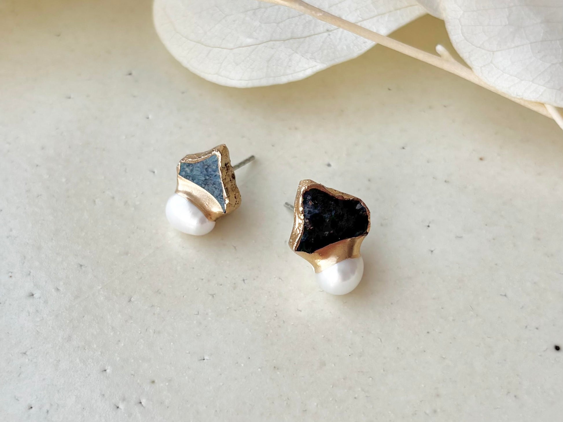 萩焼 金継ぎ サージカルステンレスピアス 藍色 淡水パール 天然石  伝統工芸 #375