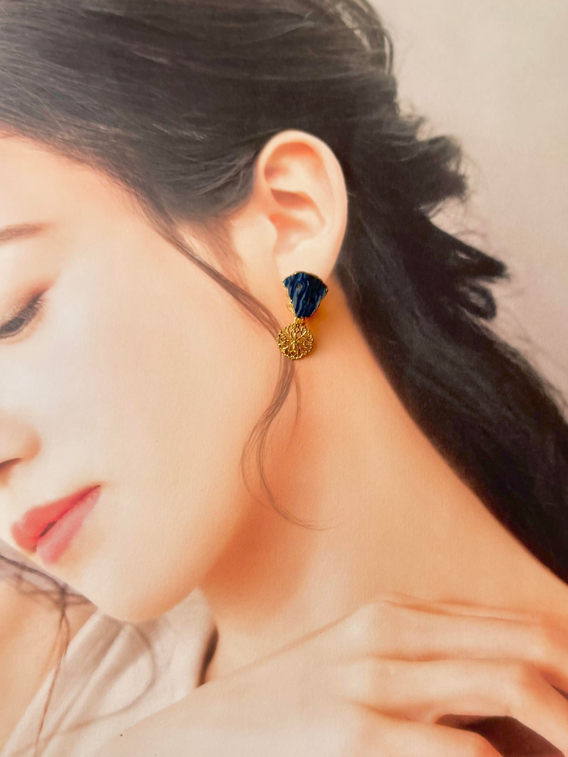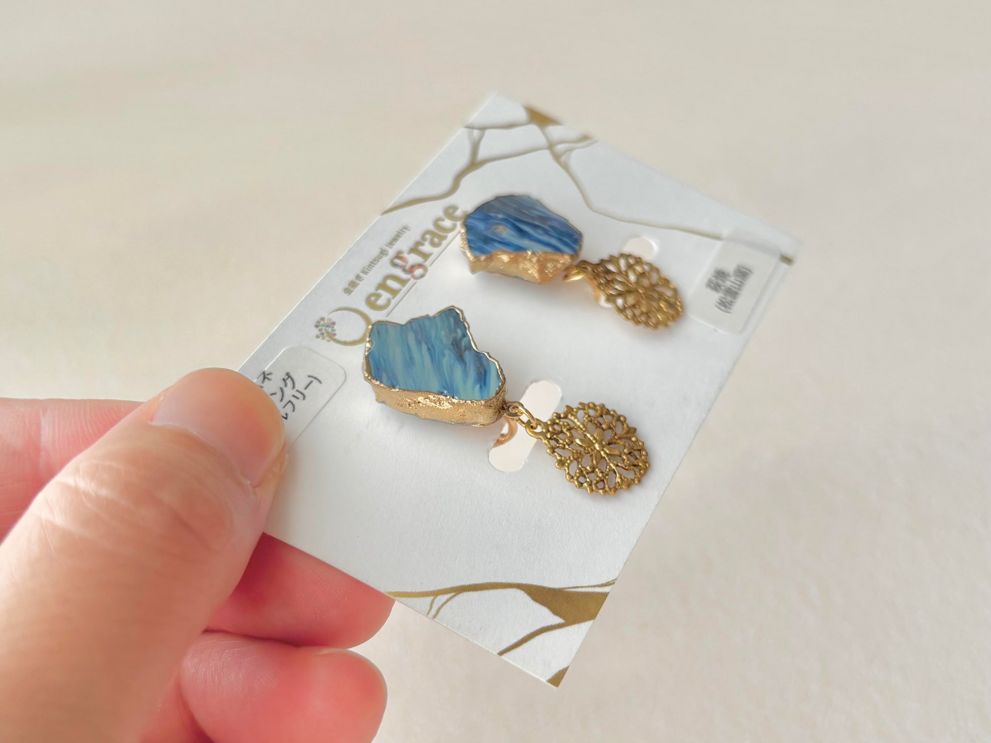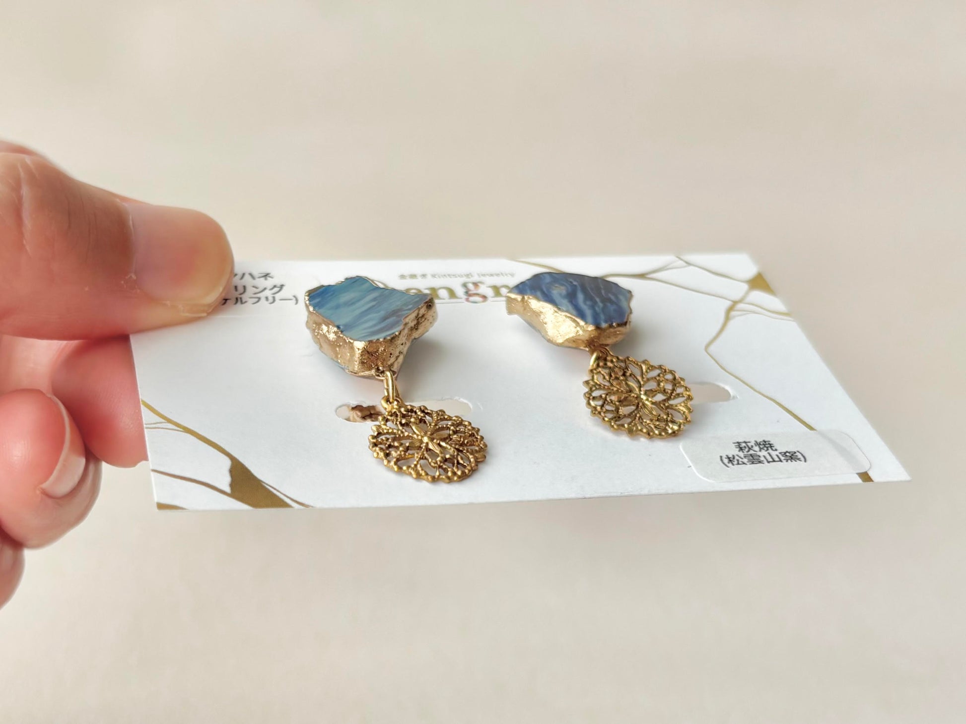 萩焼 金継ぎ ネジバネ式イヤリング 藍色 ゴールド 揺れる  伝統工芸 #334