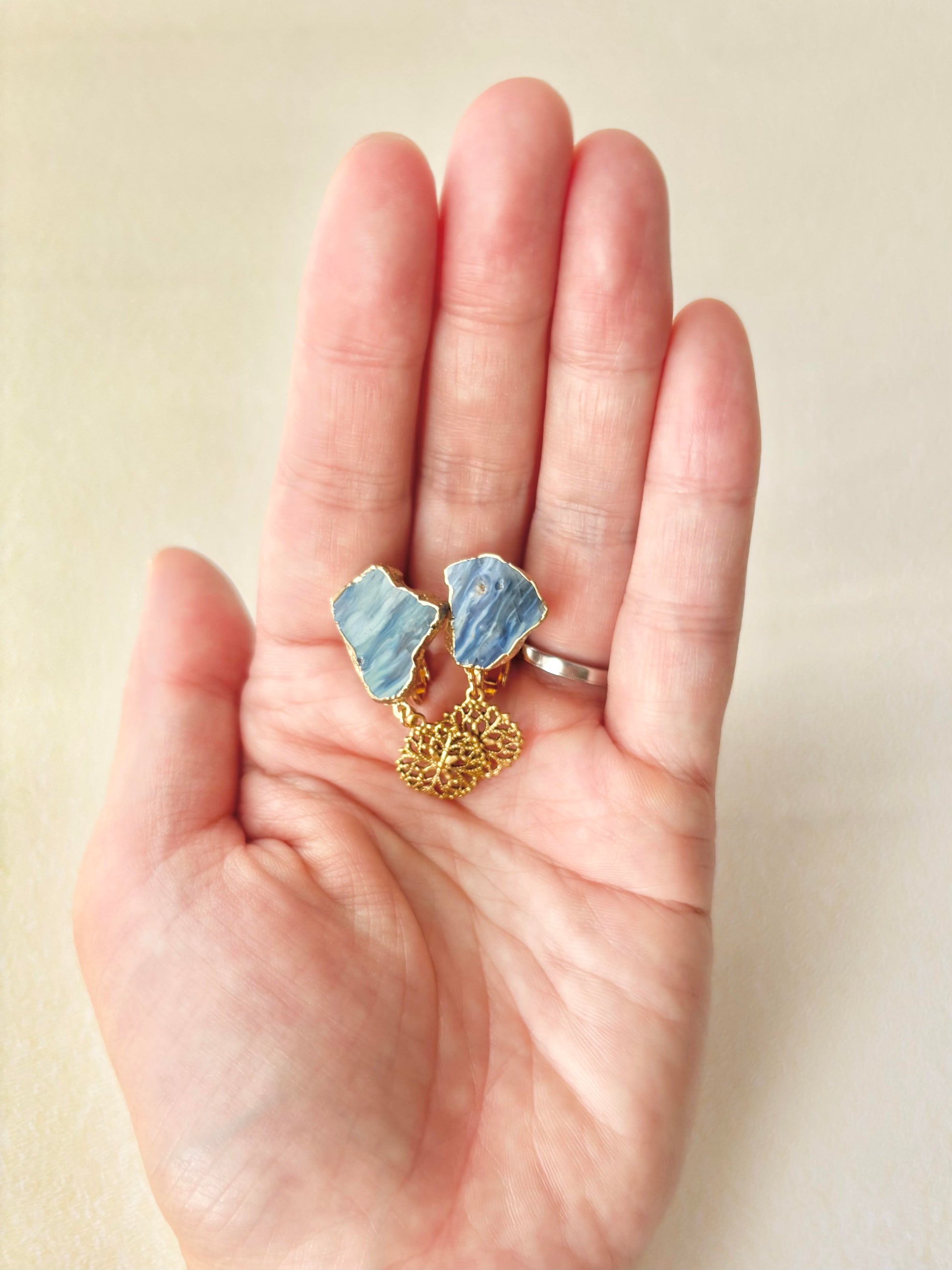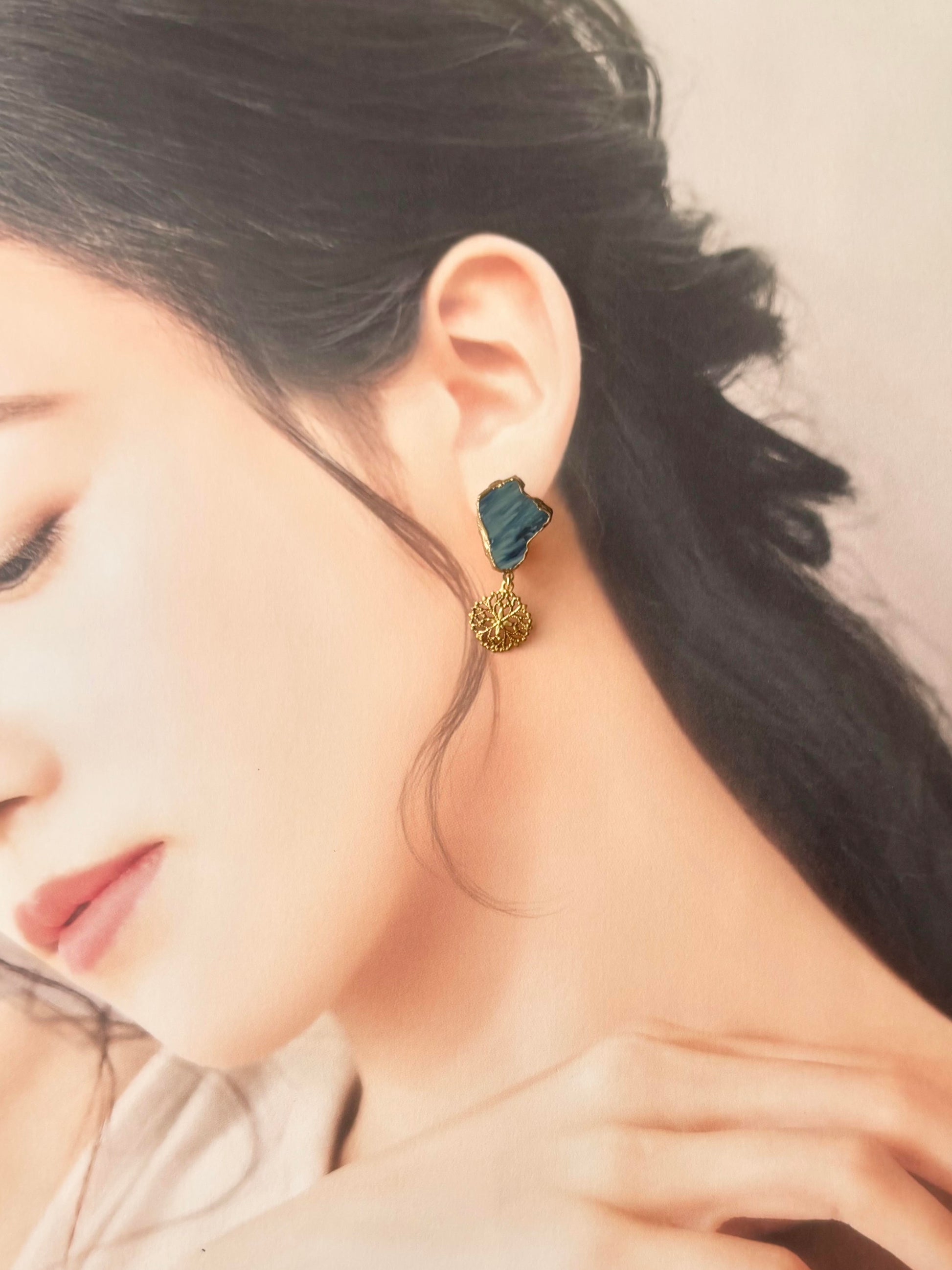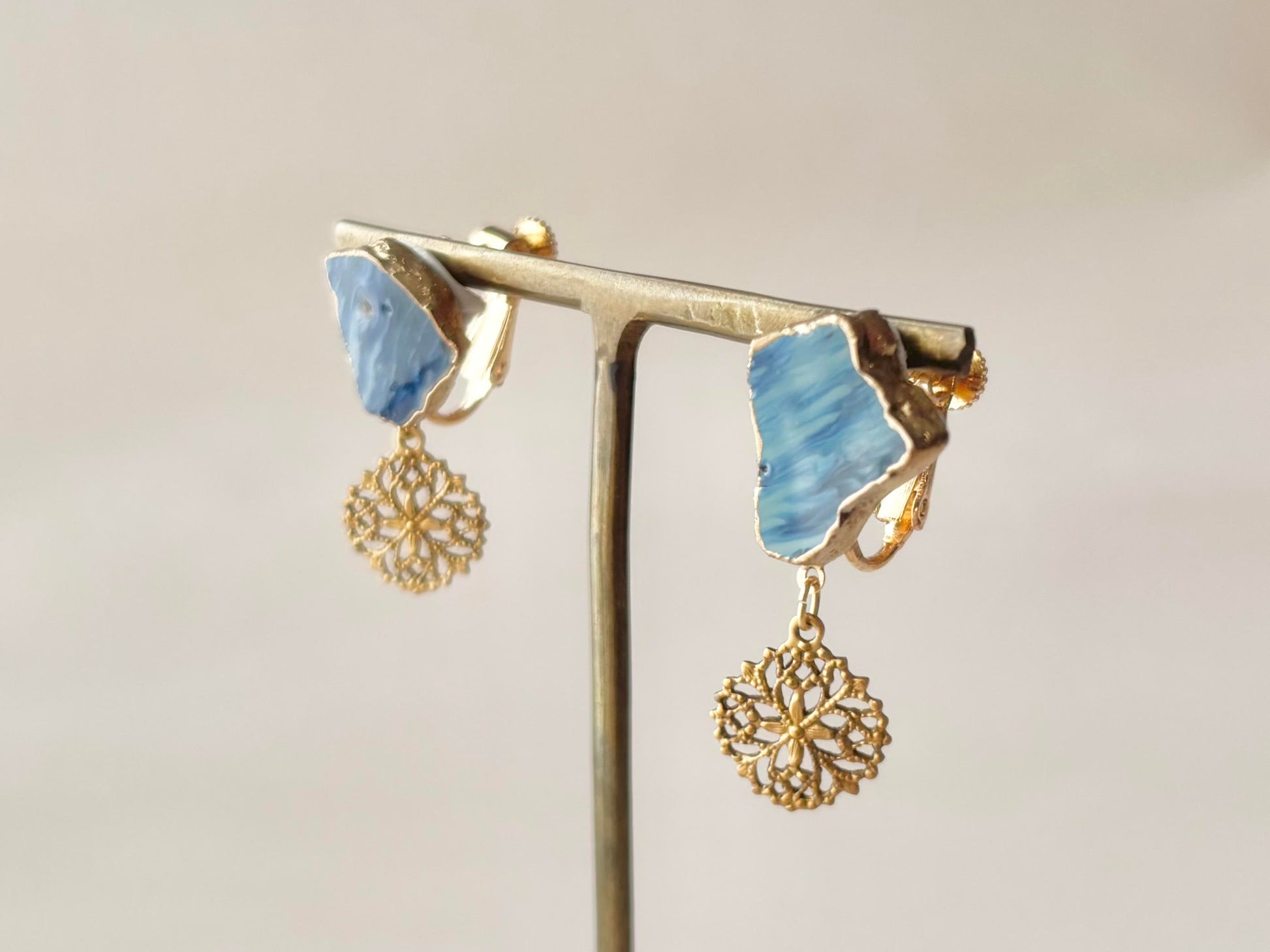 萩焼 金継ぎ ネジバネ式イヤリング 藍色 ゴールド 揺れる  伝統工芸 #334