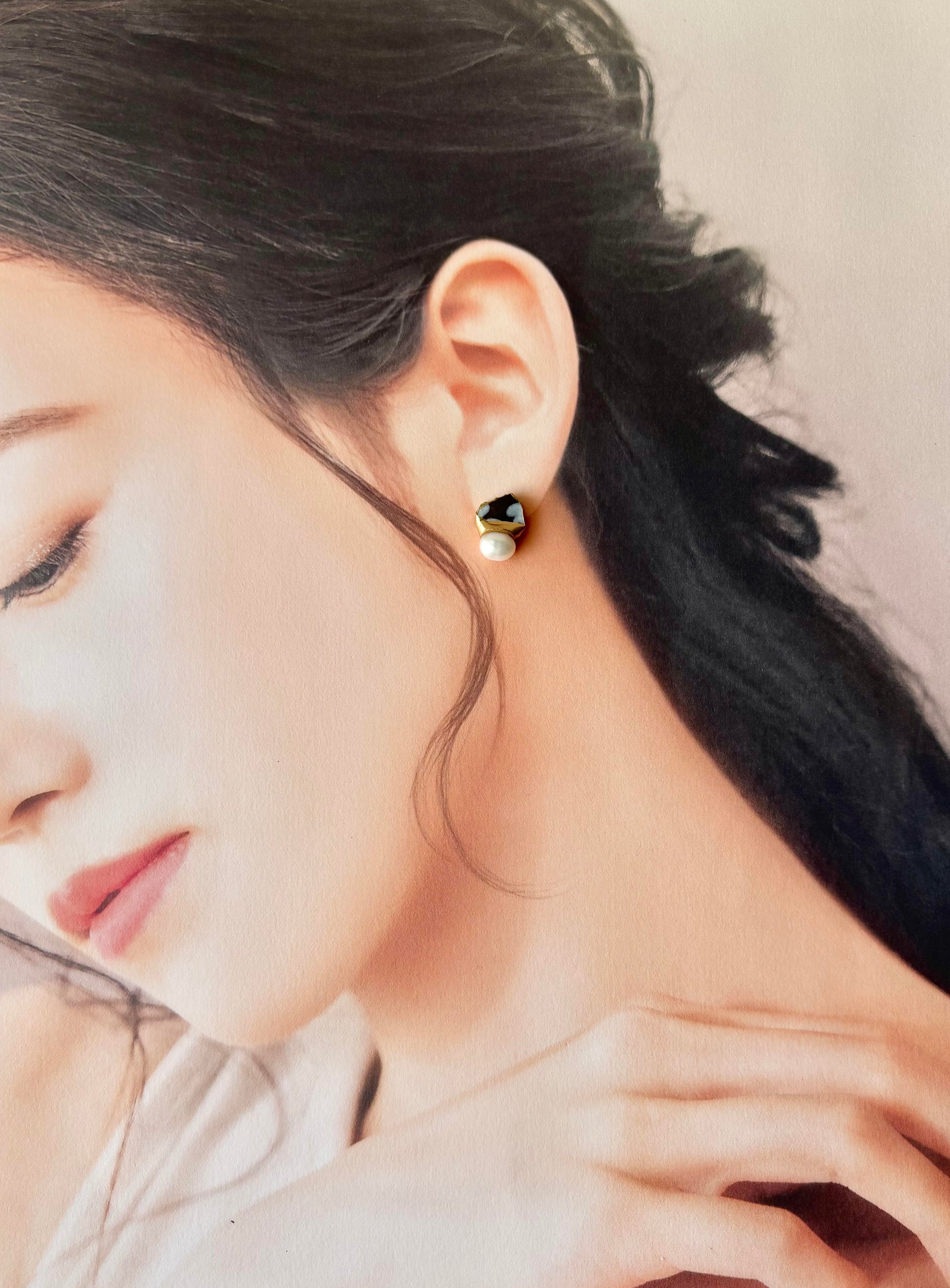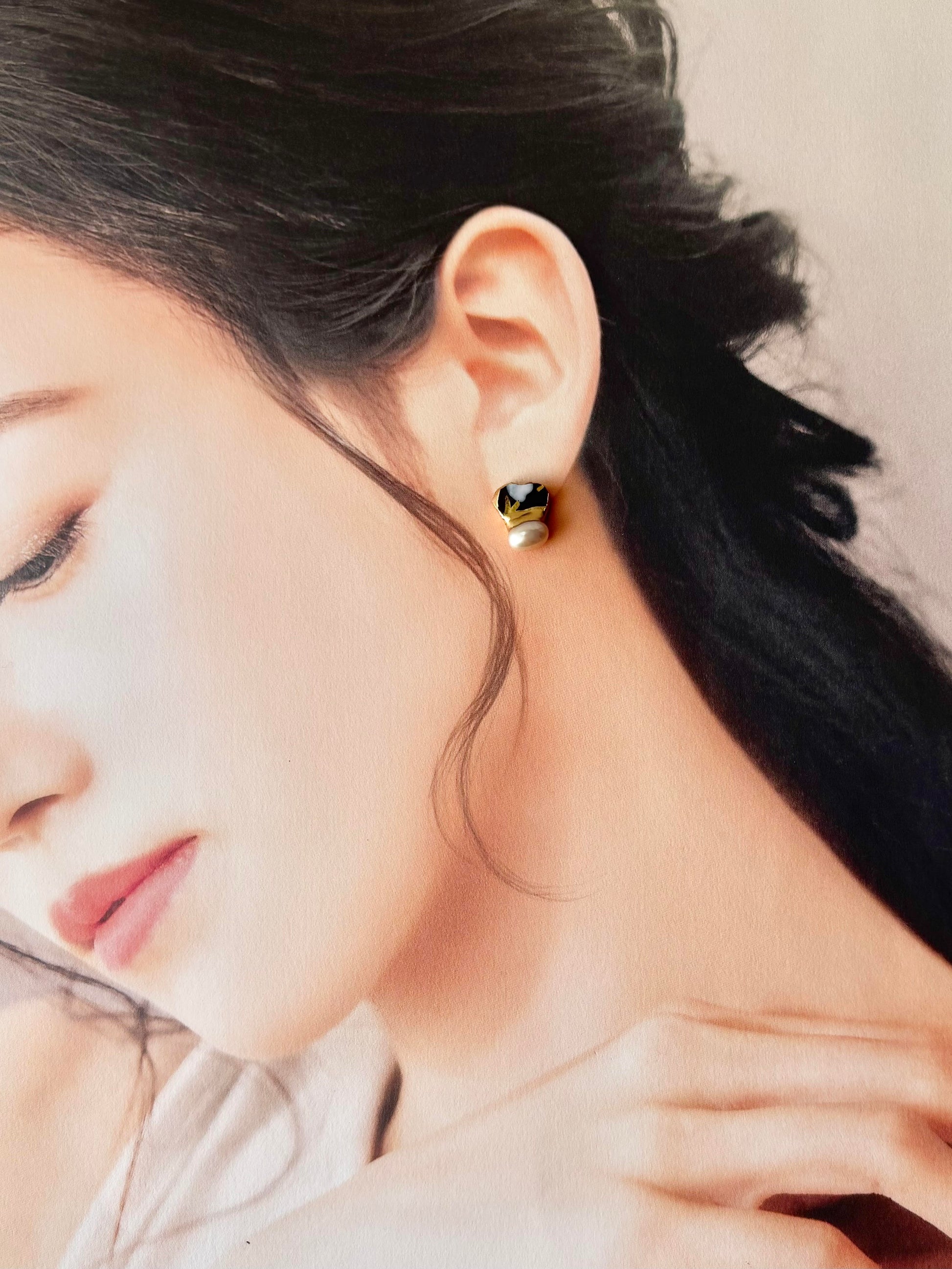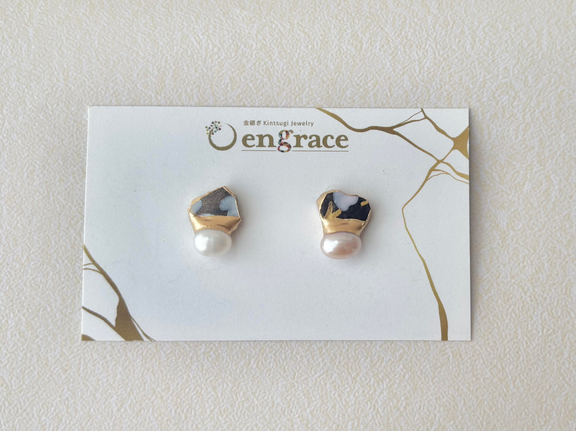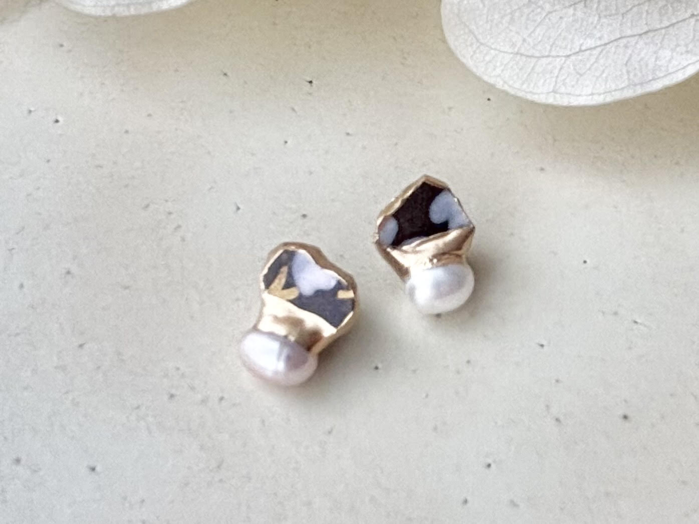 【金具が選べる】京焼 金継ぎ ピアス イヤリング 手書き 絵付け 花柄 黒色 淡水パール 天然石 伝統工芸 #337