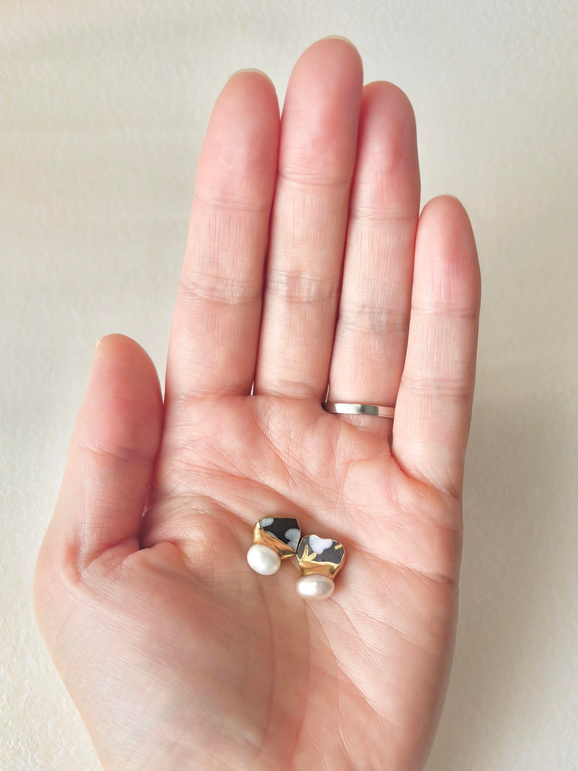 手書きで花柄の絵付けがされた上品な陶片に淡水パールを合わせました。