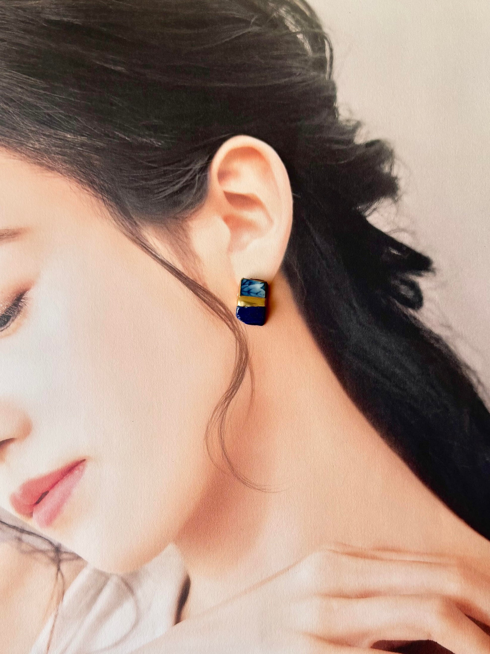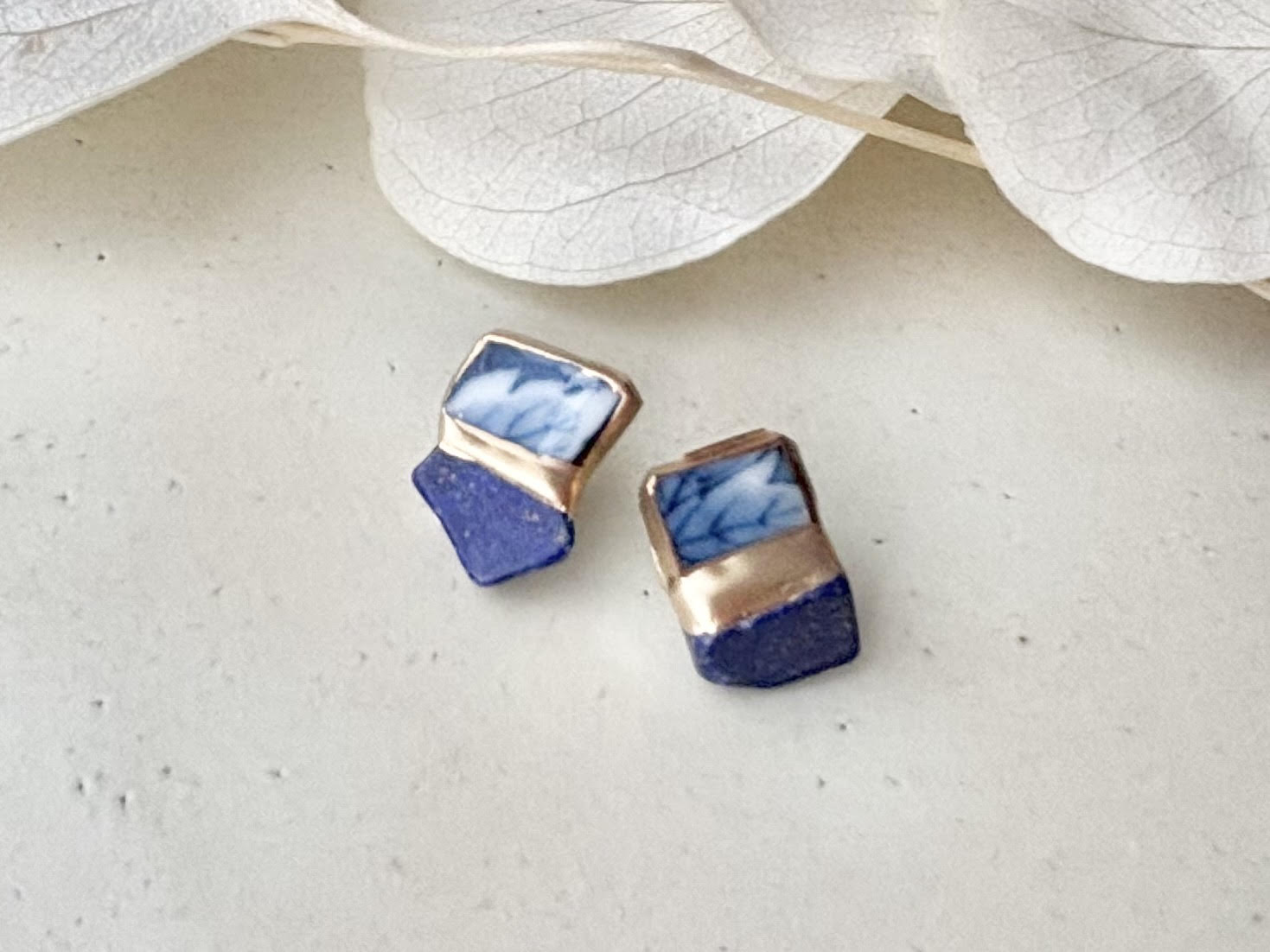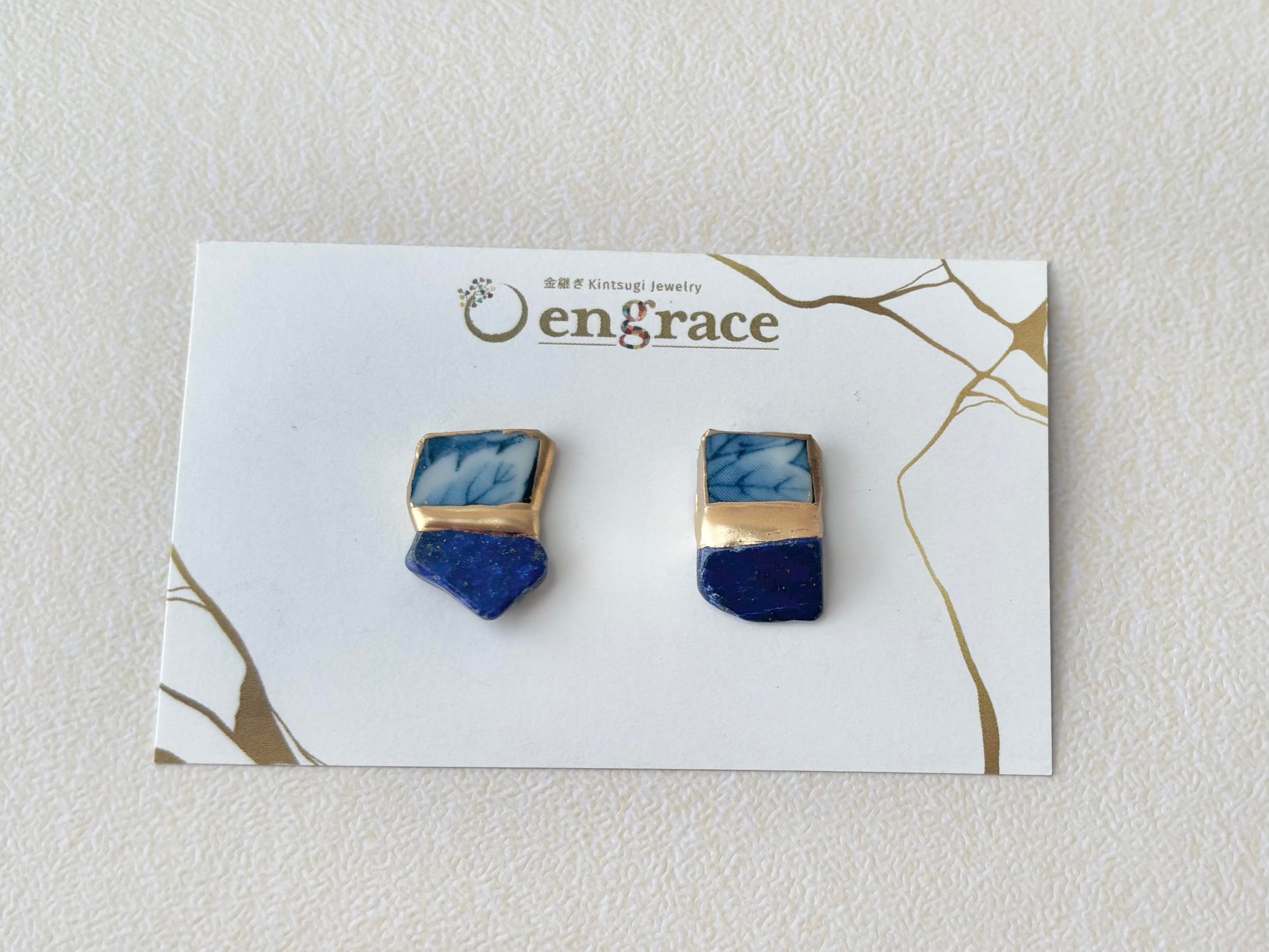 【金具が選べる】有田焼 金継ぎ ピアス イヤリング 青 リーフ柄 ラピスラズリ 天然石 伝統工芸 #338