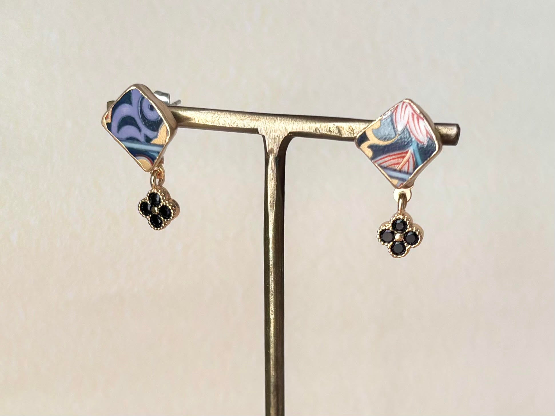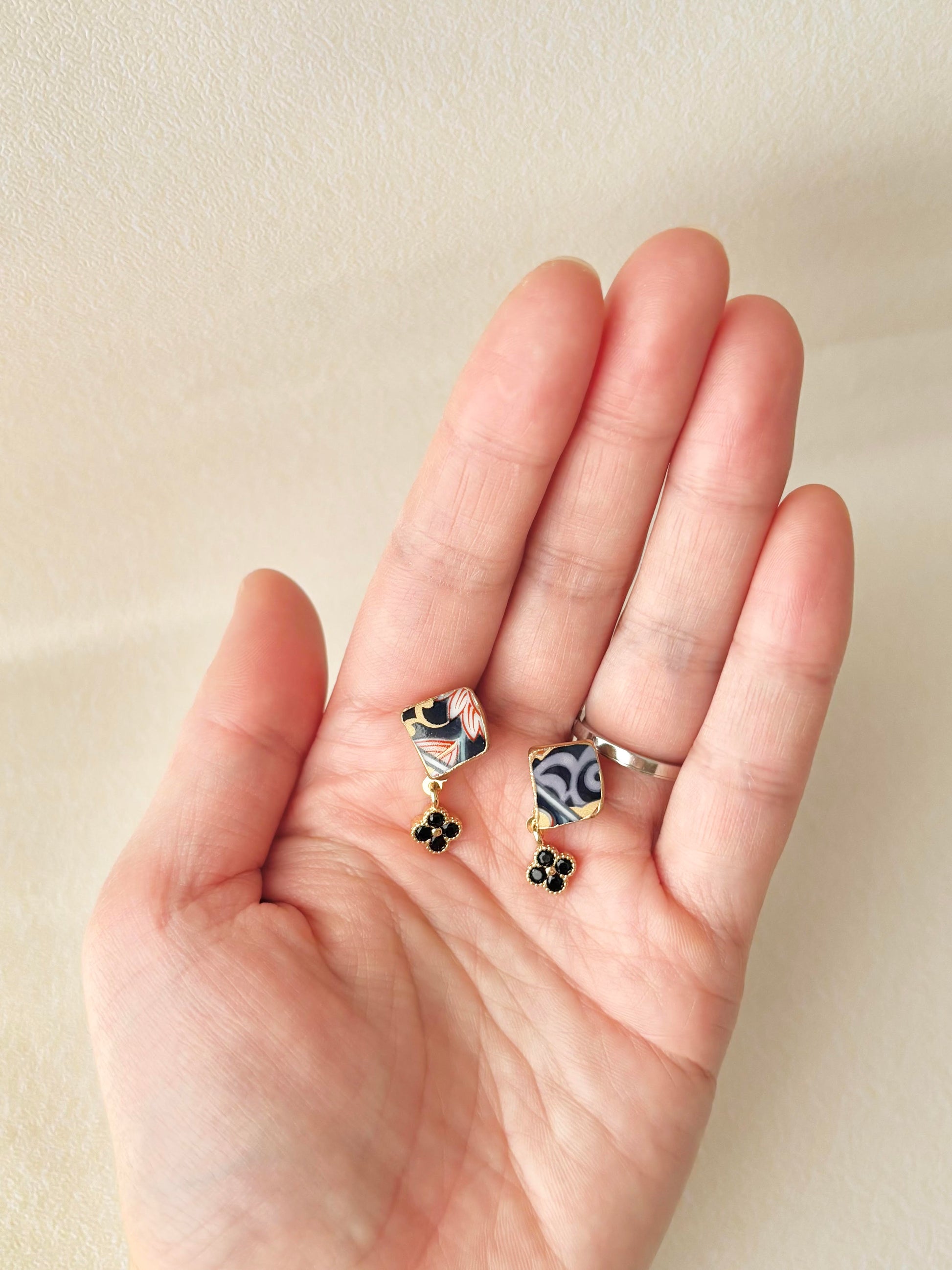 リーフ柄や和柄が描かれた上品な陶片に花の形のチャームを合わせました。