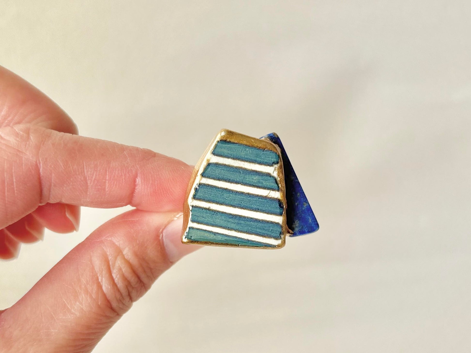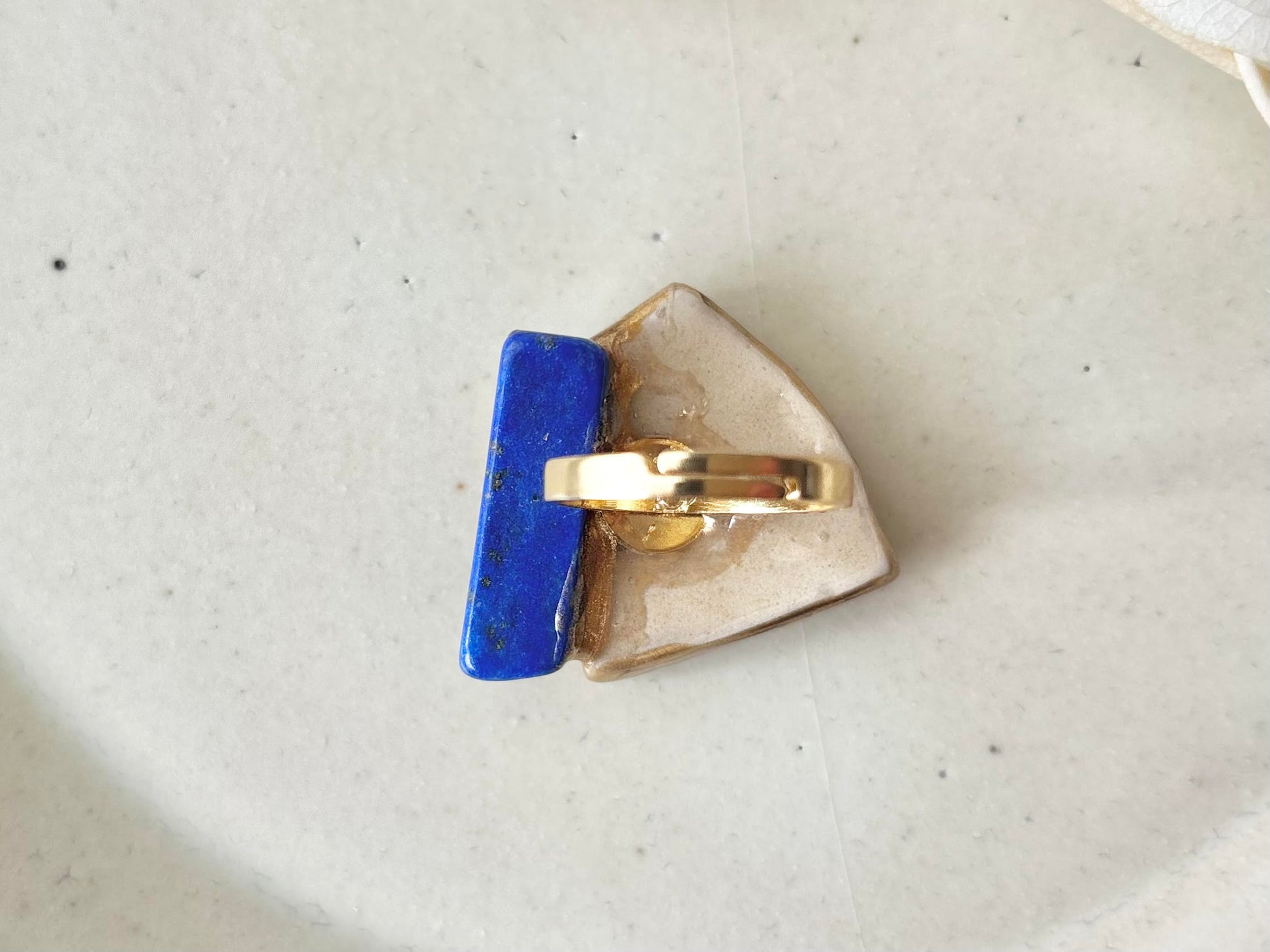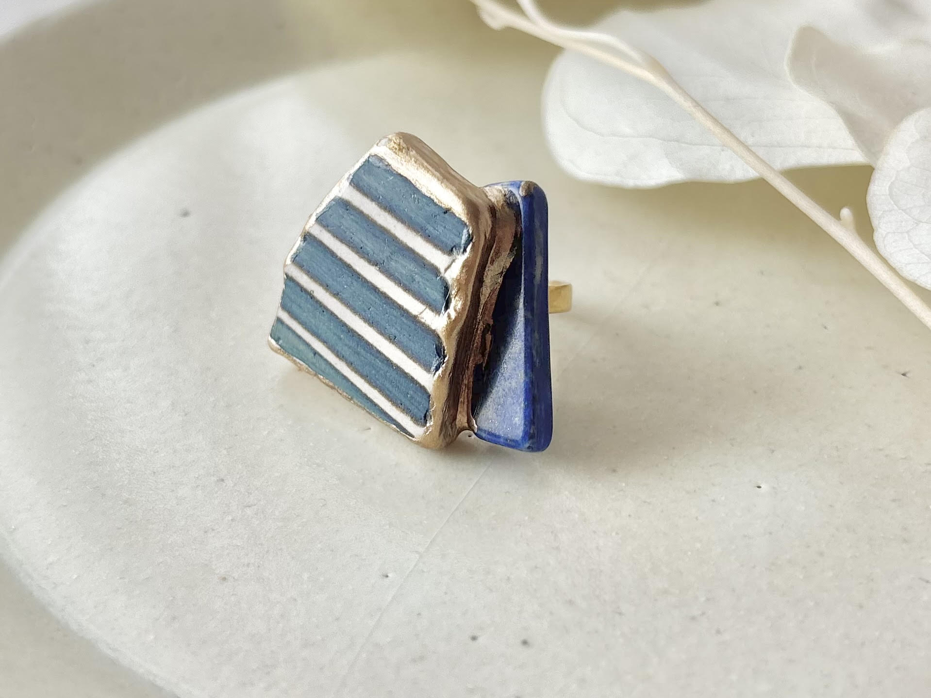 シー陶器 金継ぎ リング ステンレス 18Kコーティング フリーサイズ 青 ボーダー柄 ソーダライト 淡水パール 天然石 伝統工芸 #464