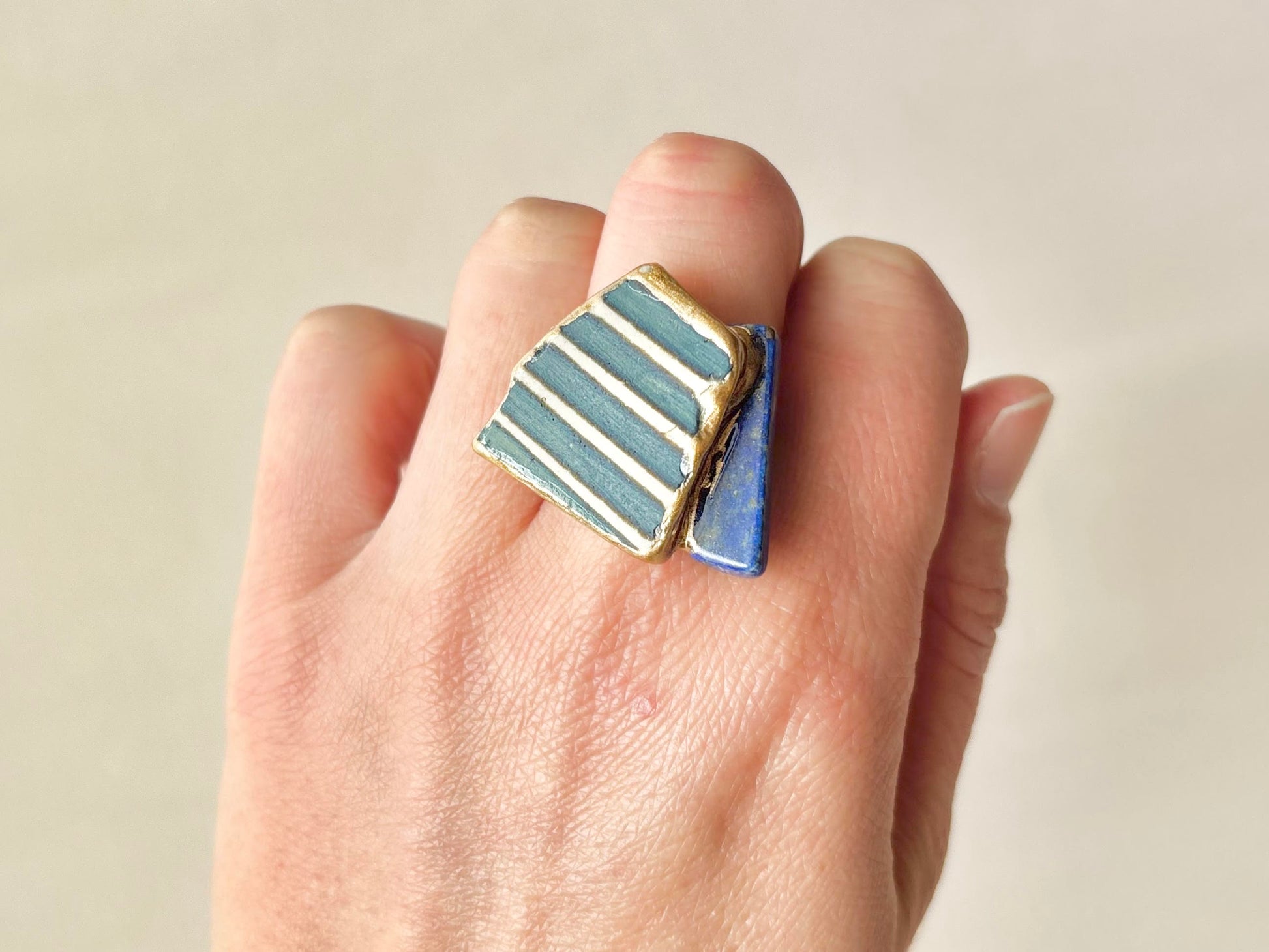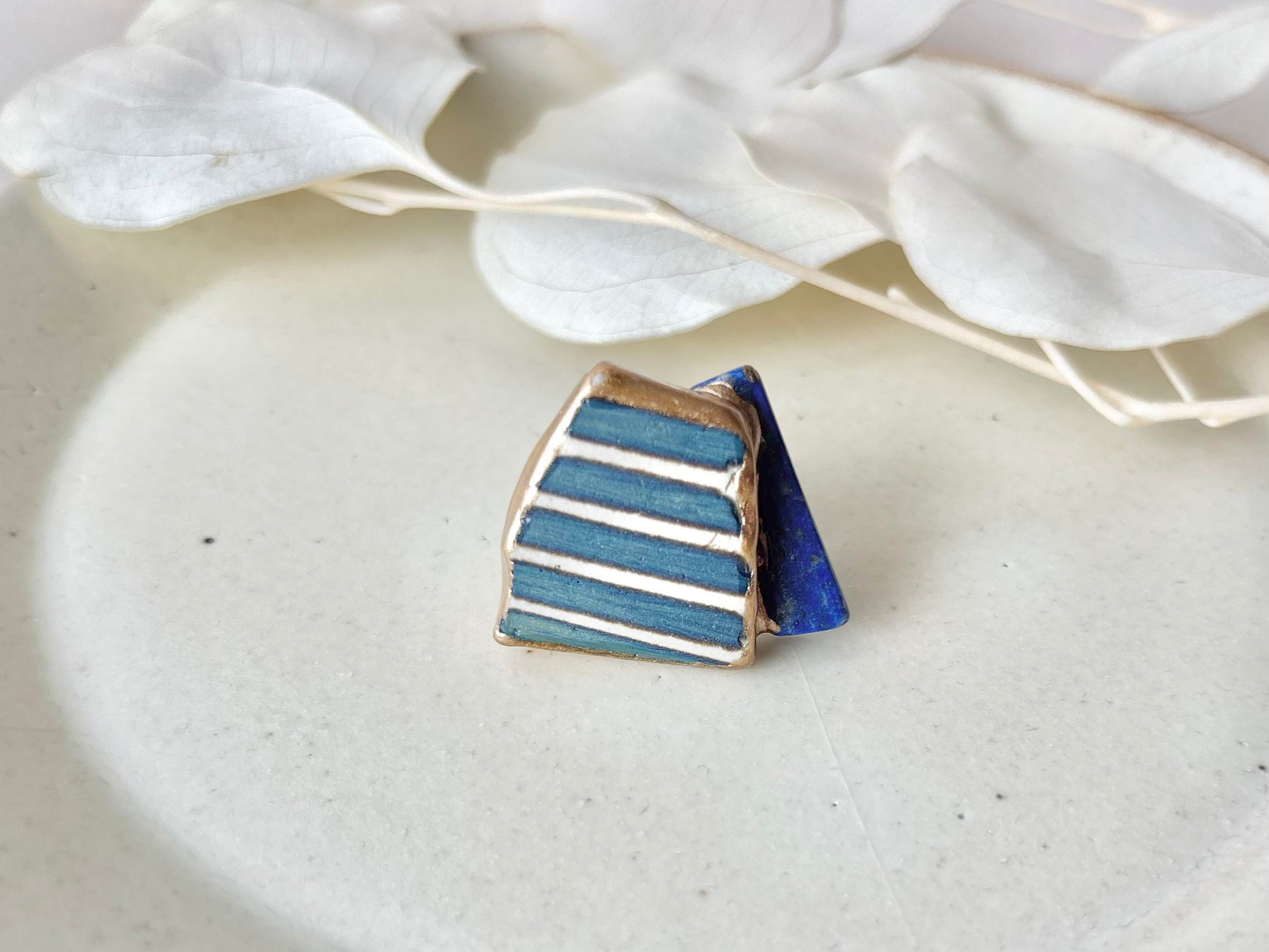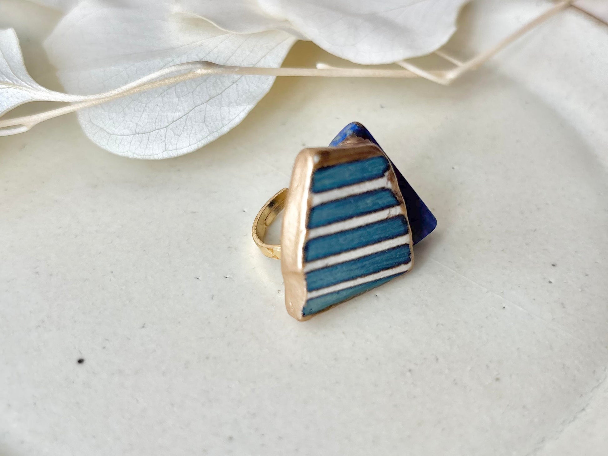 シー陶器 金継ぎ リング ステンレス 18Kコーティング フリーサイズ 青 ボーダー柄 ソーダライト 淡水パール 天然石 伝統工芸 #464