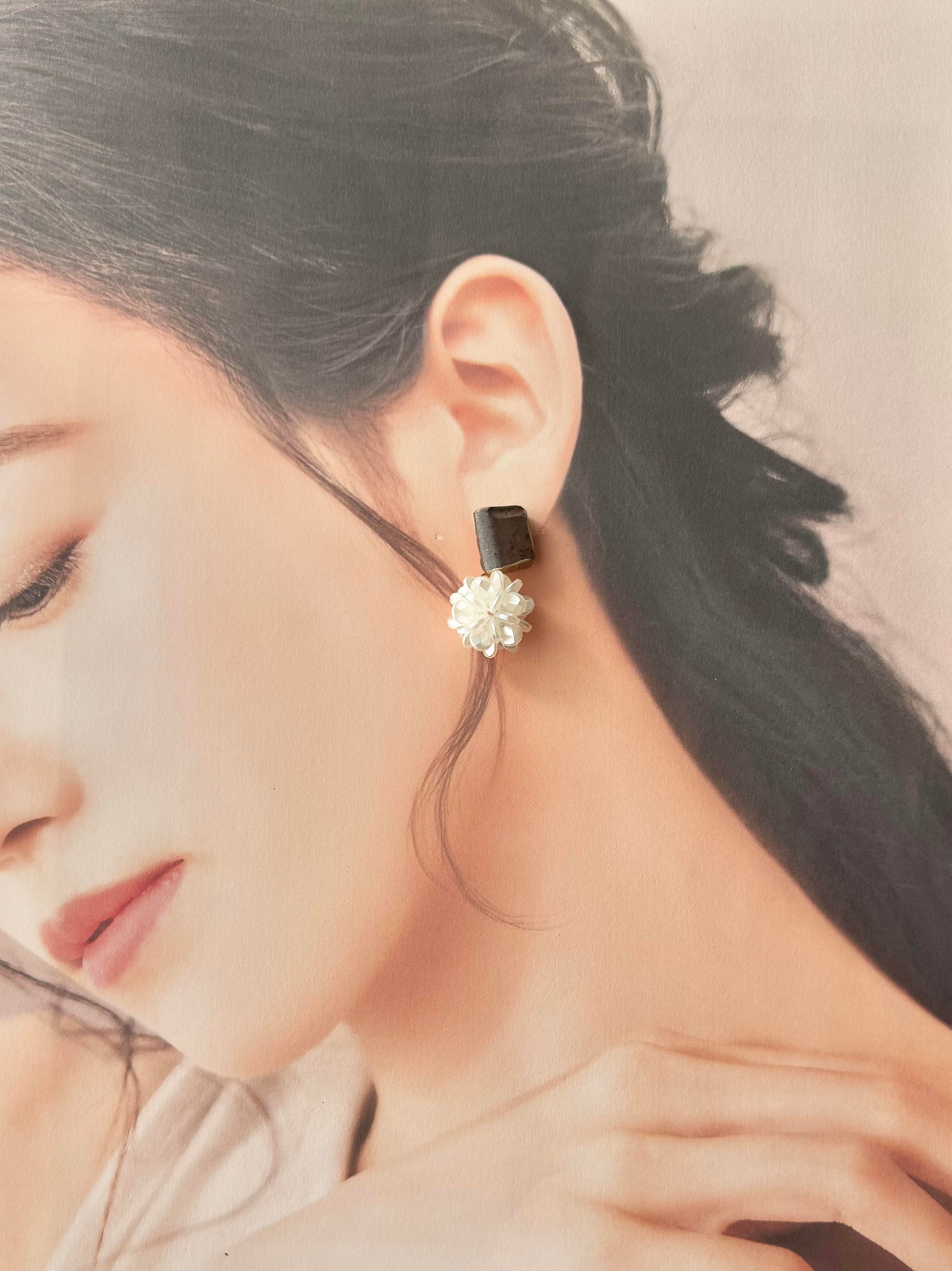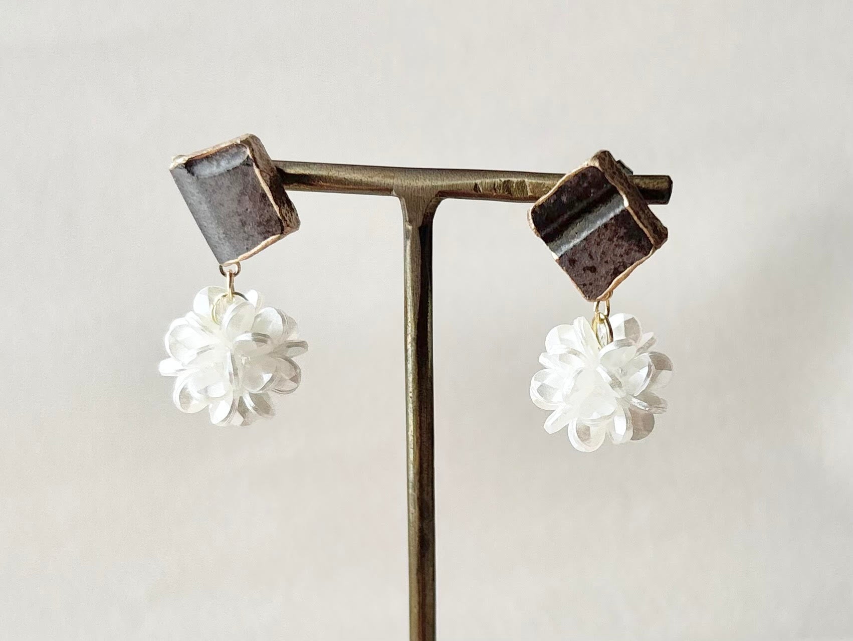 深みのある茶色の陶片に華やかなフラワーボールのパーツを合わせました。