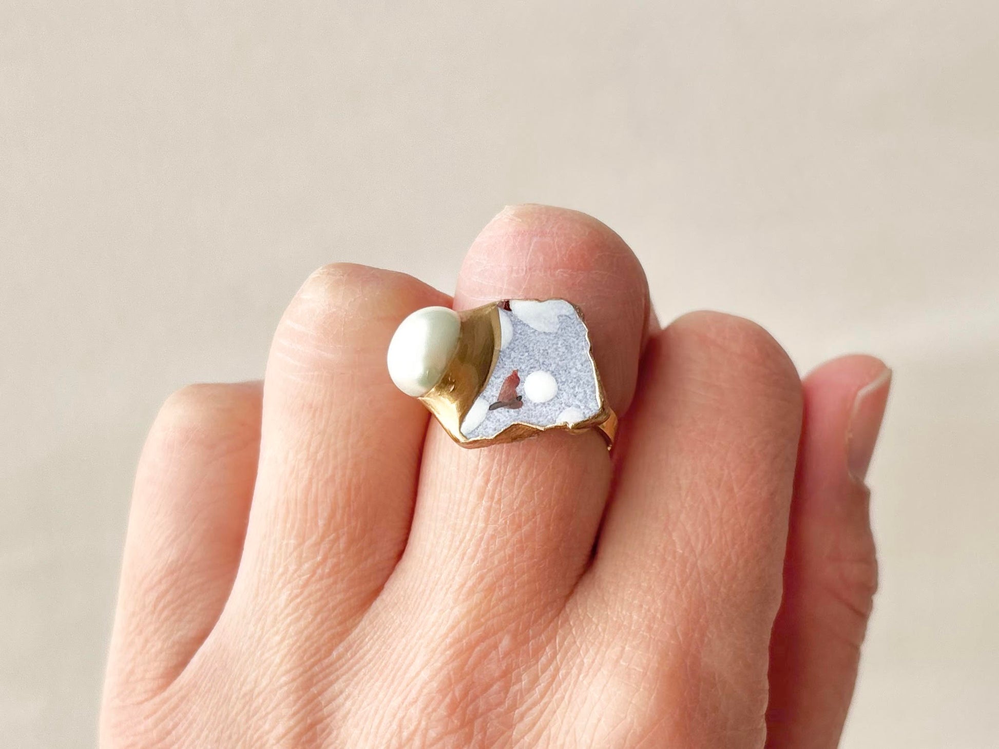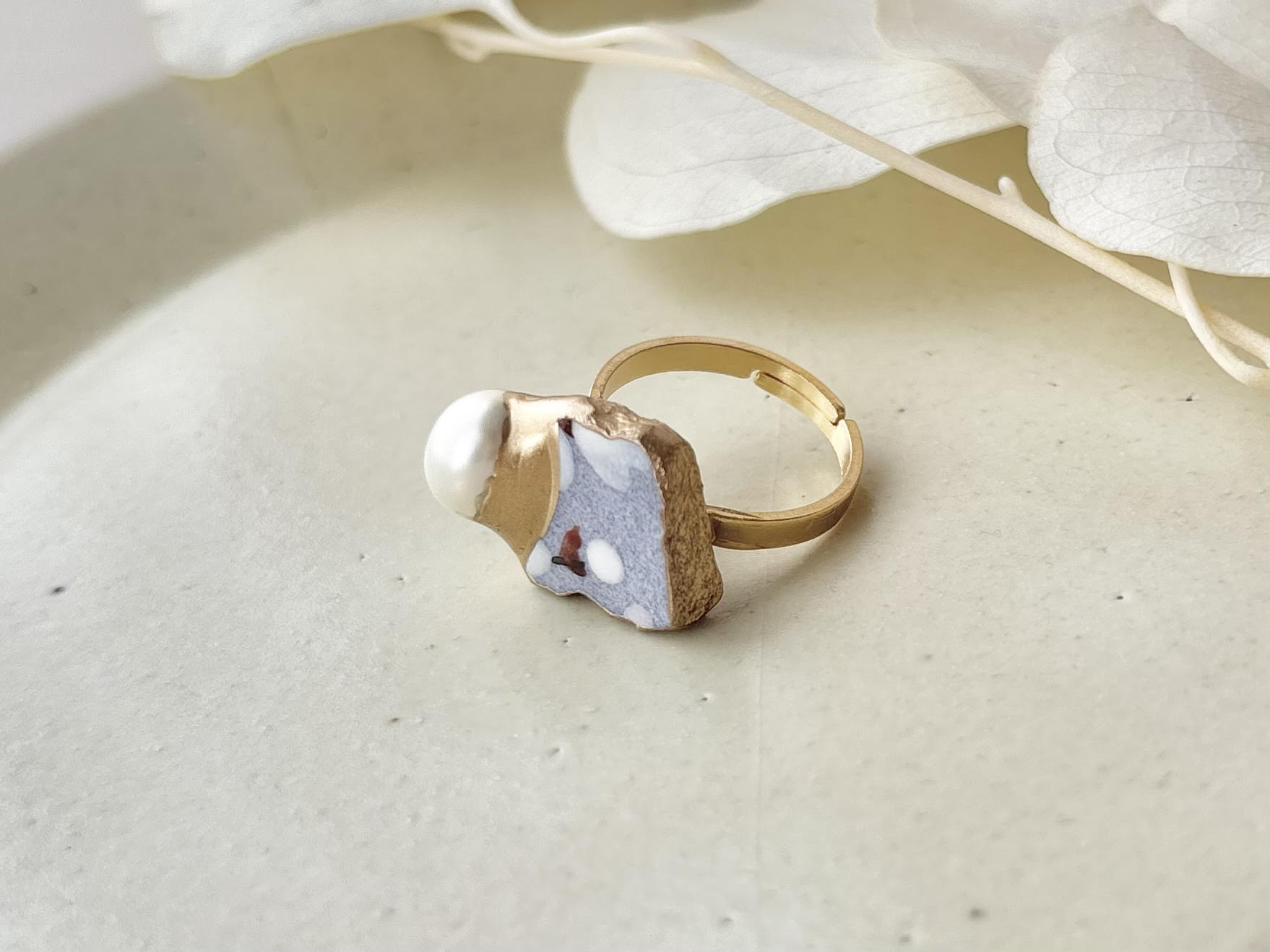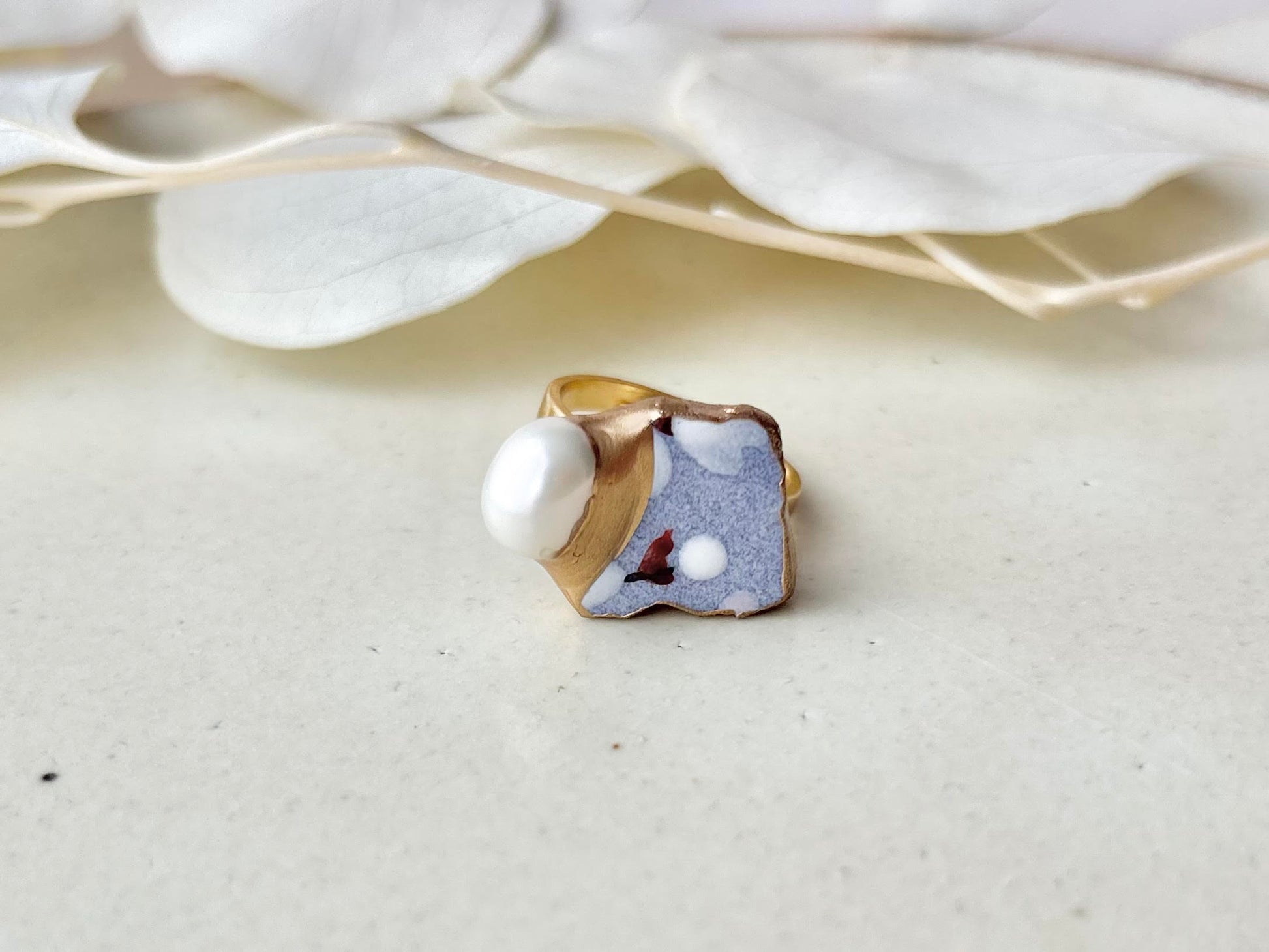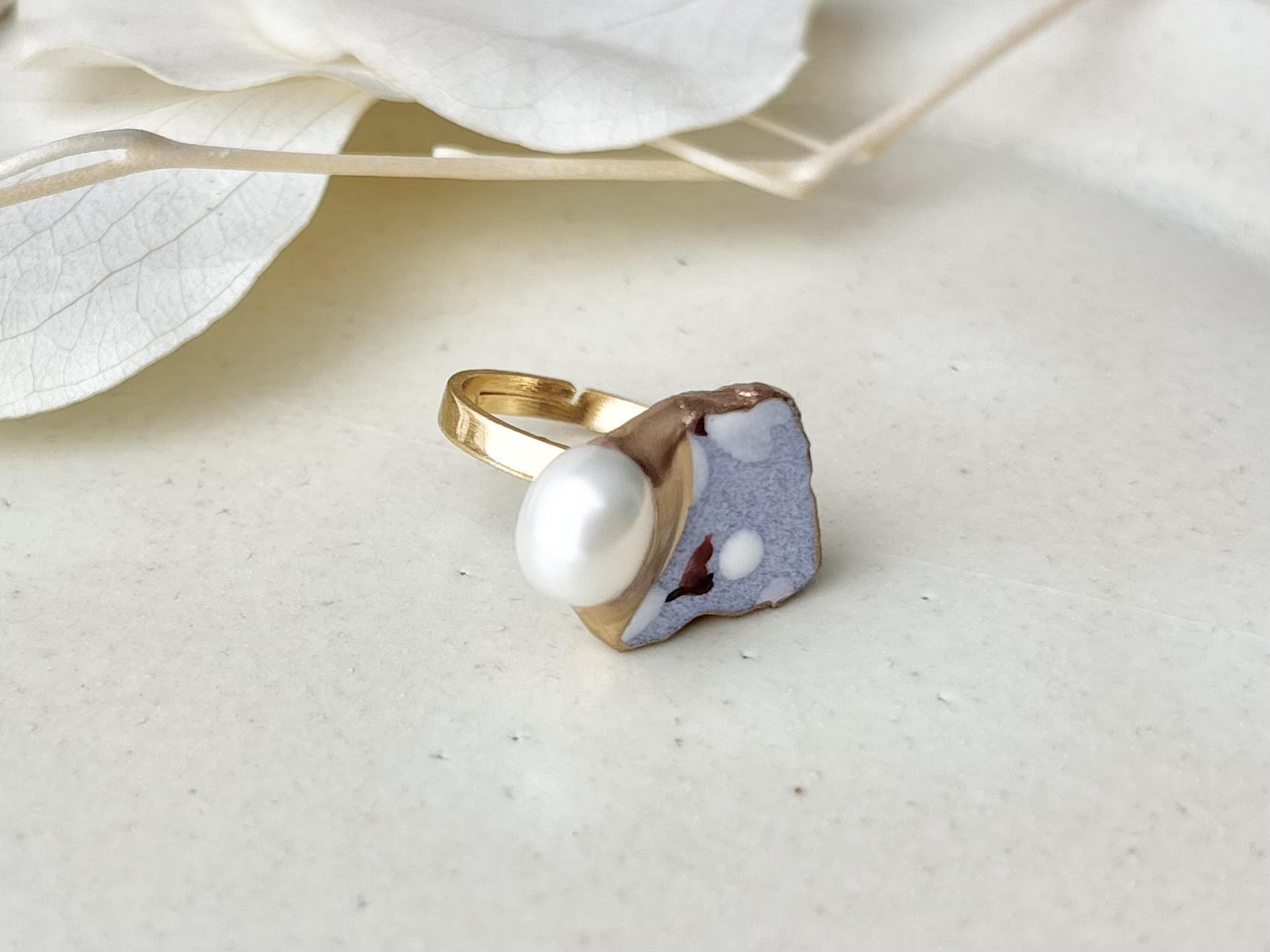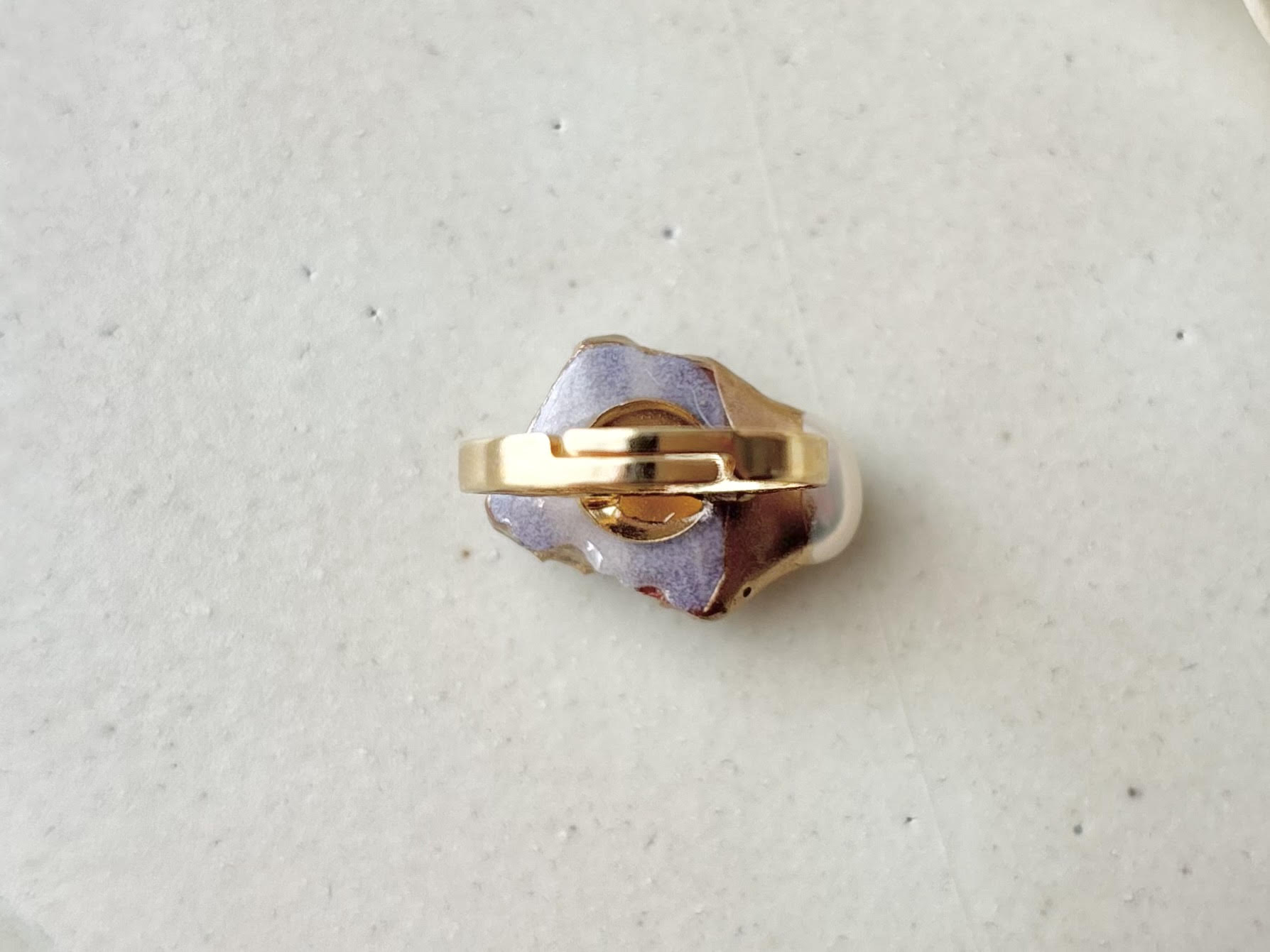 京焼 金継ぎ リング ステンレス 18Kコーティング フリーサイズ 紫 手書き 絵付け 淡水パール 天然石 伝統工芸 #455