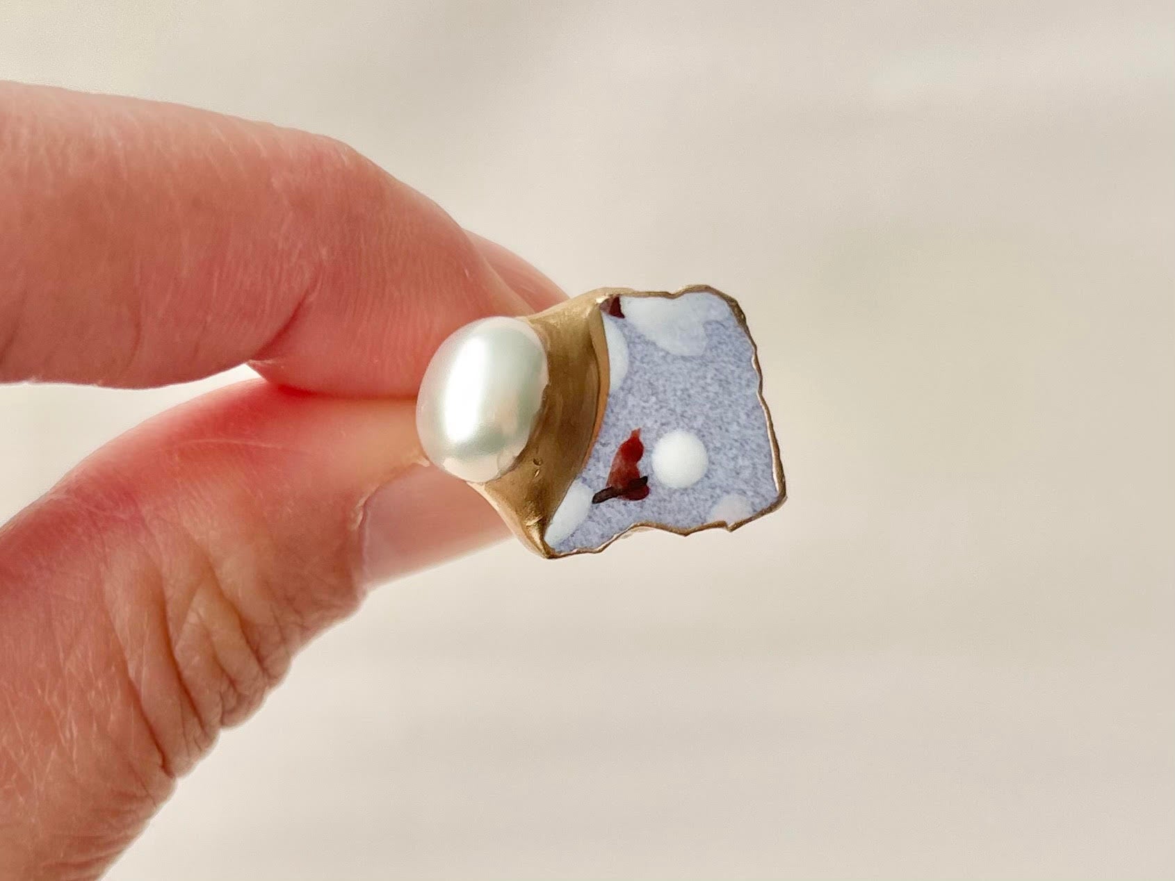 手書きの絵付けがされた上品な紫の陶片に淡水パールを合わせました。