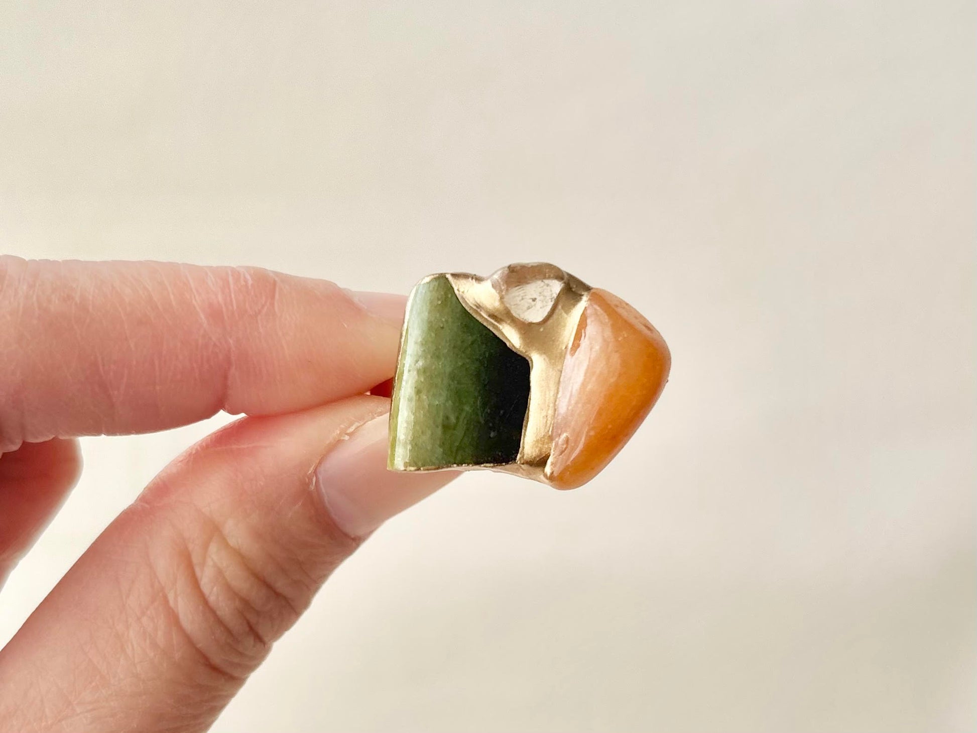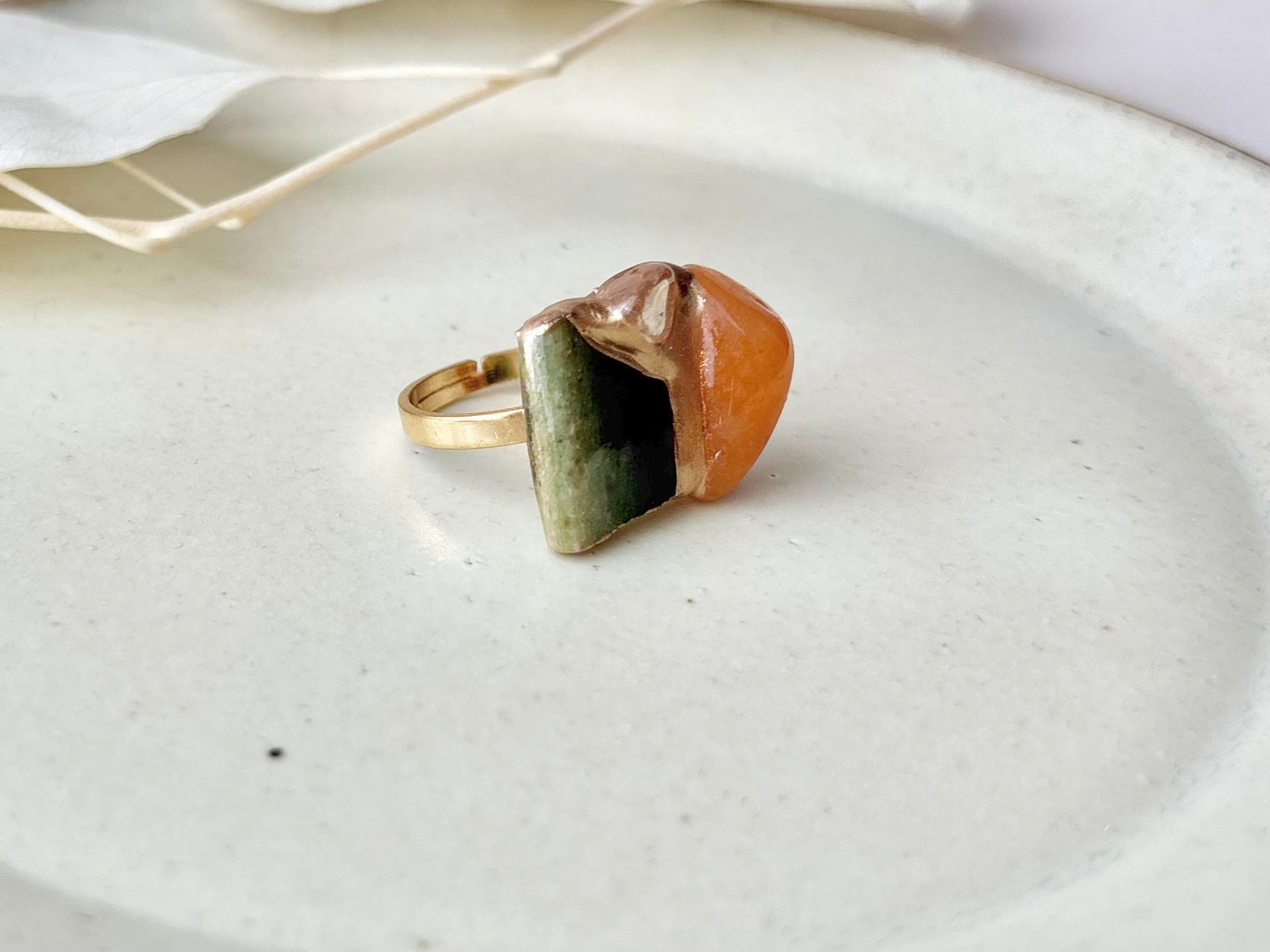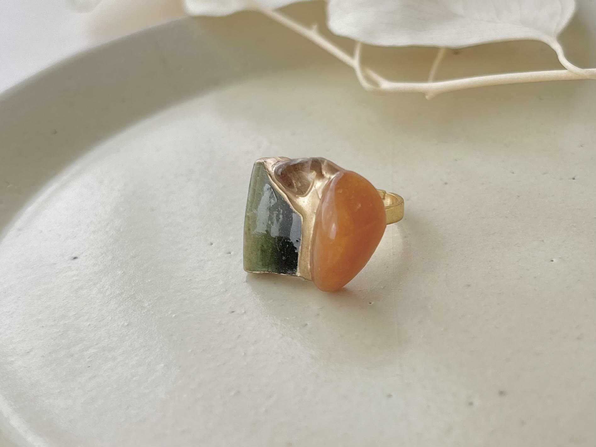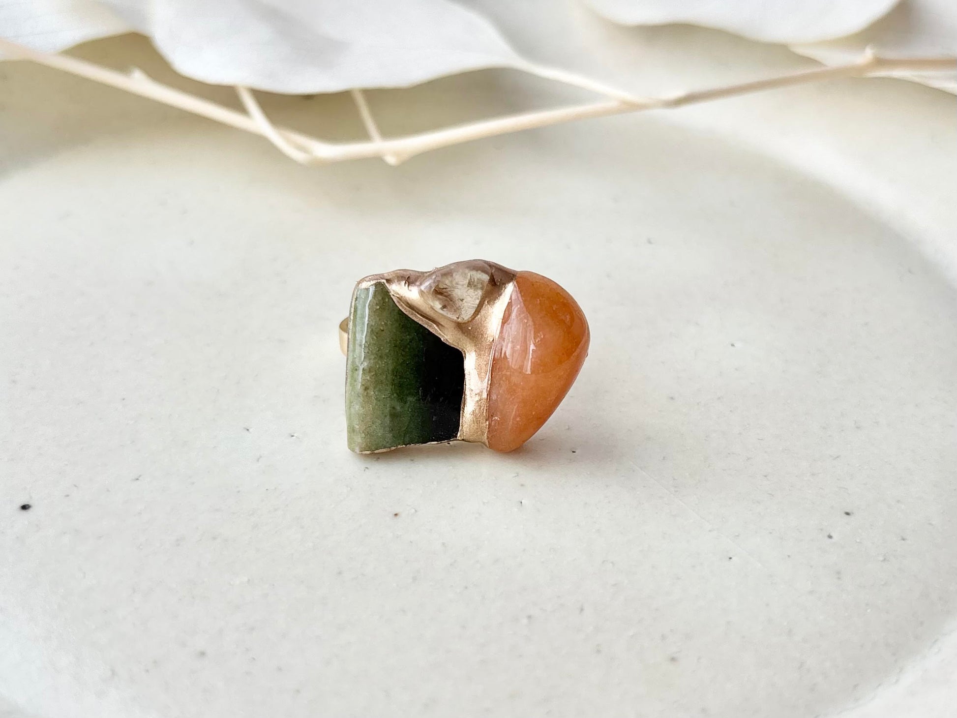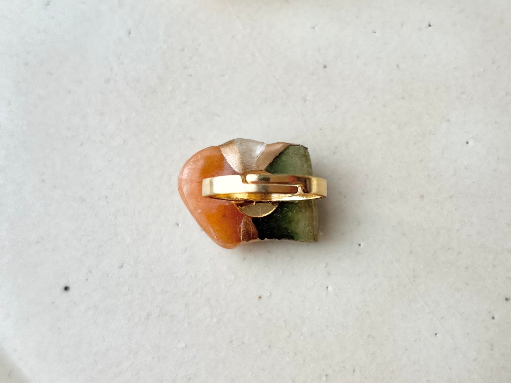 織部焼 金継ぎ リング ステンレス 18Kコーティング フリーサイズ 緑色 オレンジアベンチュリン ゴールドルチルクォーツ 天然石 伝統工芸 #454